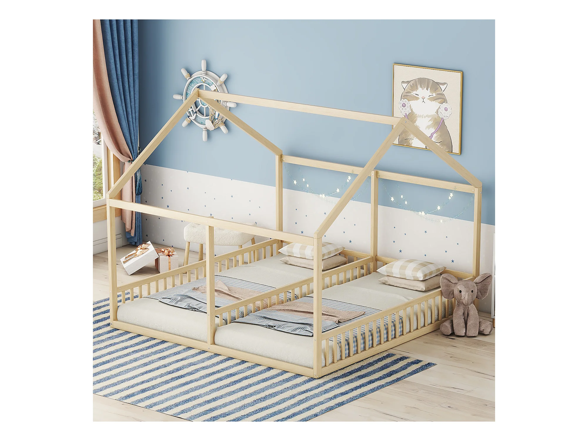 Lit cabane 90x200 cm naturel 2-en-1, style maison, bois massif, design simple et chaleureux pour enfants