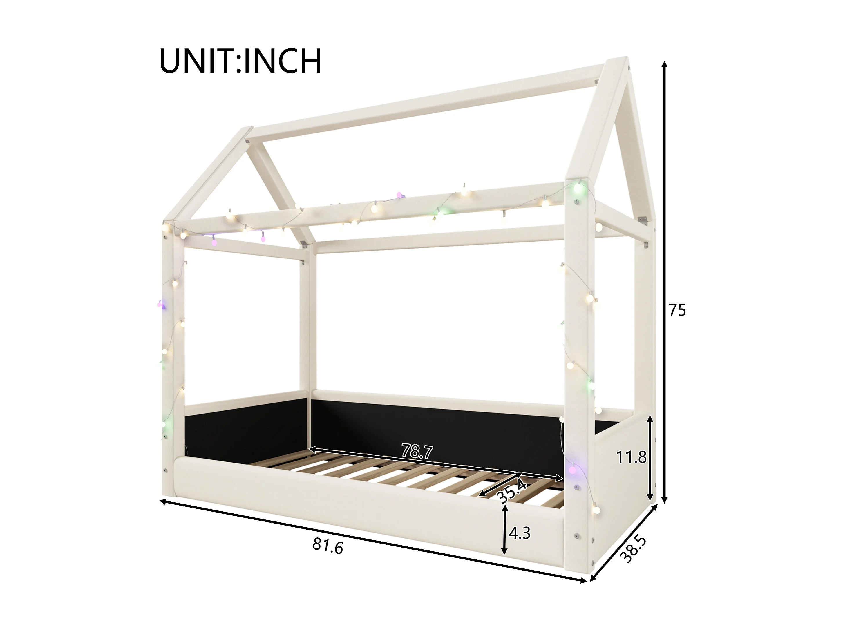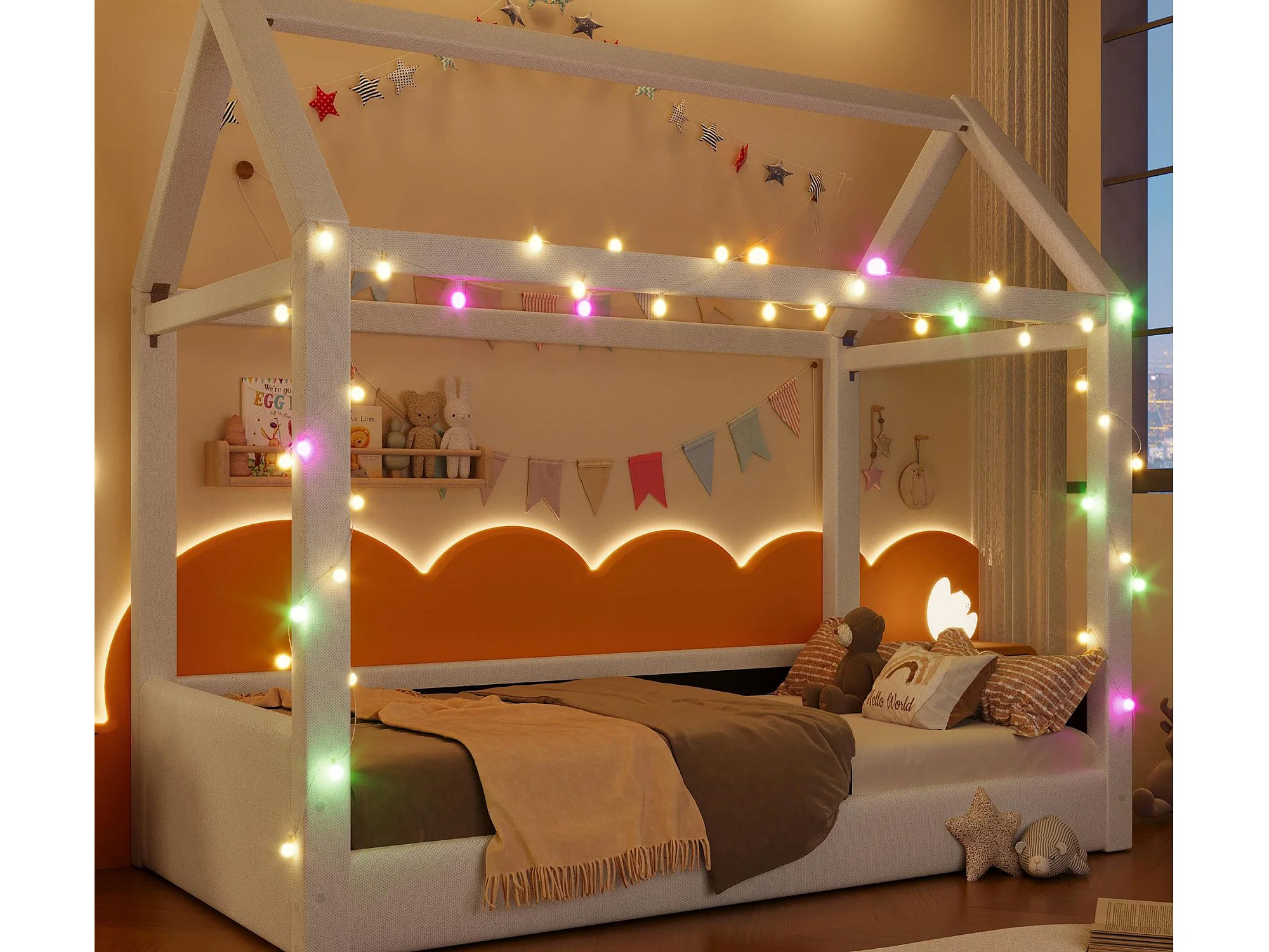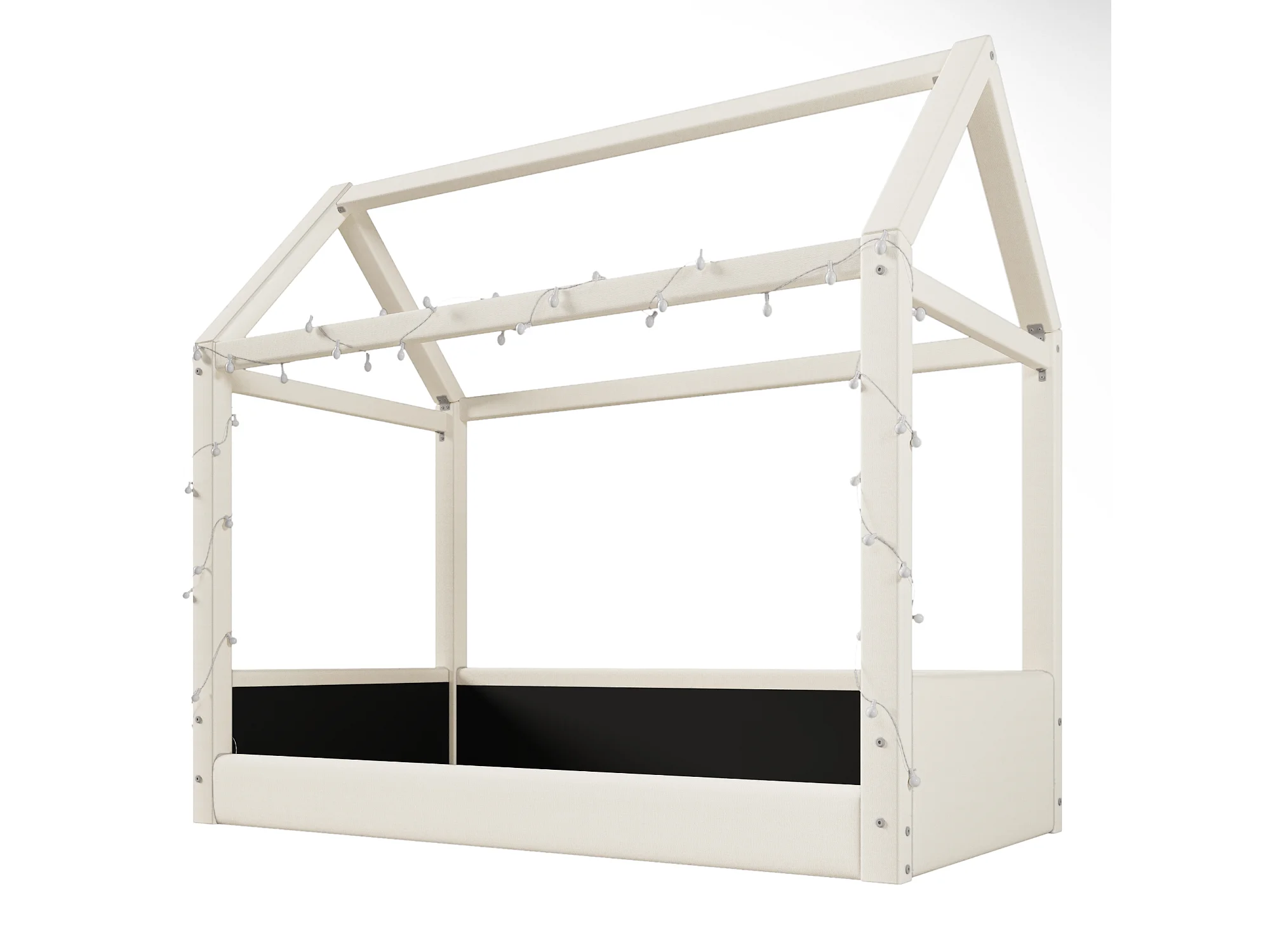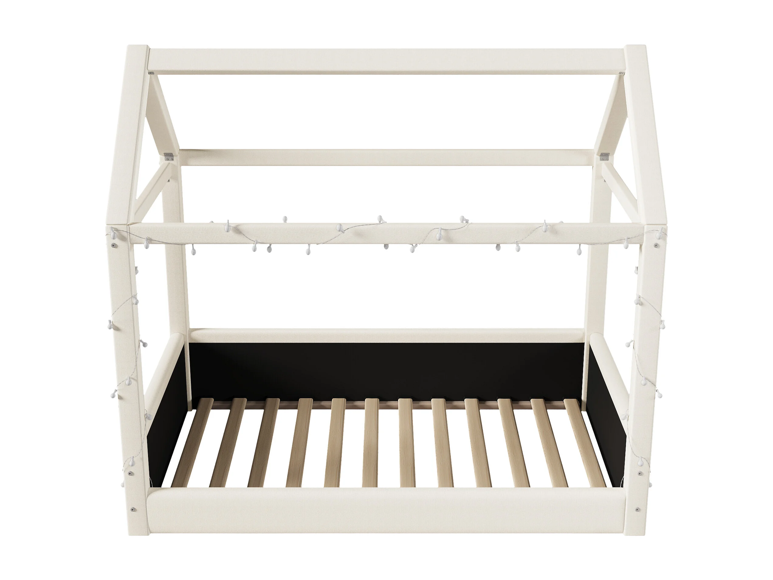 Lit cabane 90x200cm - avec bande lumineuse LED - Design toit - MDF - Beige (matelas non inclus)
