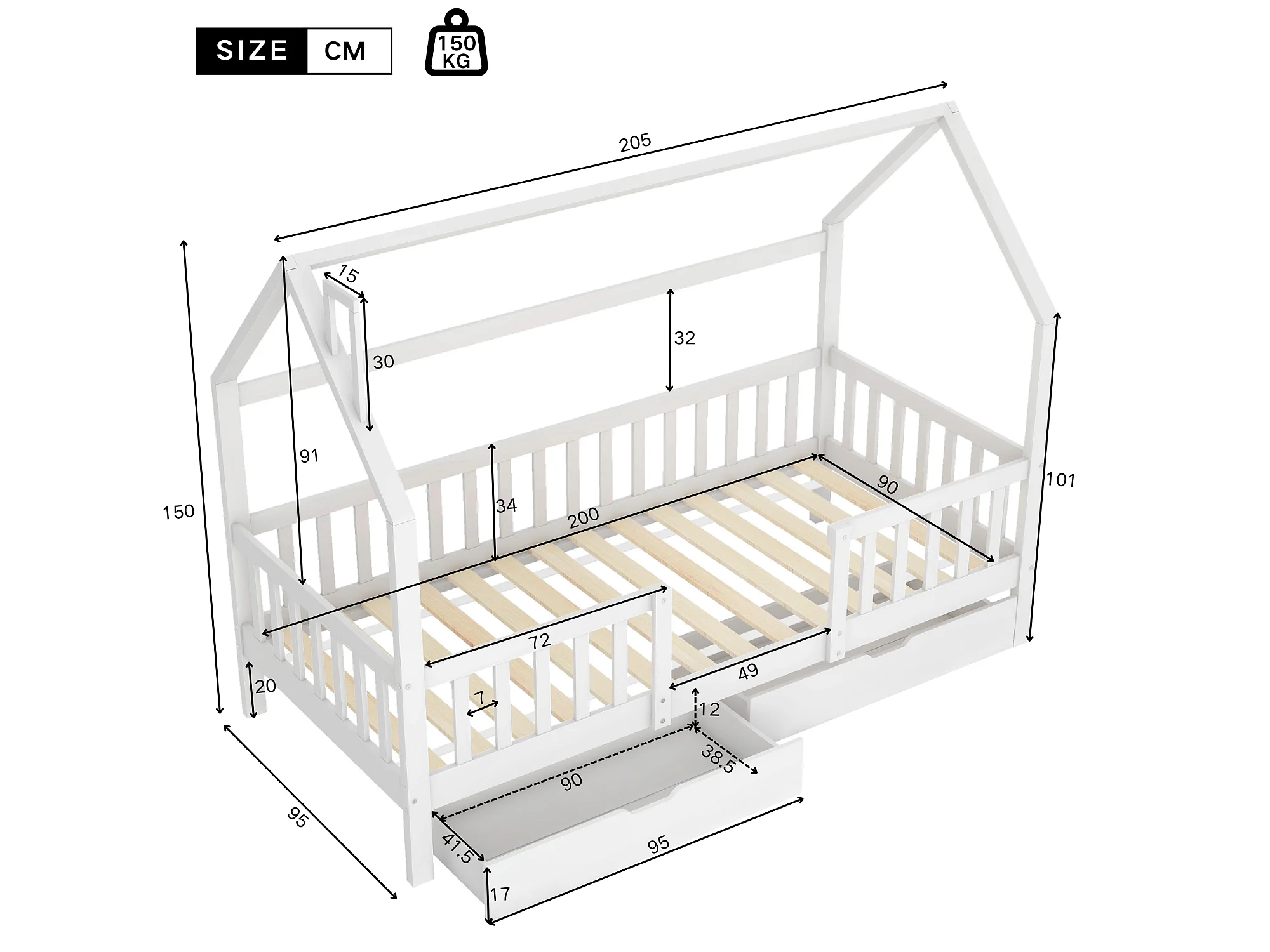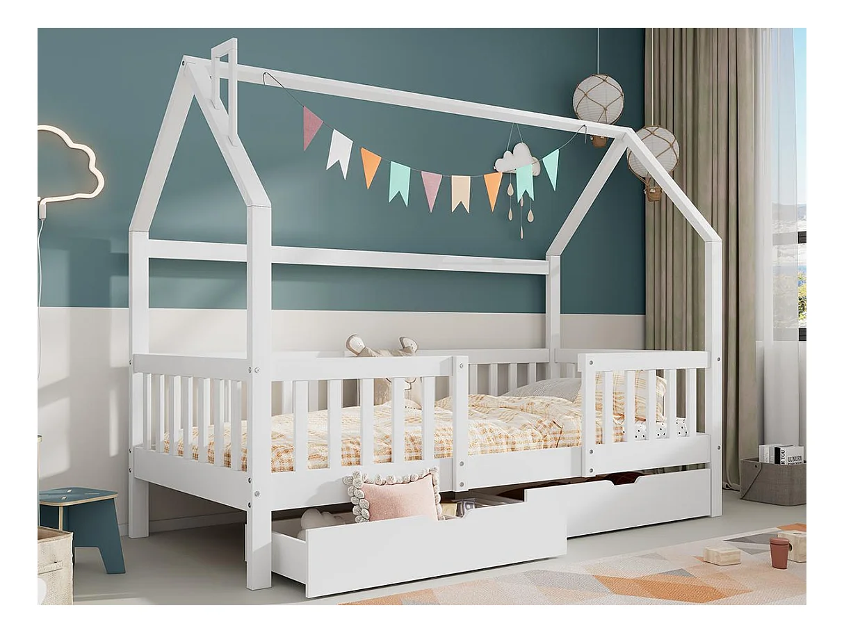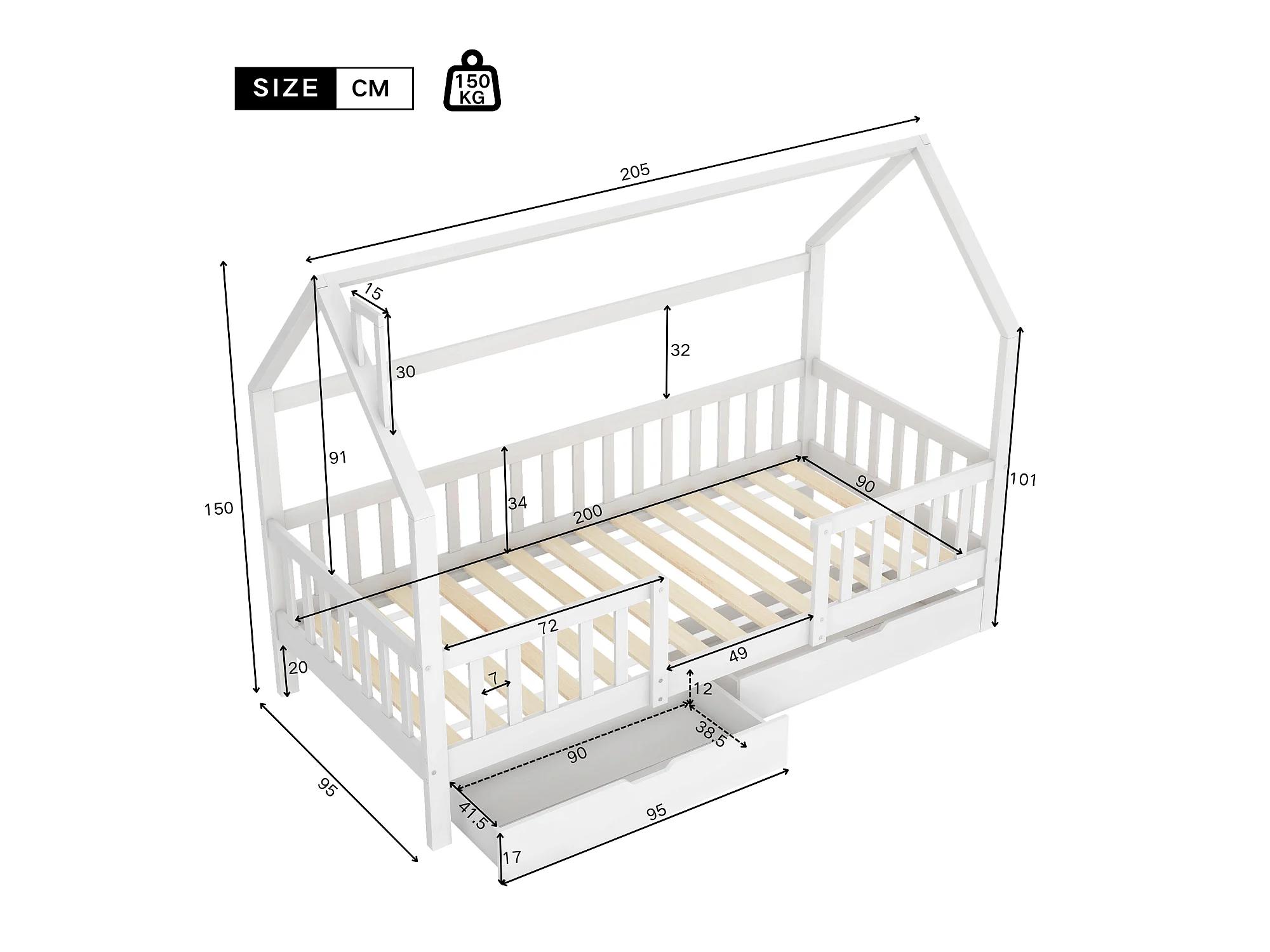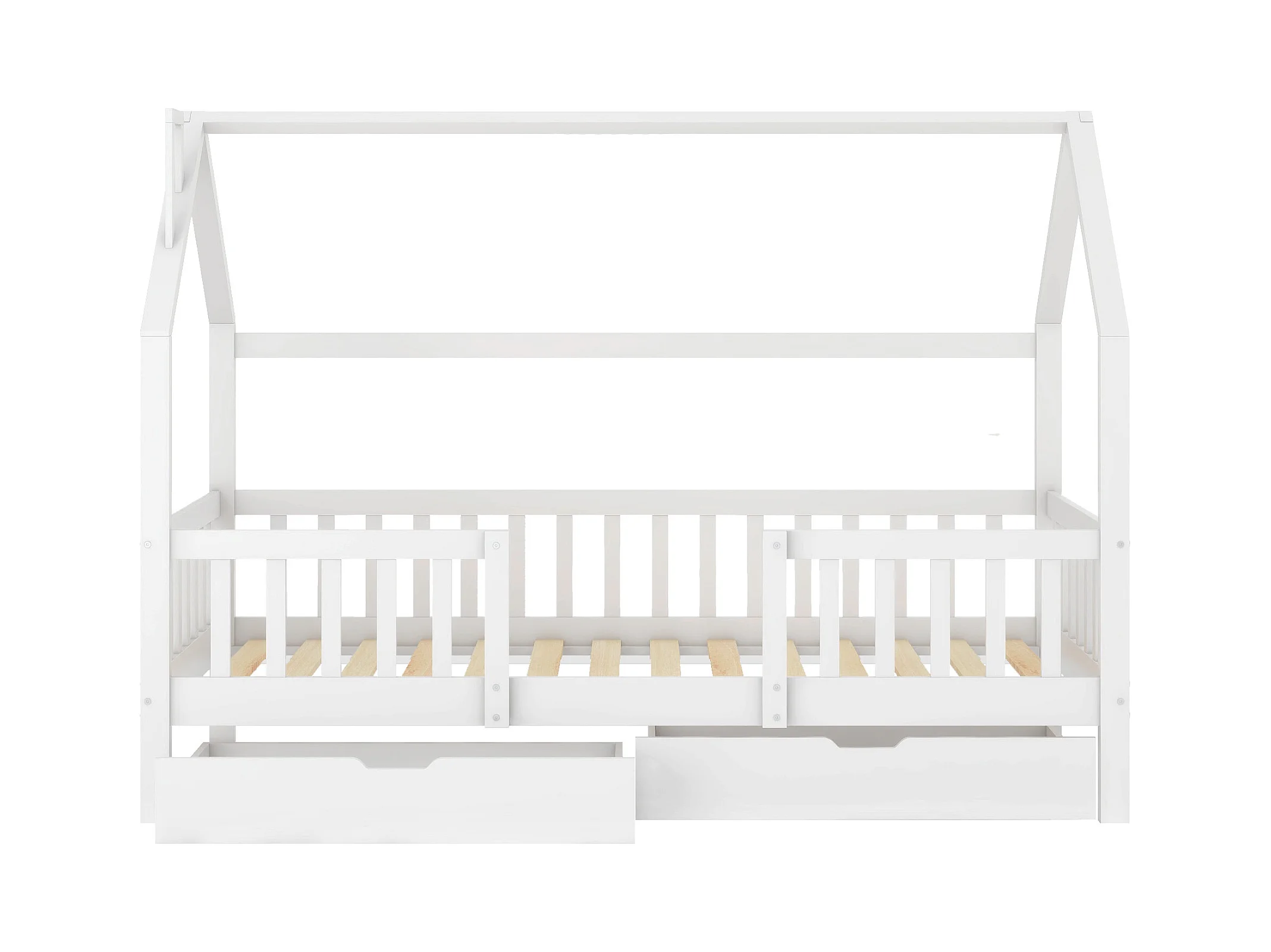 Lit cabane en bois - 90x200 cm - avec 2 tiroirs et sommiers à lattes - Blanc