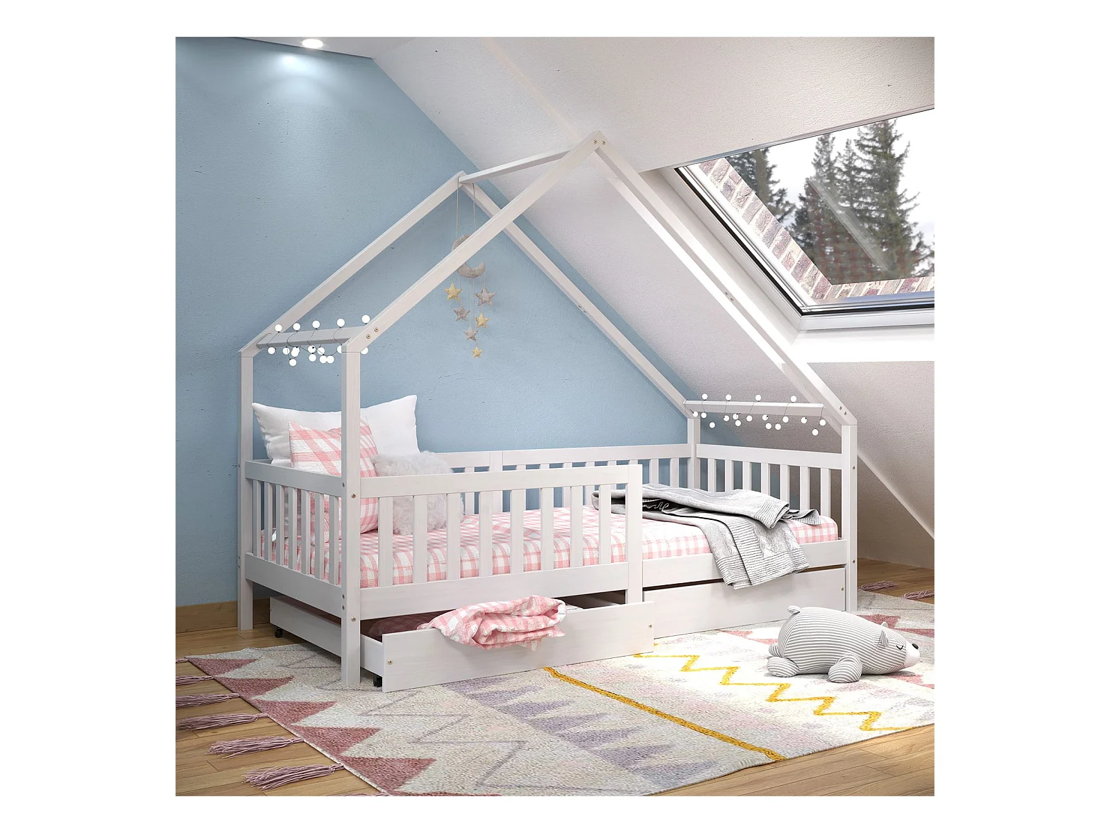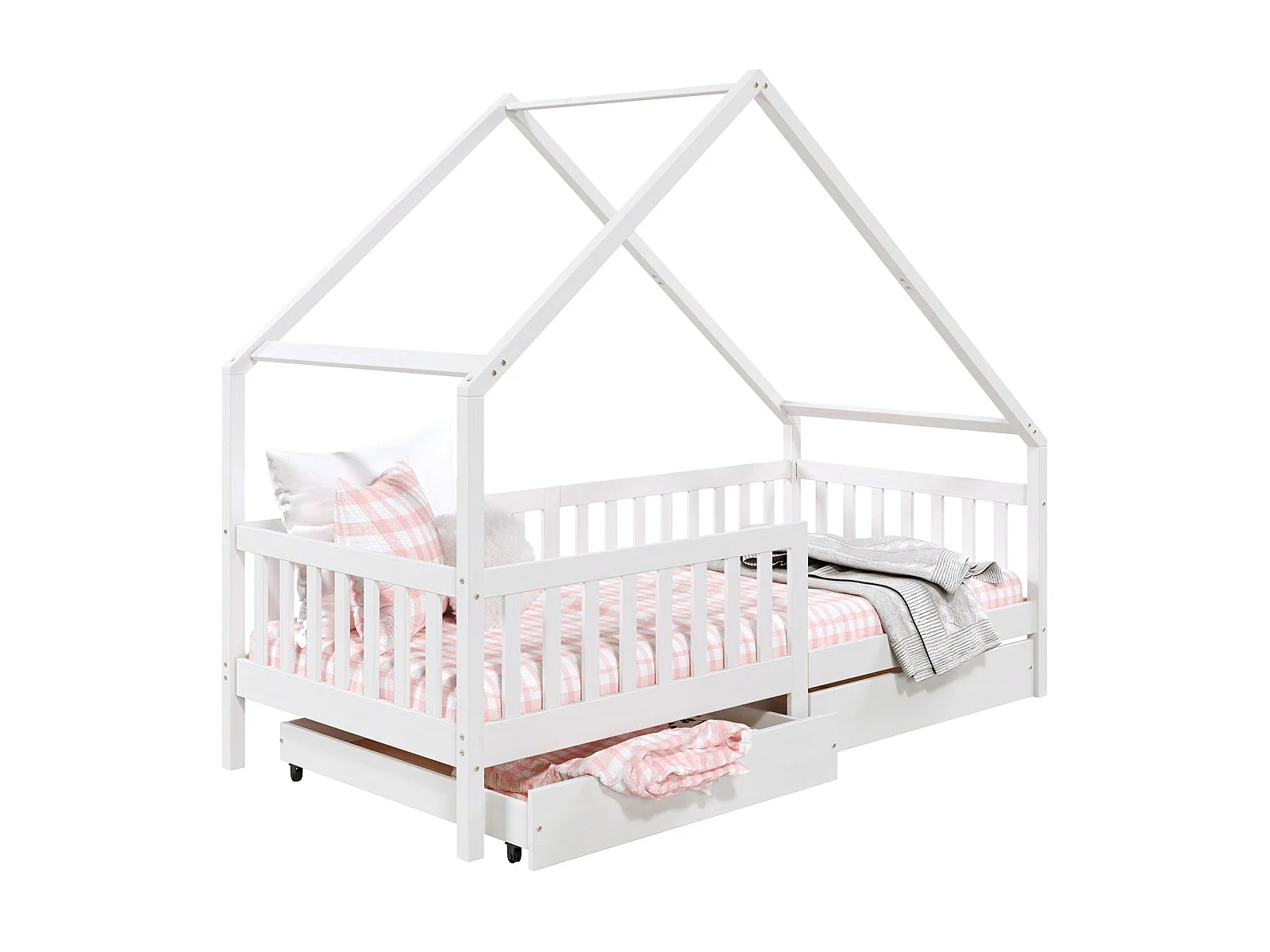 Lit cabane ALVA lit enfant simple asymétrique en bois 90 x 200 cm montessori, avec rangement 2 tiroirs, en pin massif lasuré blanc