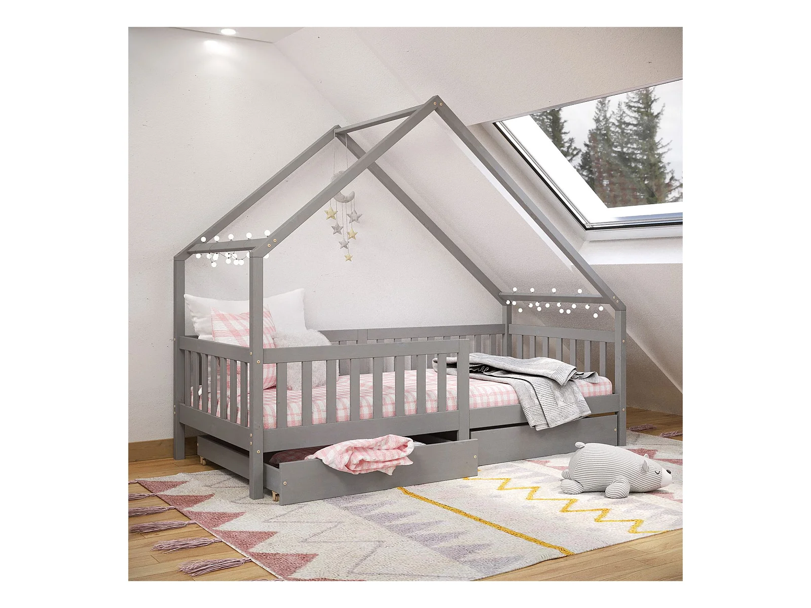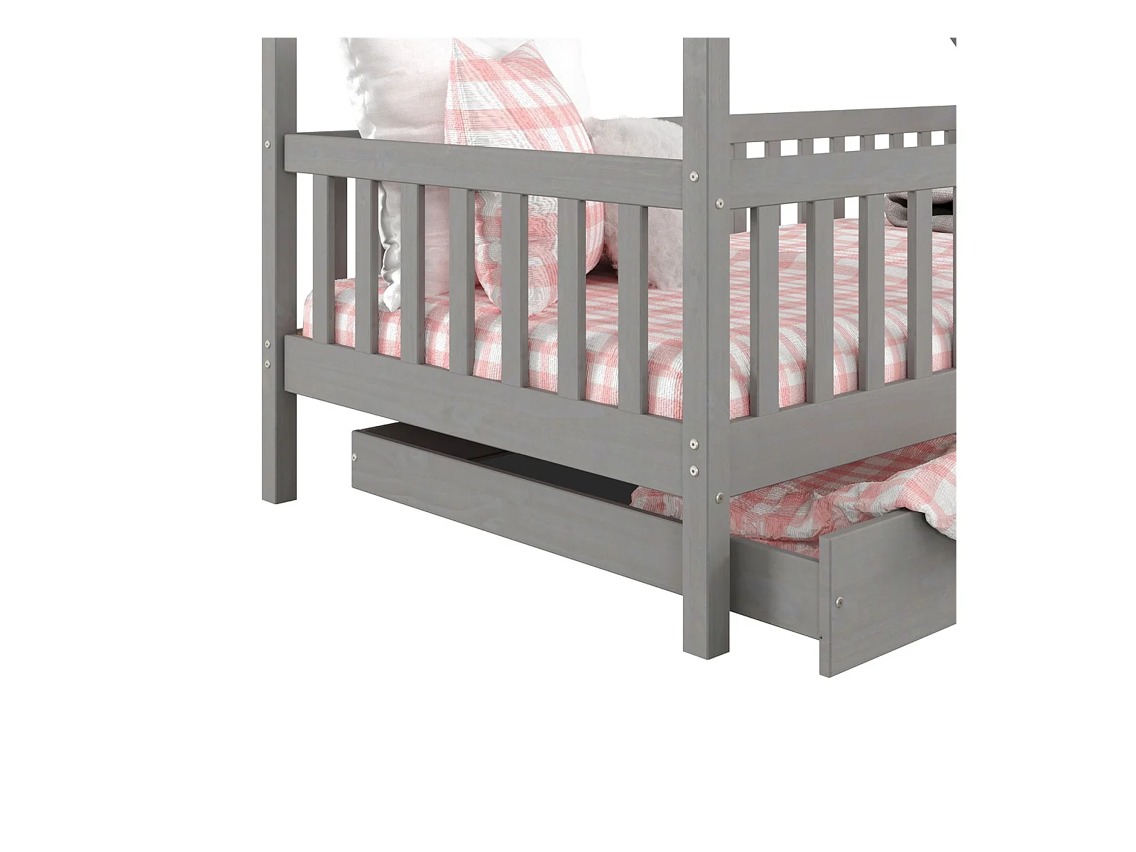 Lit cabane ALVA lit enfant simple asymétrique en bois 90 x 200 cm montessori, avec rangement 2 tiroirs, en pin massif lasuré gris
