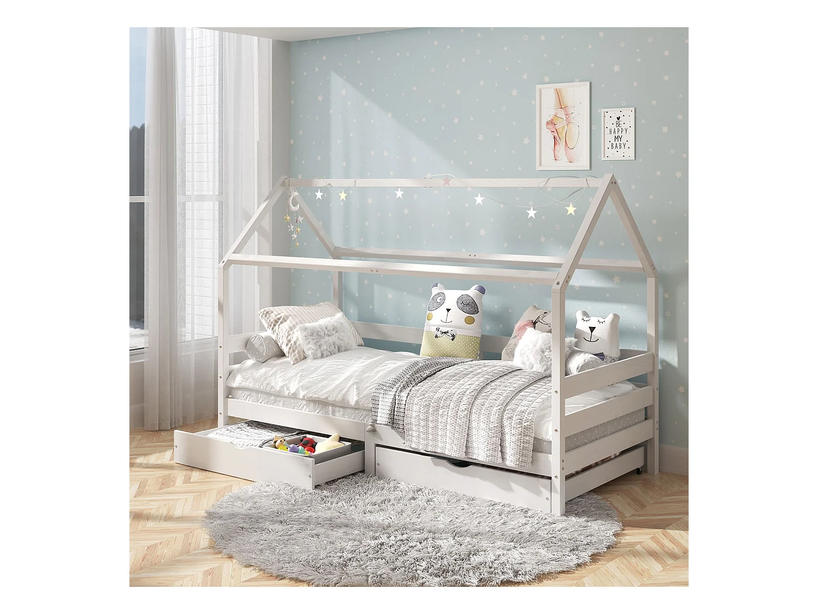 Lit cabane CLIA lit simple pour enfant montessori 90 x 200 cm avec rangement 2 tiroirs et barrières sur 3 côtés, pin massif blanc