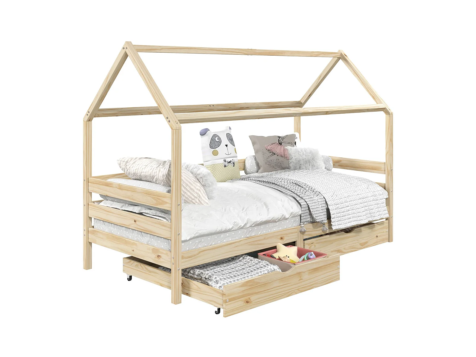 Lit cabane CLIA lit simple pour enfant montessori 90 x 200 cm rangement 2 tiroirs et barrières sur 3 côtés, pin naturel