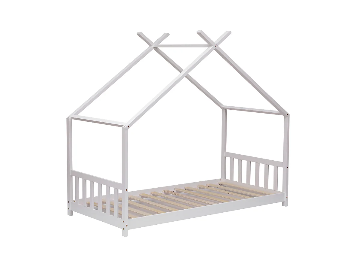 Lit cabane en pin massif 90x190 cm blanc avec 10 lattes en contreplaqué peuplier - modèle Nikita - montage rapide et facile