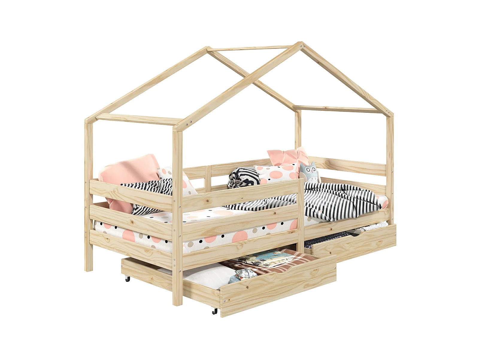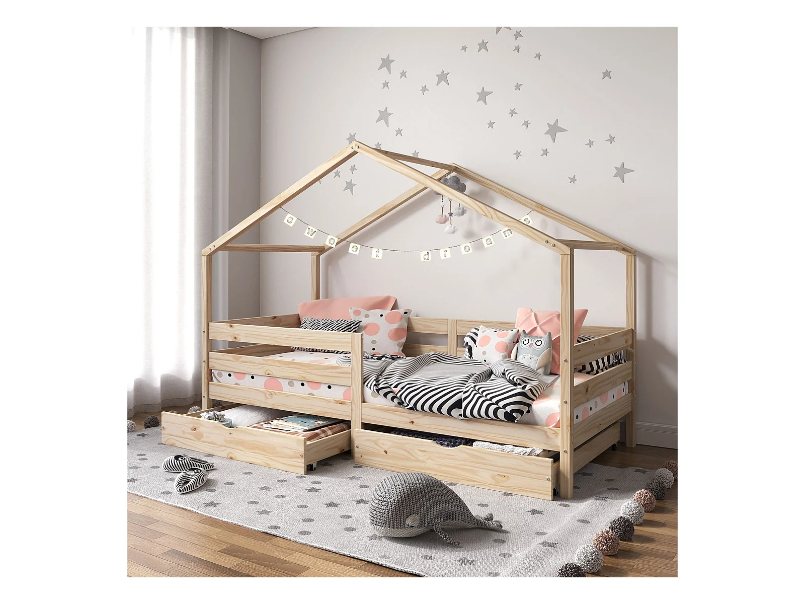 Lit cabane ENA lit enfant simple montessori 90 x 200 cm, avec 2 tiroirs de rangement, en pin massif à la finition naturelle