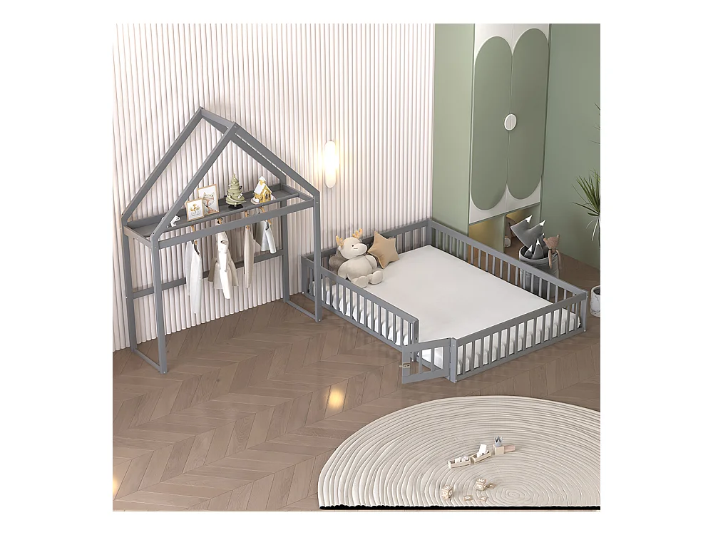 Lit cabane enfant 140 x 200 Cadre de lit en bois massif avec rangement Porte de sécurité complète Sommier à lattes Gris