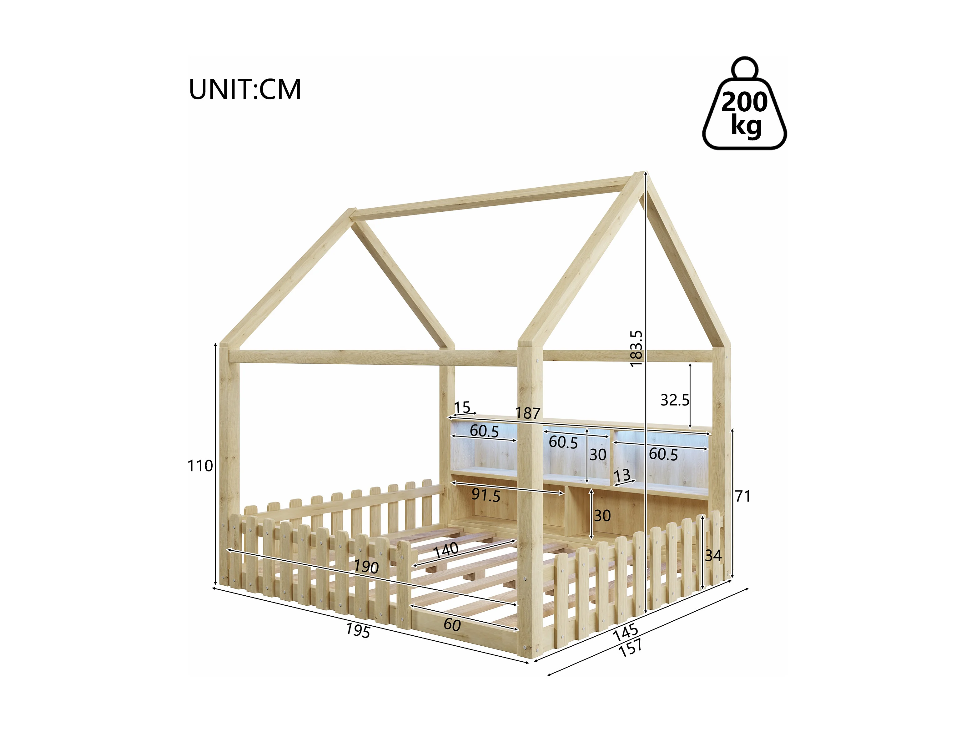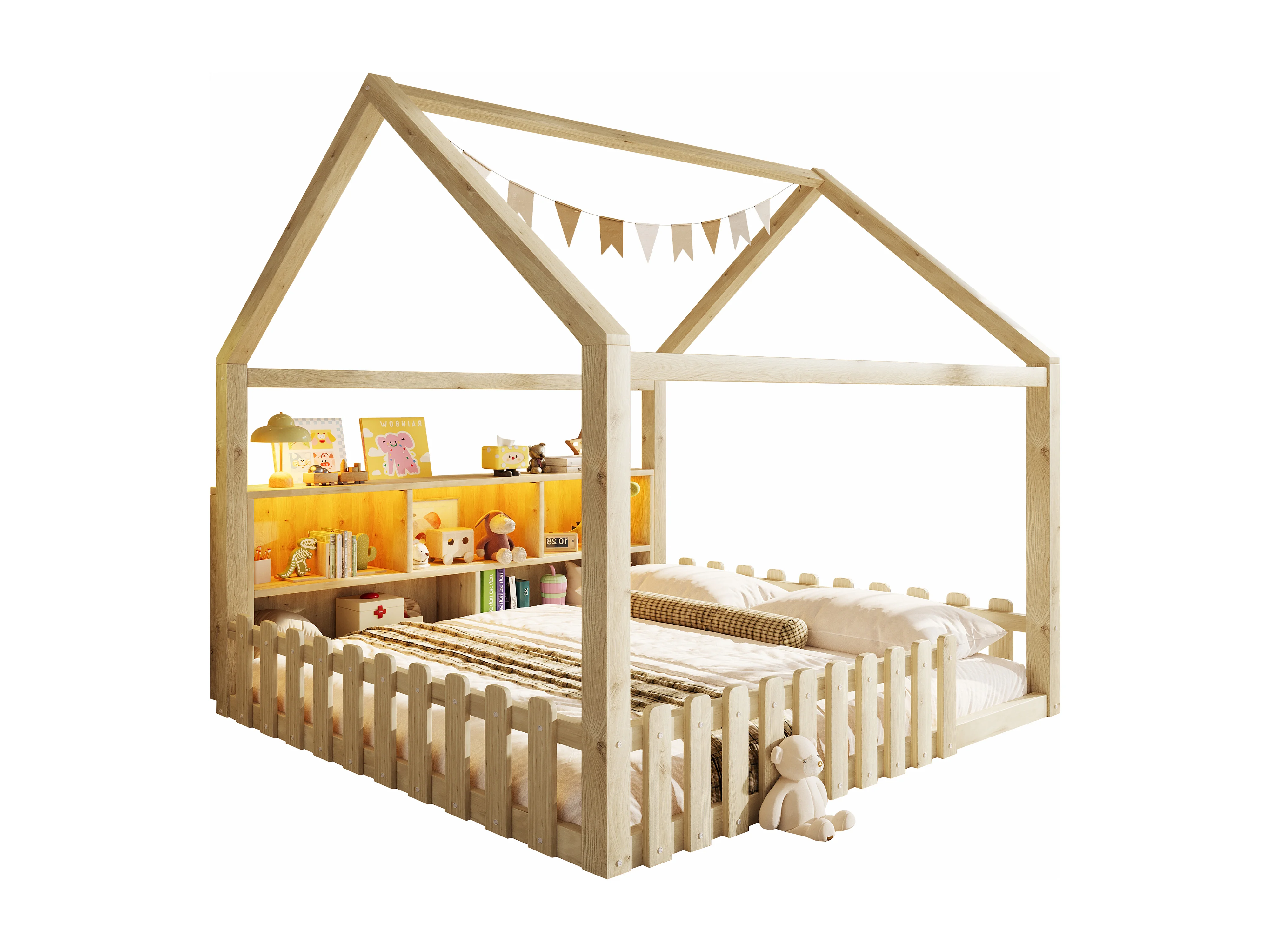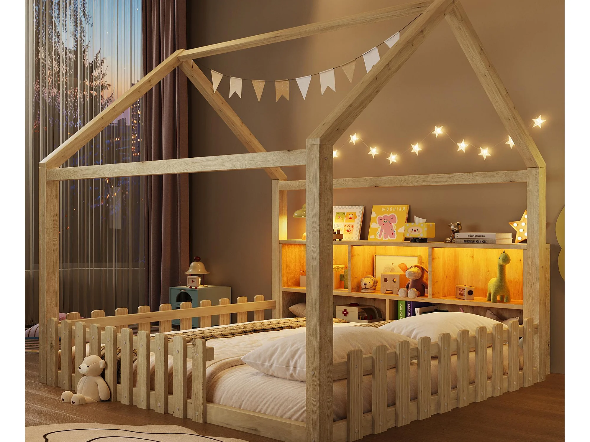 Lit cabane enfant 140x190 cm - avec barrières de sécurité - avec bande lumineuse LED - compartiments de rangement ouverts - naturel (matelas non inclus)