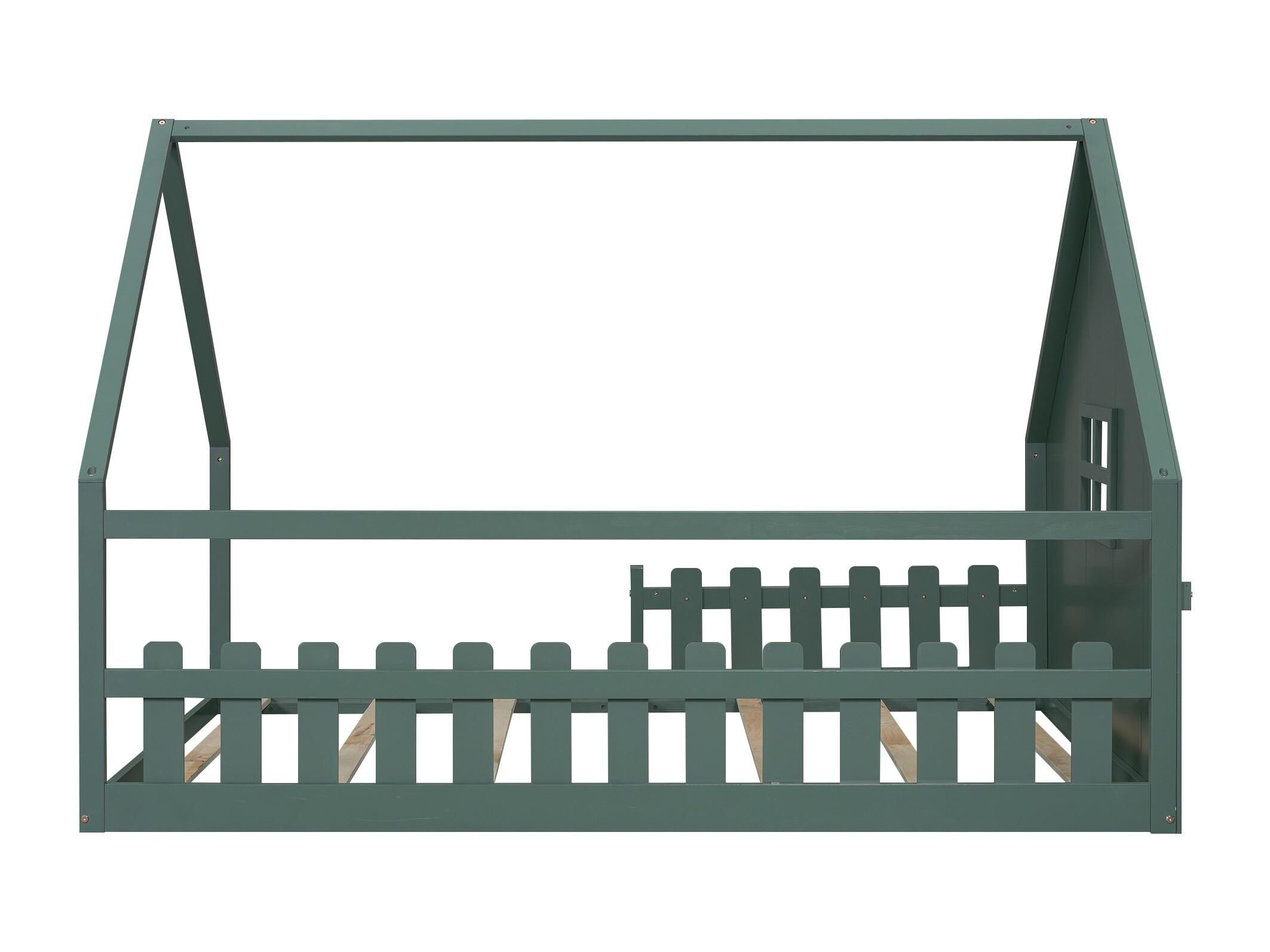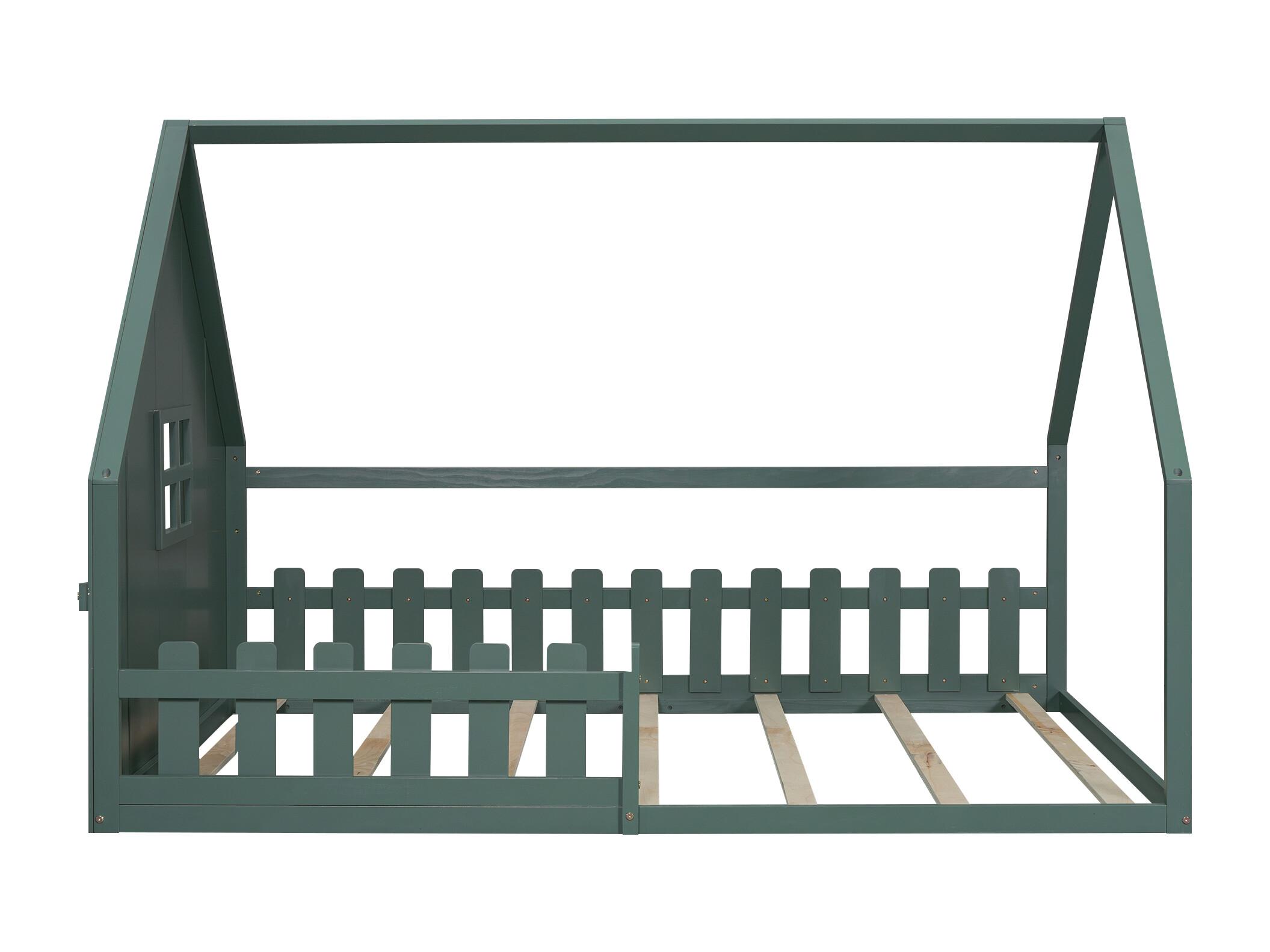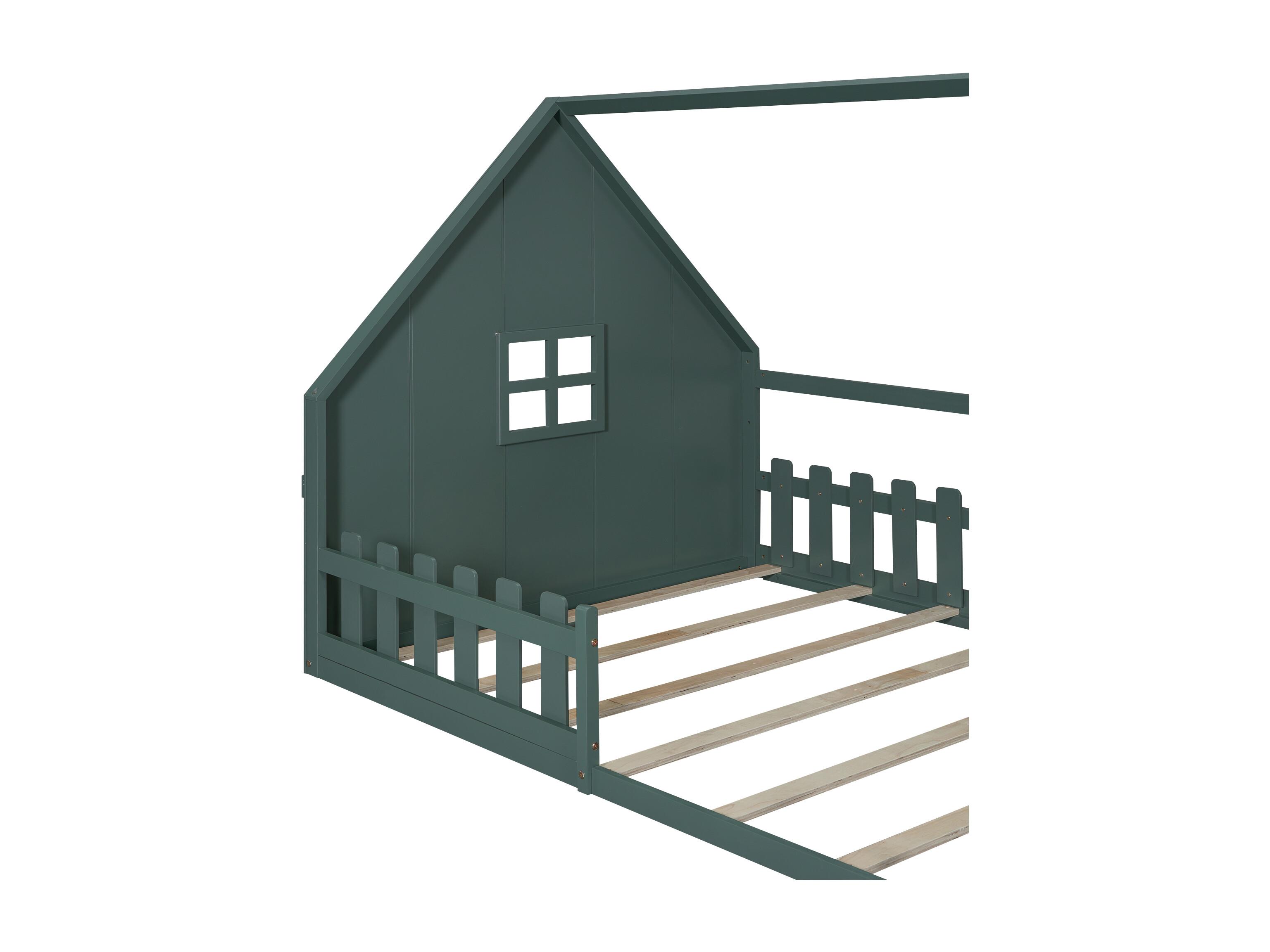 Lit cabane 140x200 cm avec sommier à lattes - avec barrière de protection - Pin - vert (sans matelas)