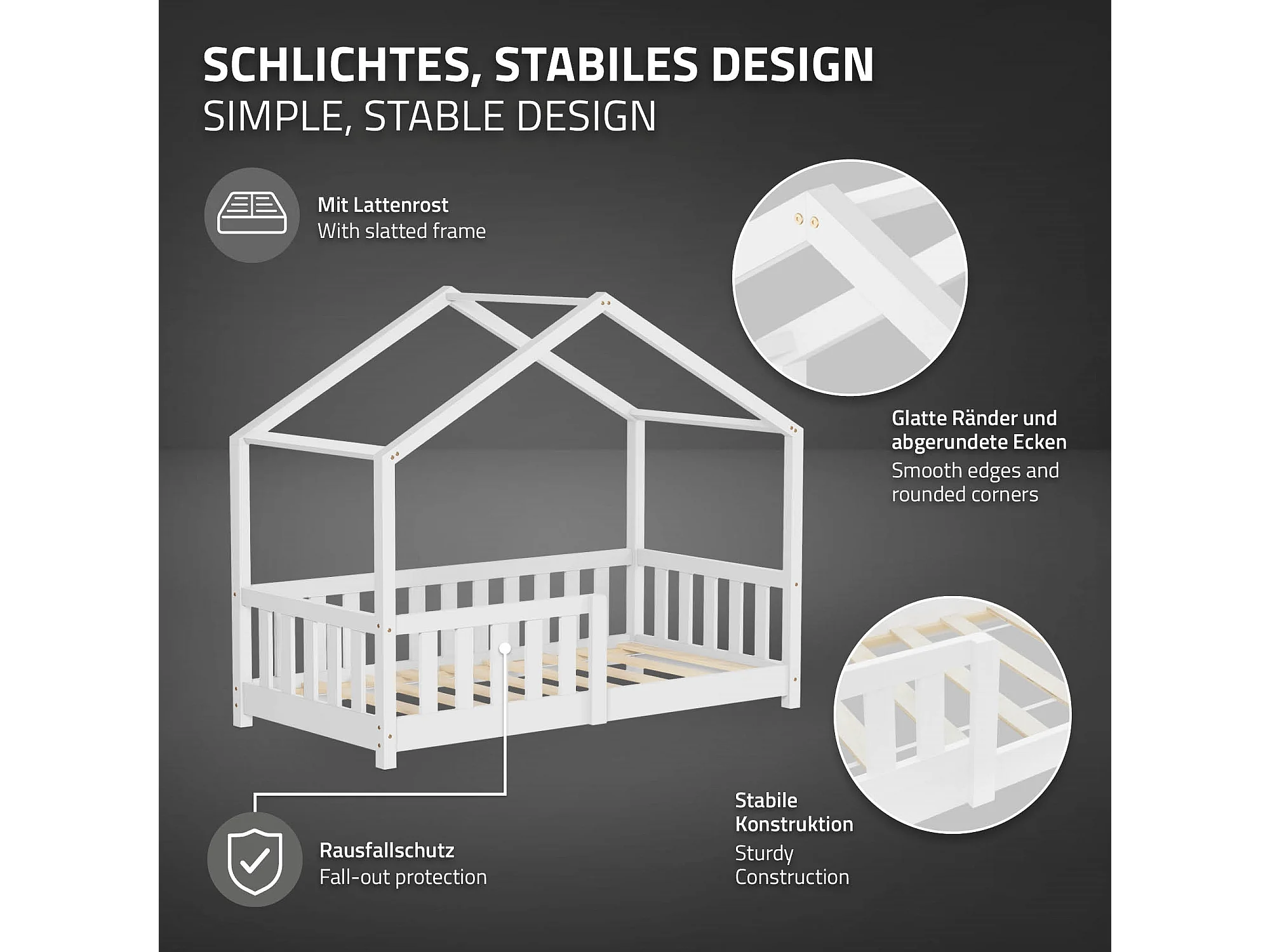 Lit cabane enfant 70x140 cm blanc en pin massif avec matelas, antichute, toit et sommier à lattes, couchage au sol Montessori pour fille garçon