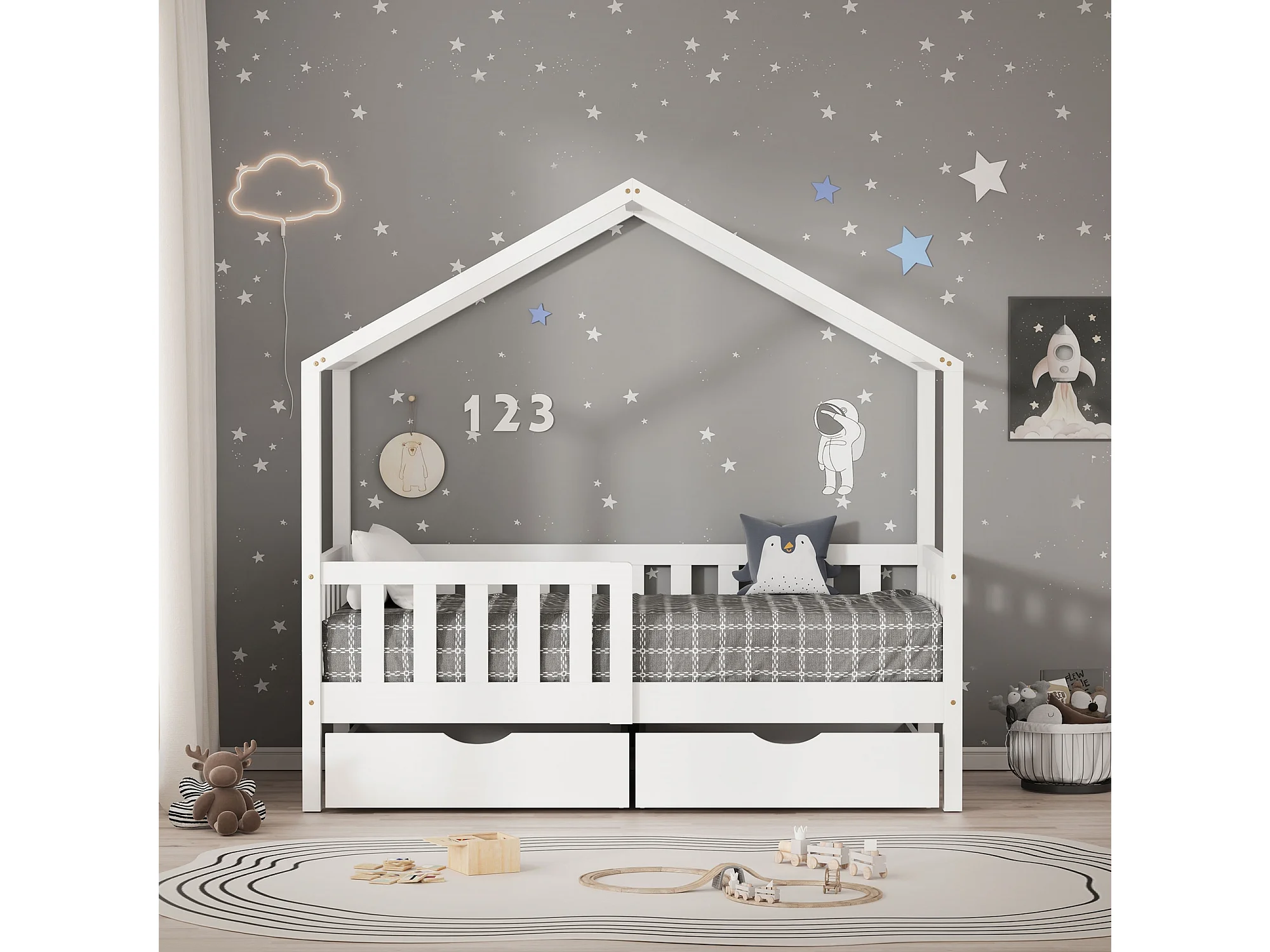 Lit cabane enfant 70x140cm blanc en bois avec 2 tiroirs protection antichute toit et sommier à lattes couchage au bas style maison pour fille garçon