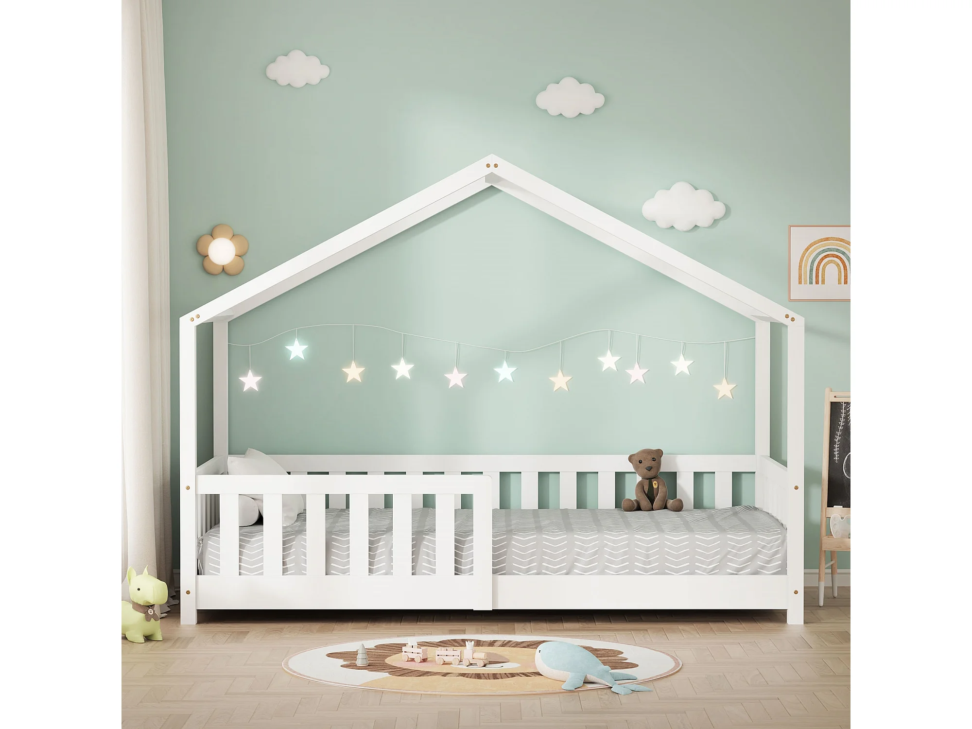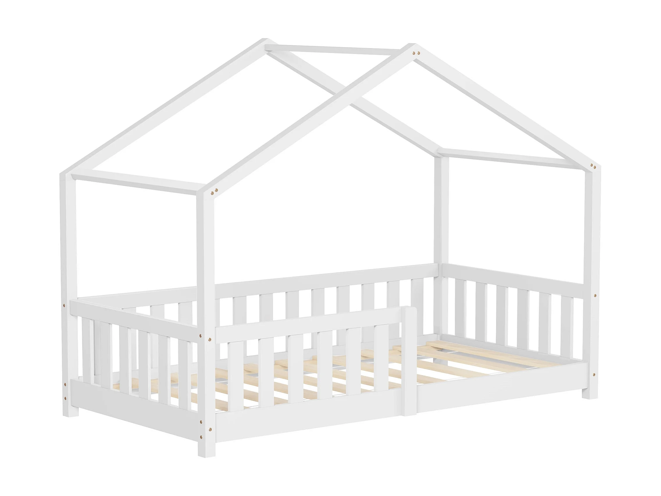 Lit cabane enfant 80x160 cm blanc pin massif avec protection antichute, toit et sommier à lattes, couchage au sol Montessori pour fille garçon