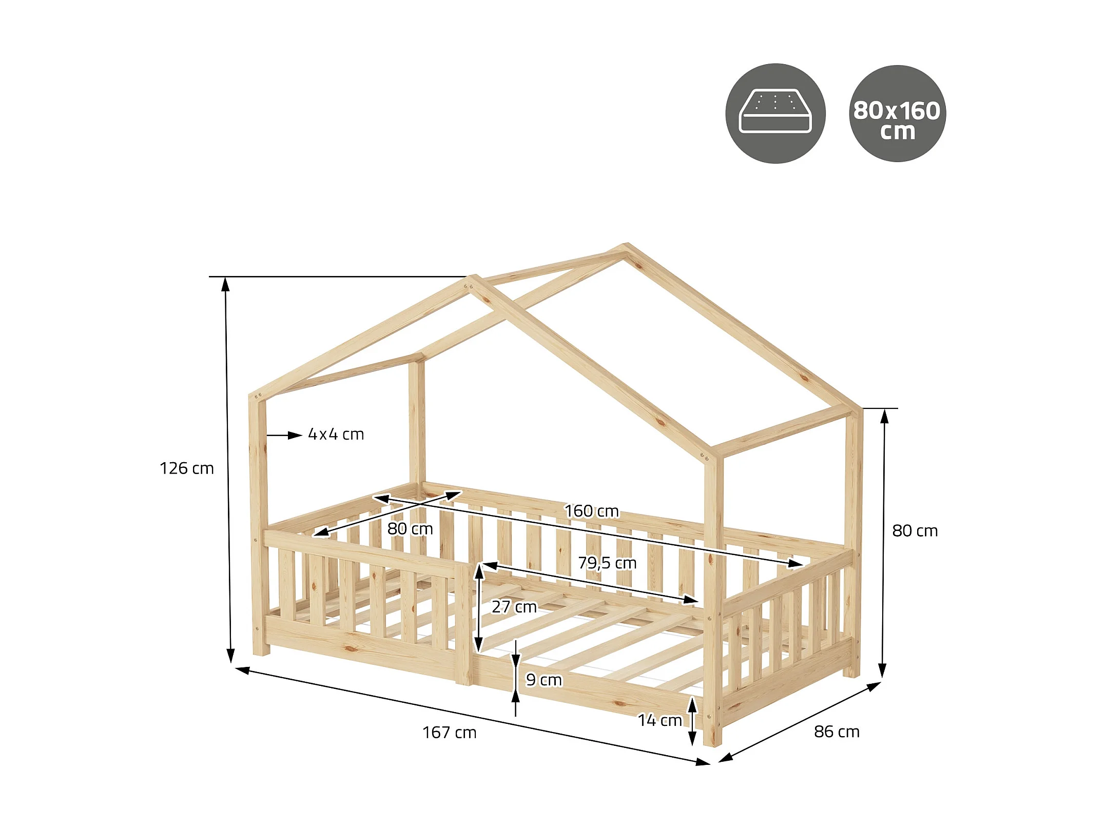 Lit cabane enfant 80x160 cm naturel en pin massif avec matelas, antichute, toit et sommier à lattes, couchage au sol Montessori pour fille garçon
