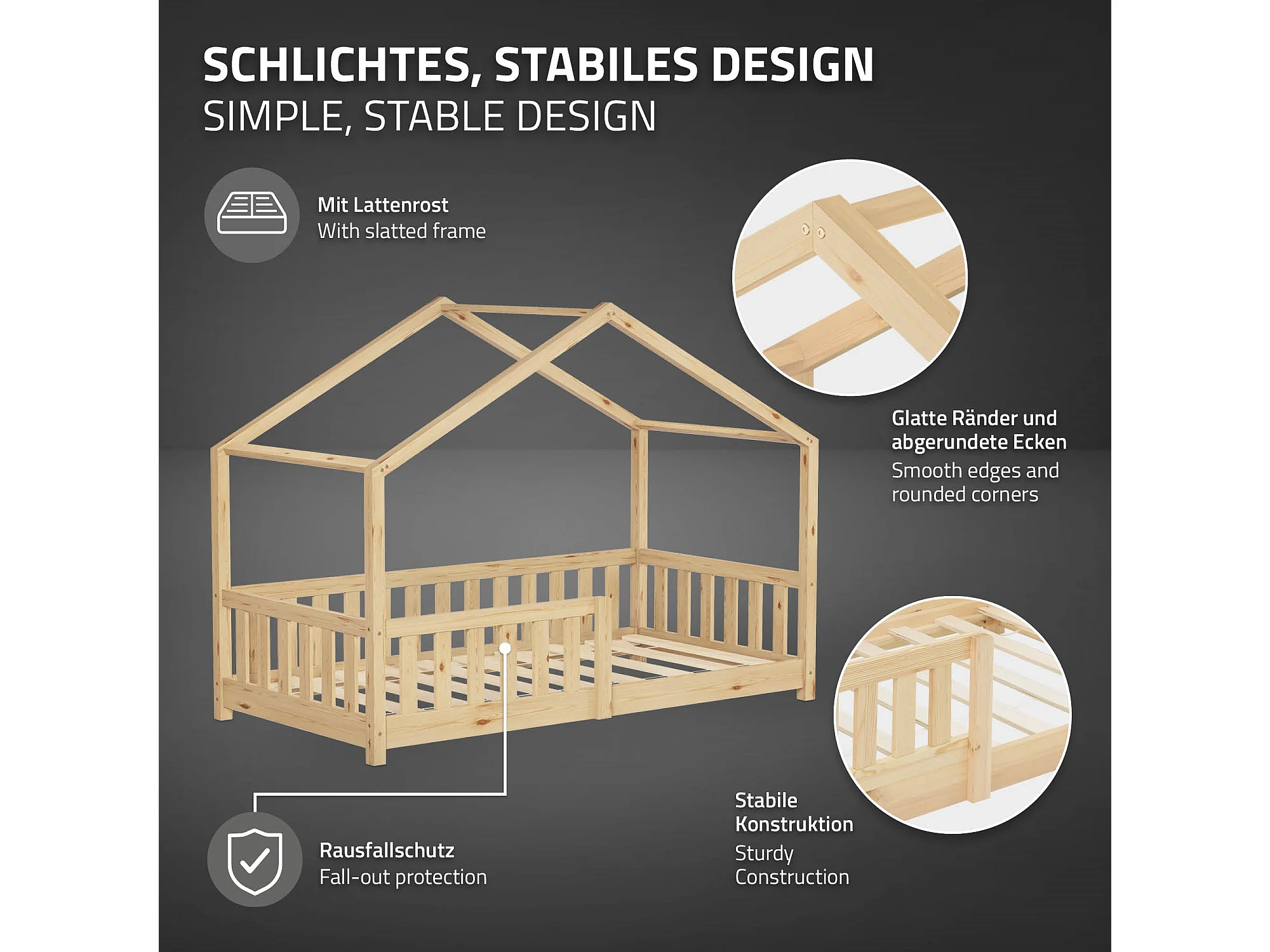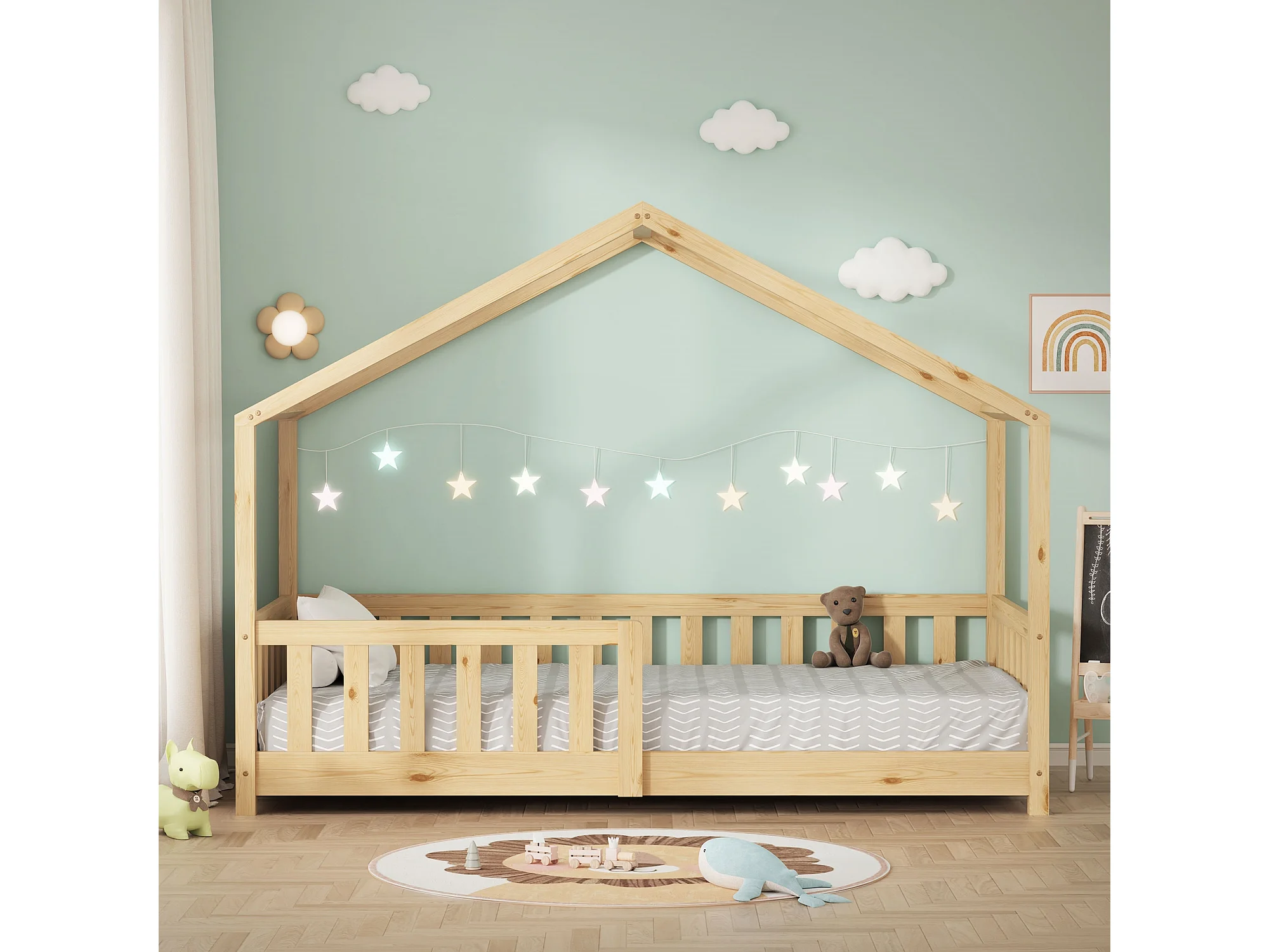 Lit cabane enfant 80x160 cm naturel pin massif avec protection antichute, toit et sommier à lattes, couchage au sol Montessori pour fille garçon