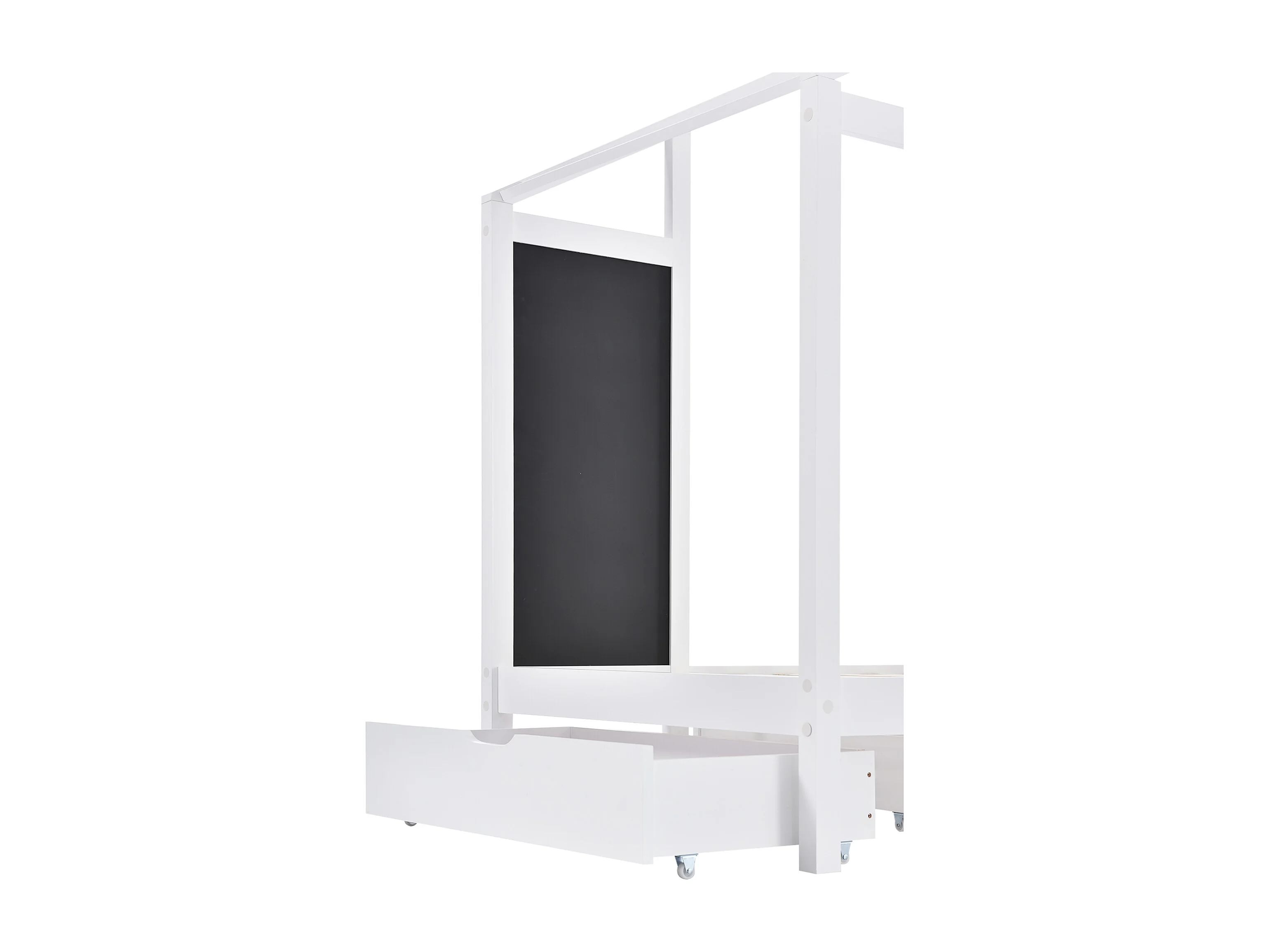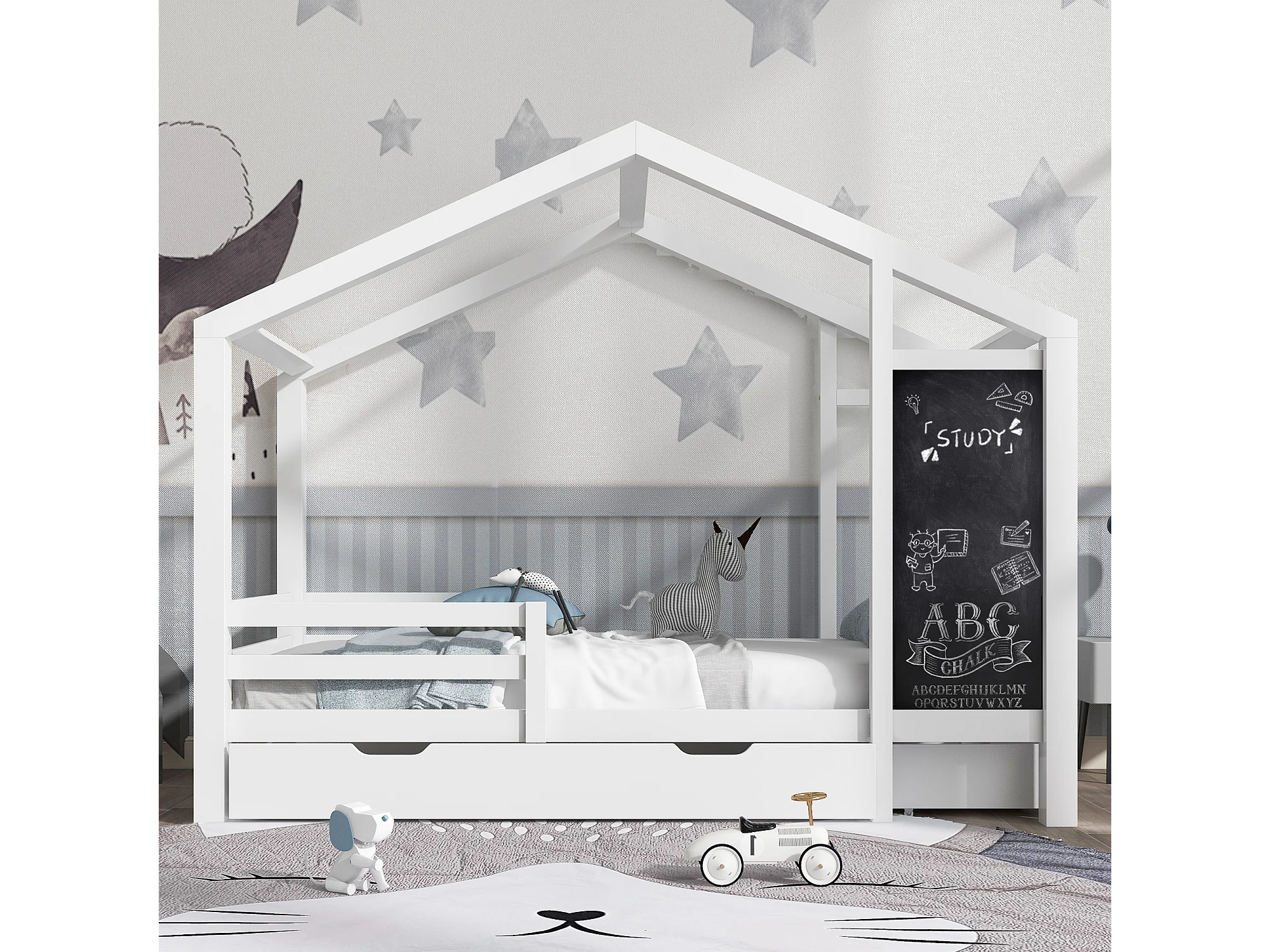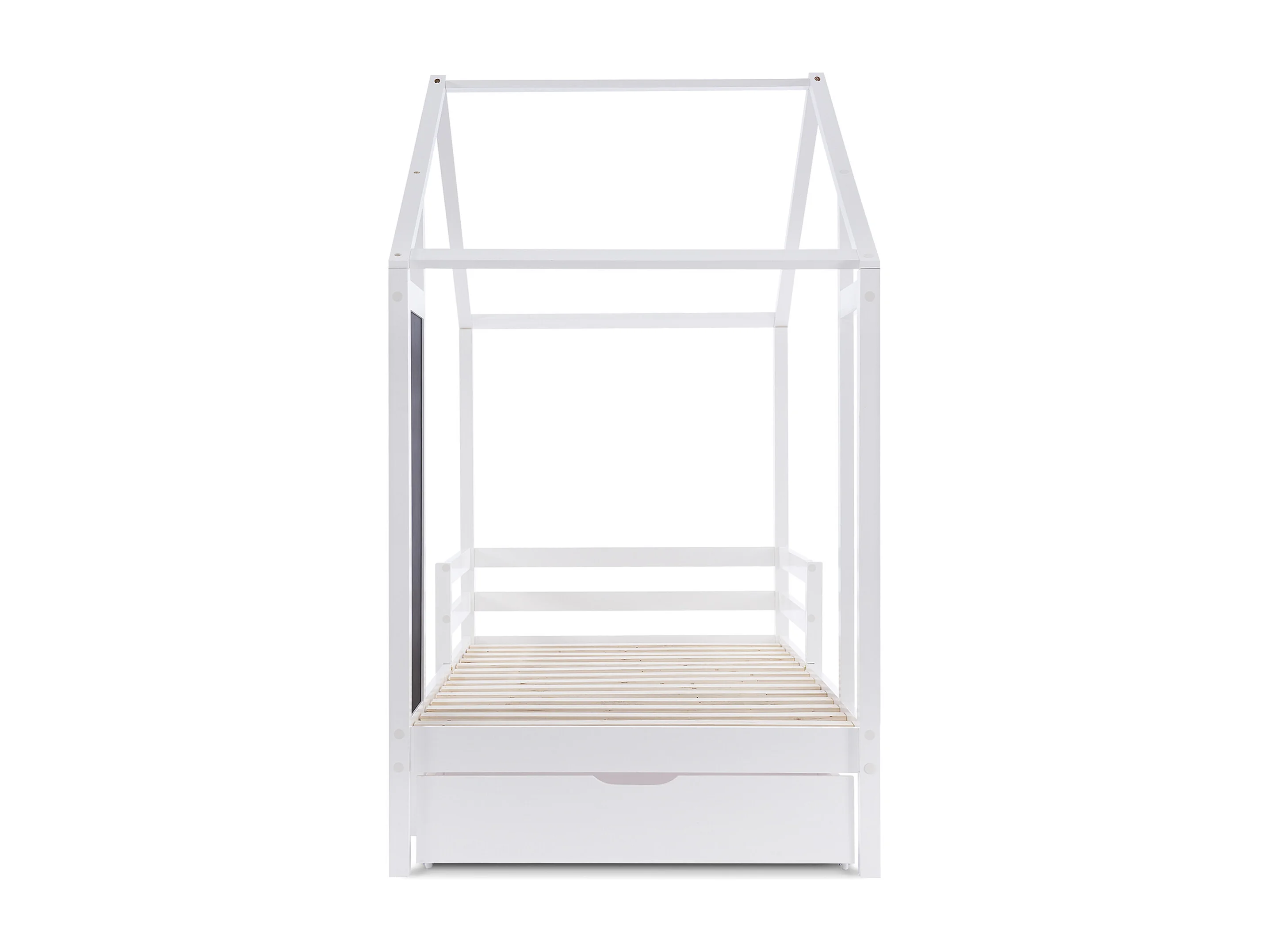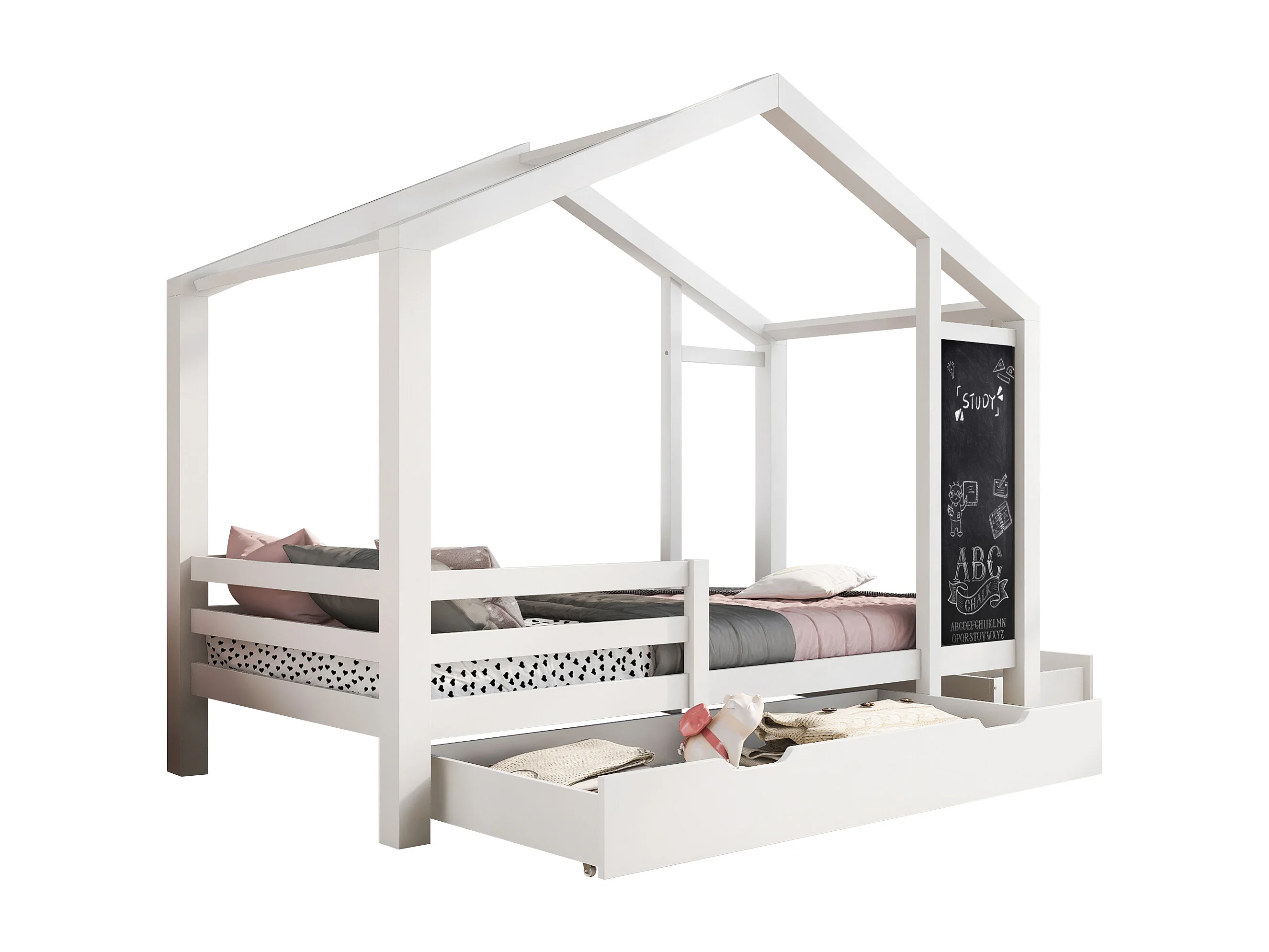 Lit cabane enfant 90 x 200 cm, tableau noir et 2 tiroirs, clôtures, en pin + MDF blanc, sans matelas