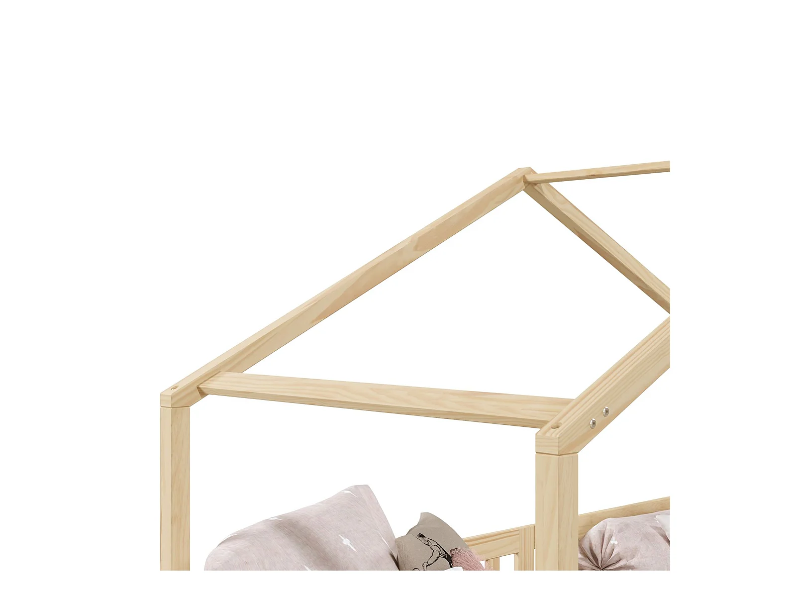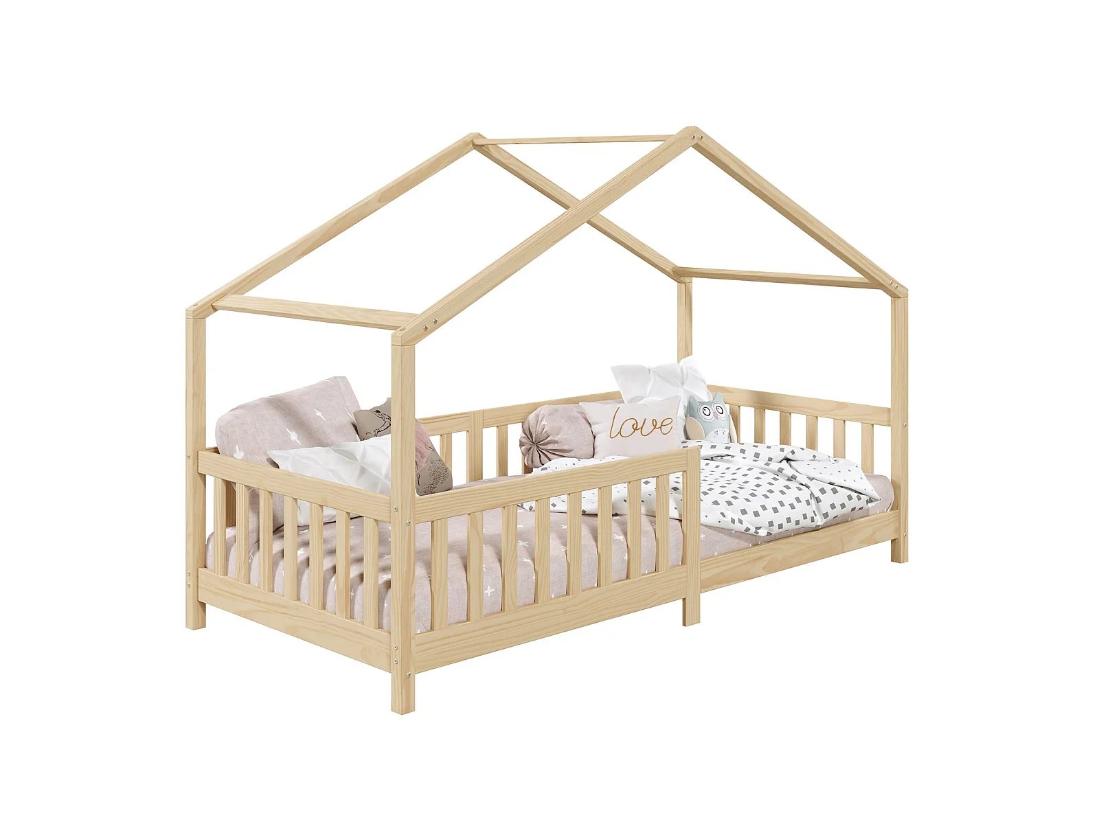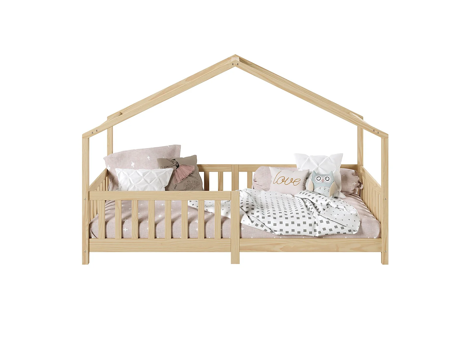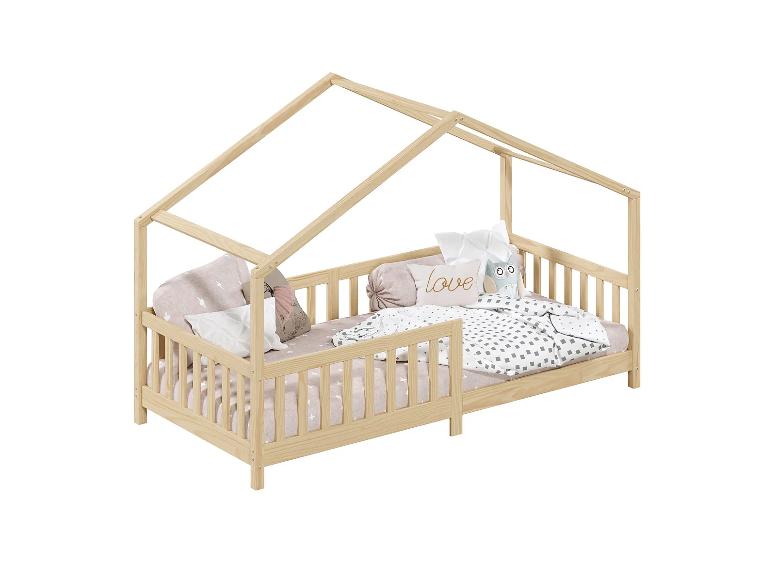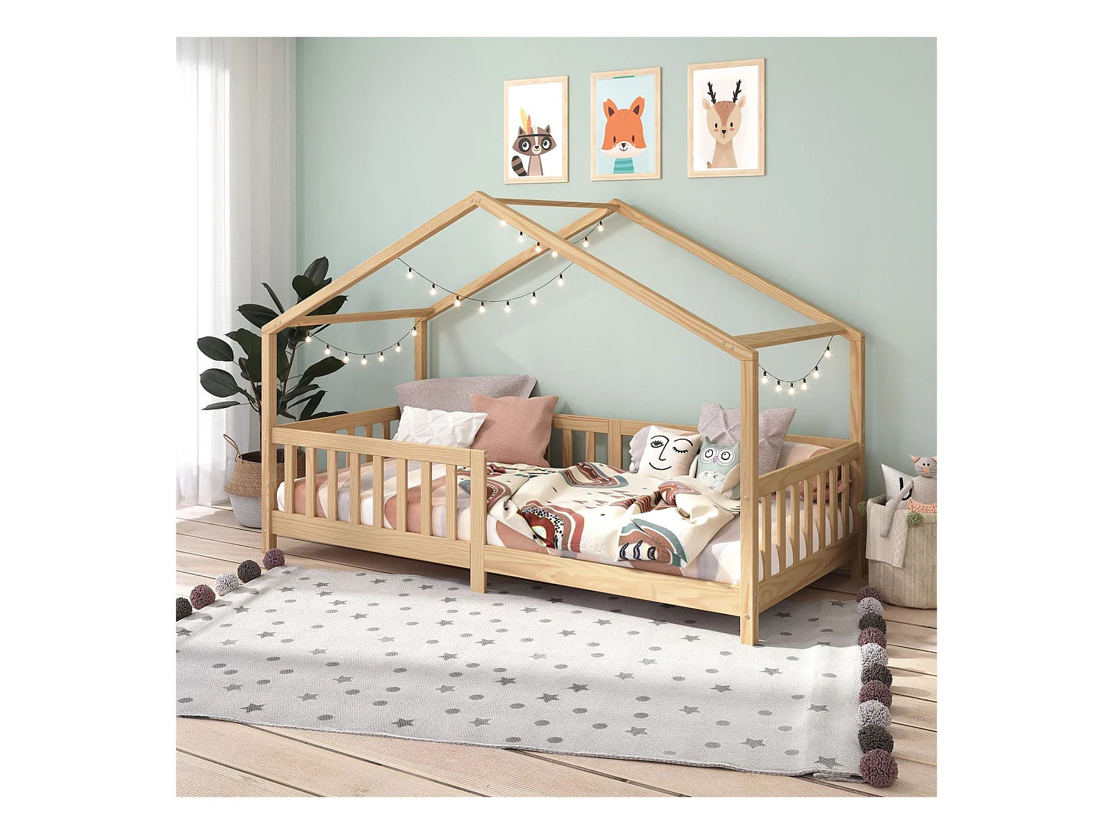 Lit cabane enfant 90x190 cm LISAN lit Simple montessori avec Barrières de Protection en Bois Massif finition naturelle