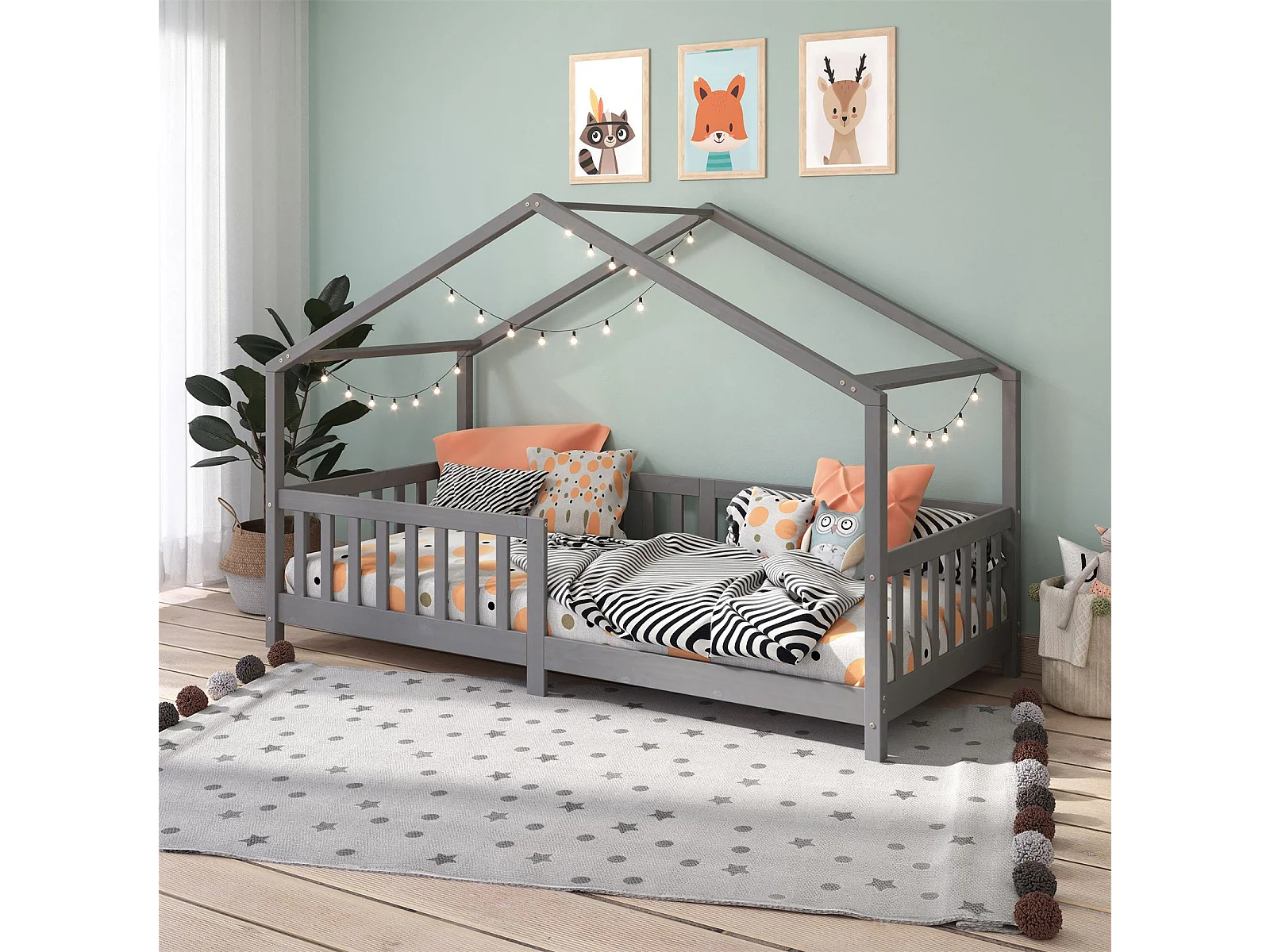 Lit cabane enfant 90x190 cm LISAN lit Simple montessori avec Barrières de Protection en Bois Massif lasuré gris