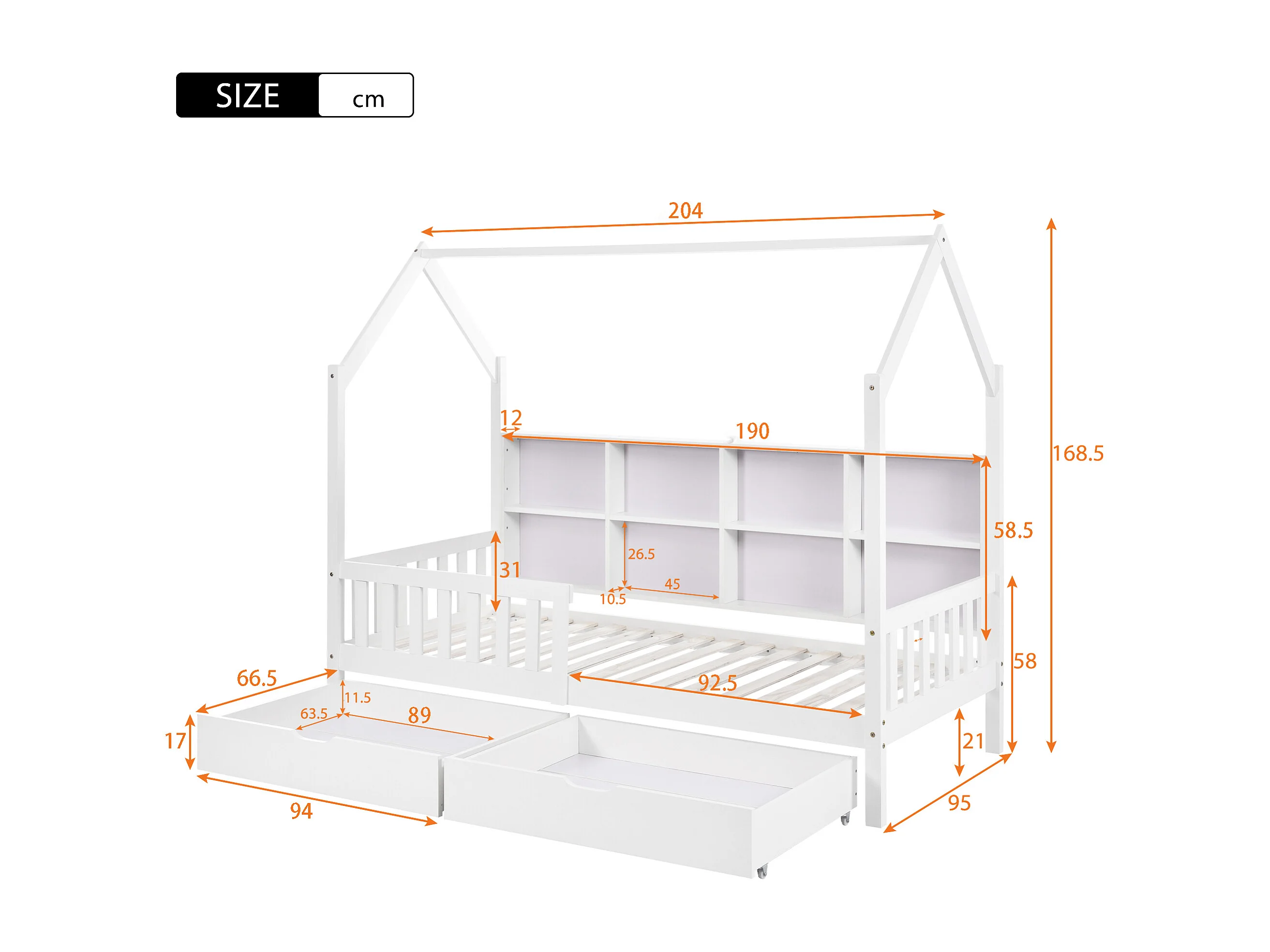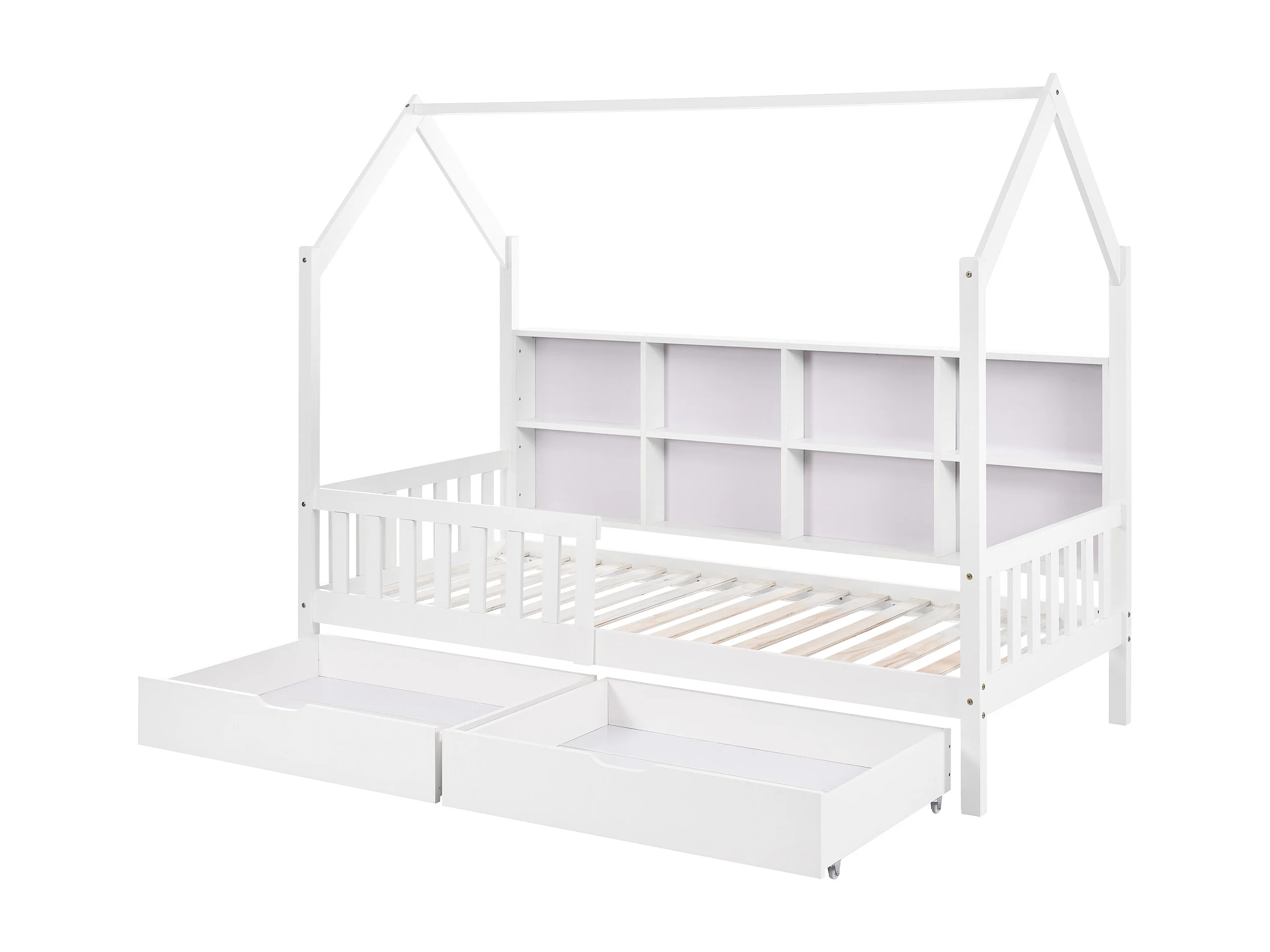 Lit cabane enfant 90×200 cm blanc avec bibliothèque, étagères et 2 tiroirs de rangement, structure bois