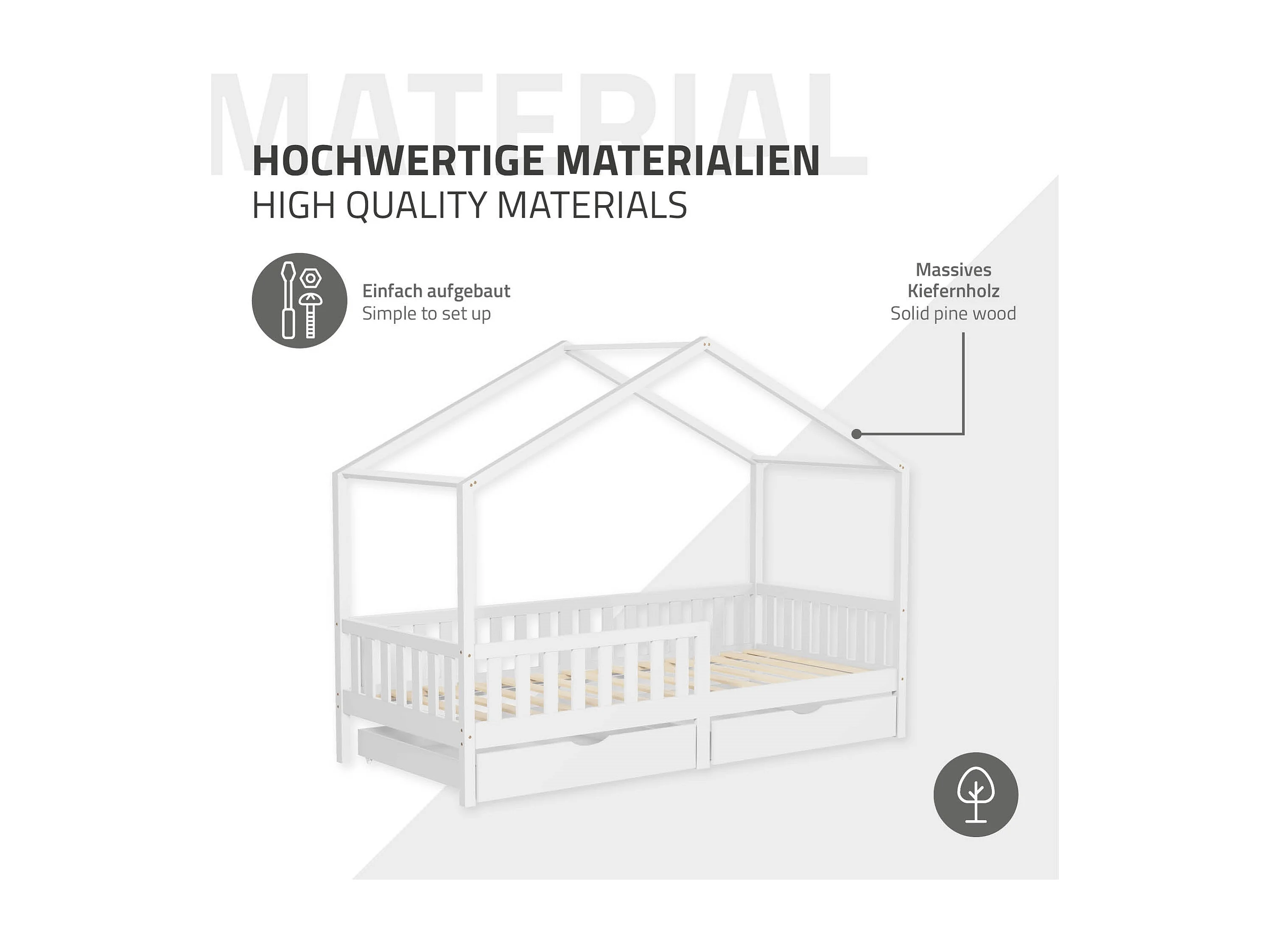 Lit cabane enfant 90x200 cm blanc avec matelas H16 cm et 2 tiroirs en bois massif protection antichute toit et sommier à lattes cadre montessori