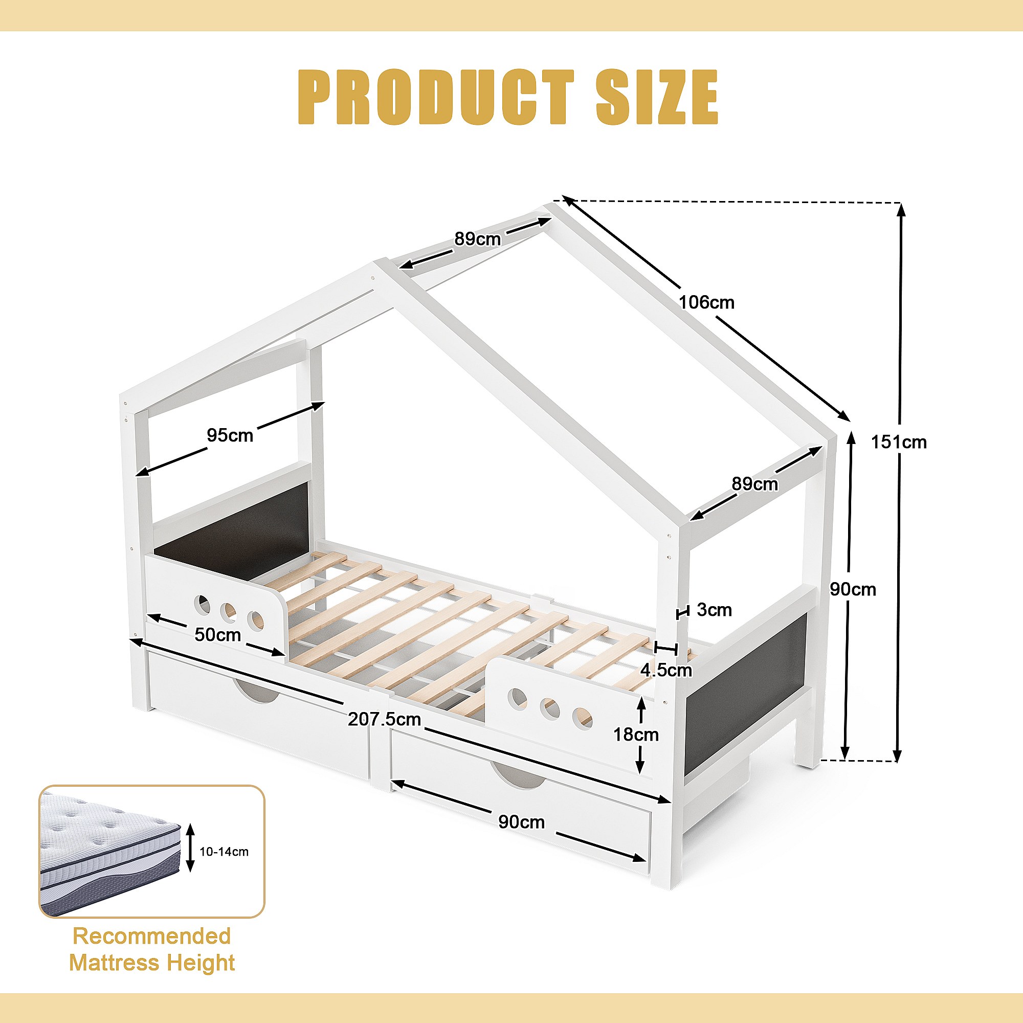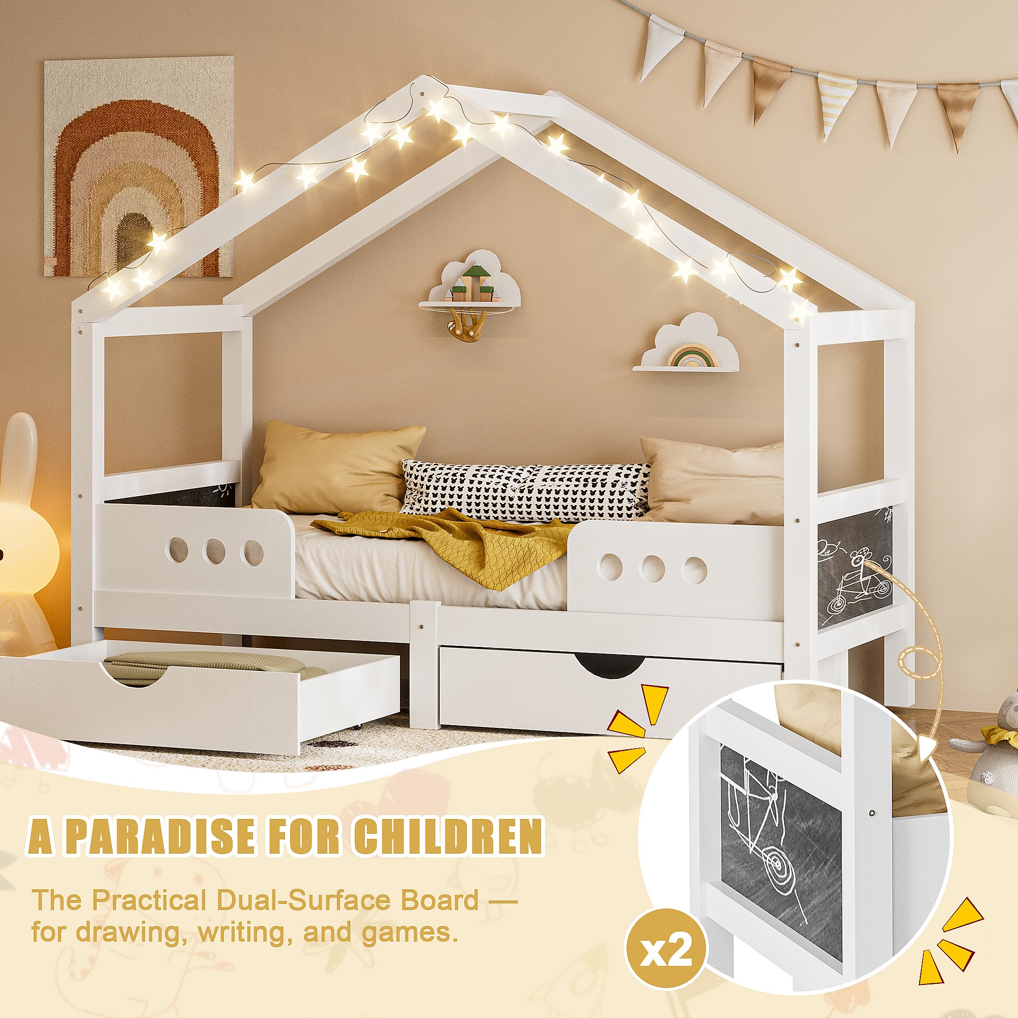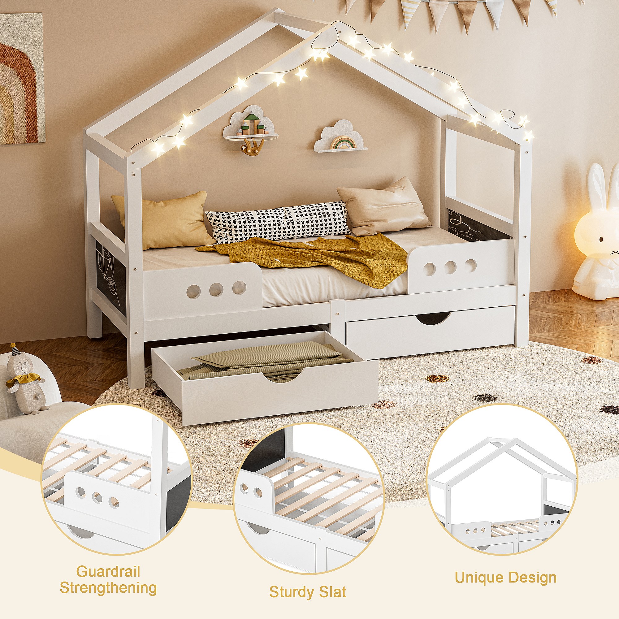Lit cabane enfant 90x200 cm blanc - avec toit, 2 tiroirs de rangement - tableau de dessin