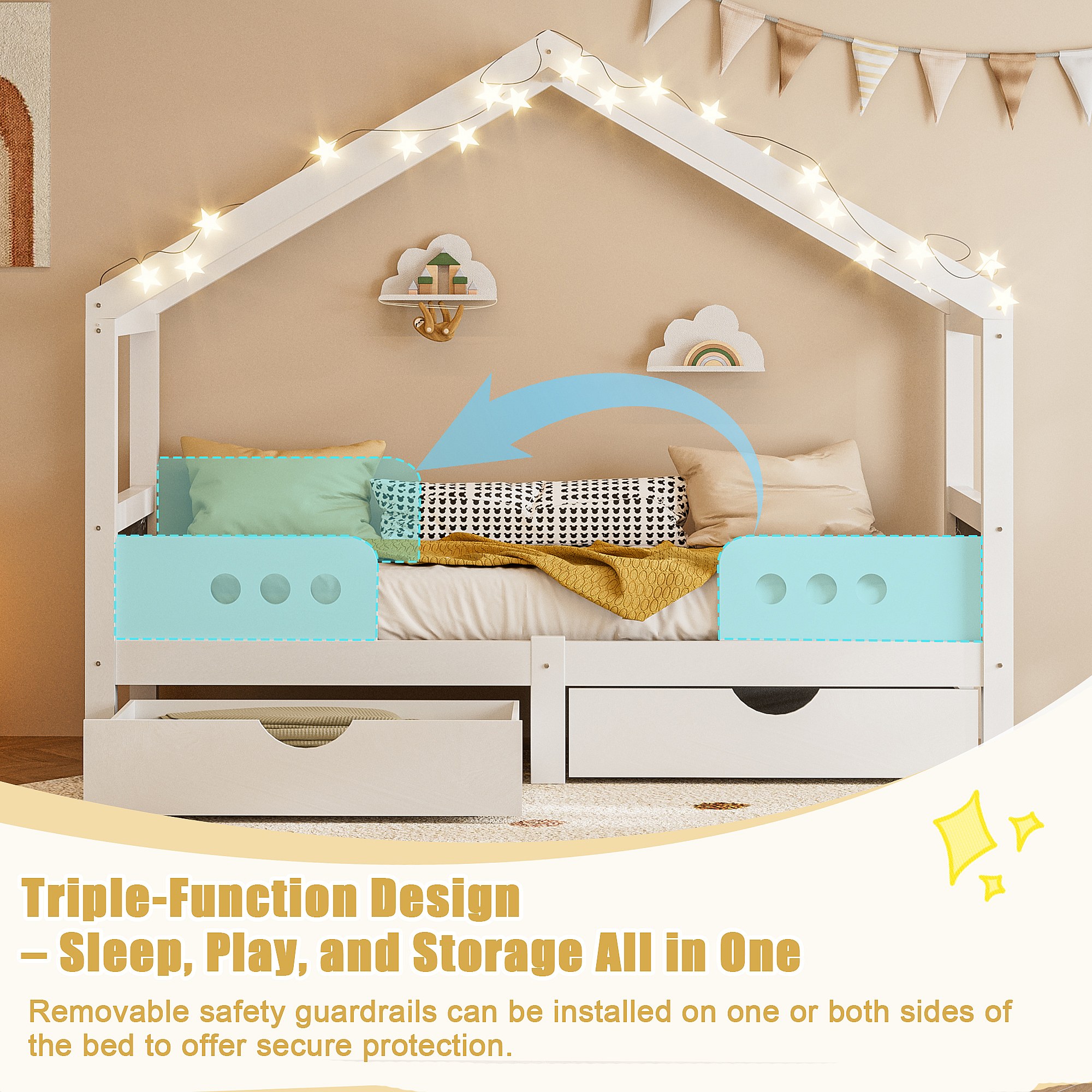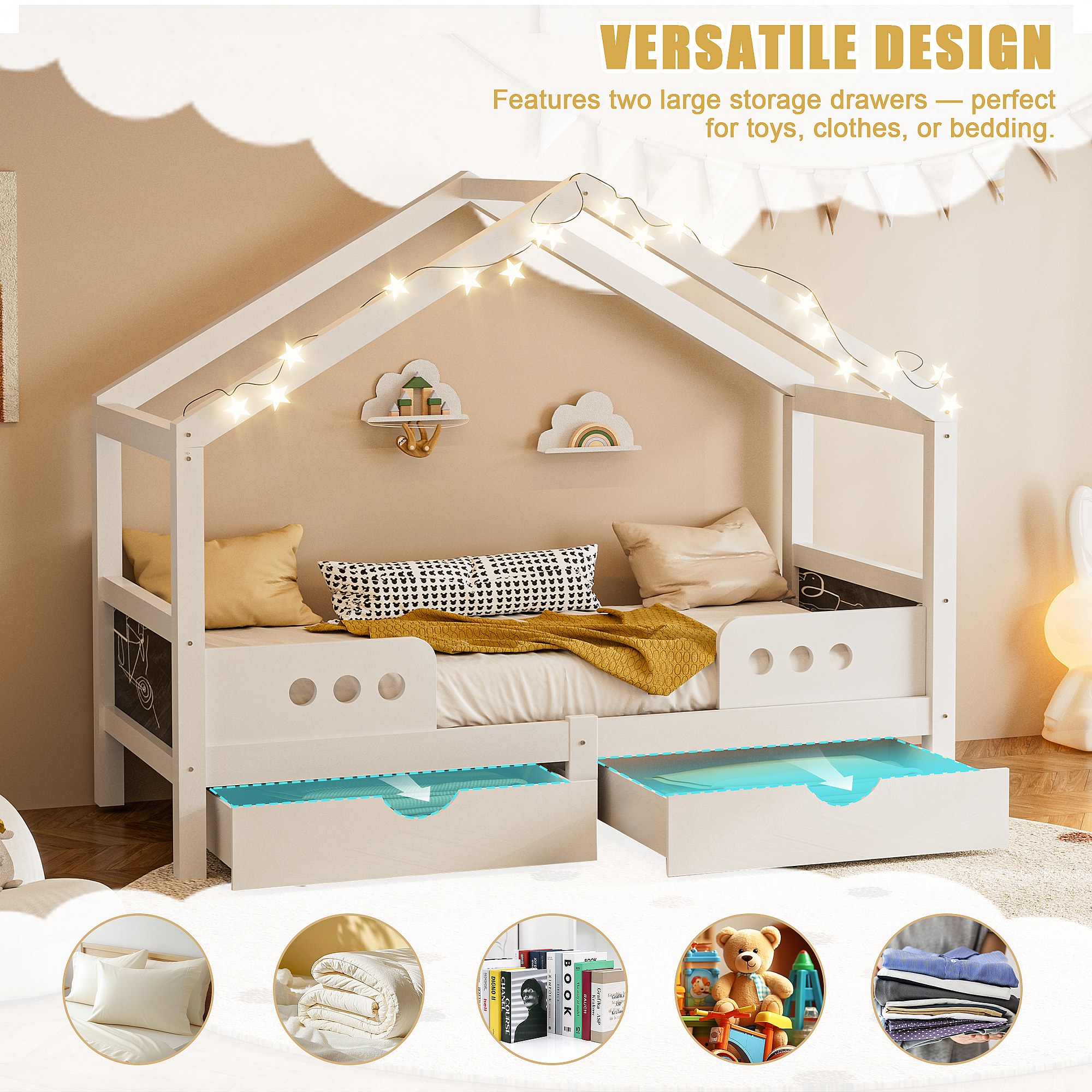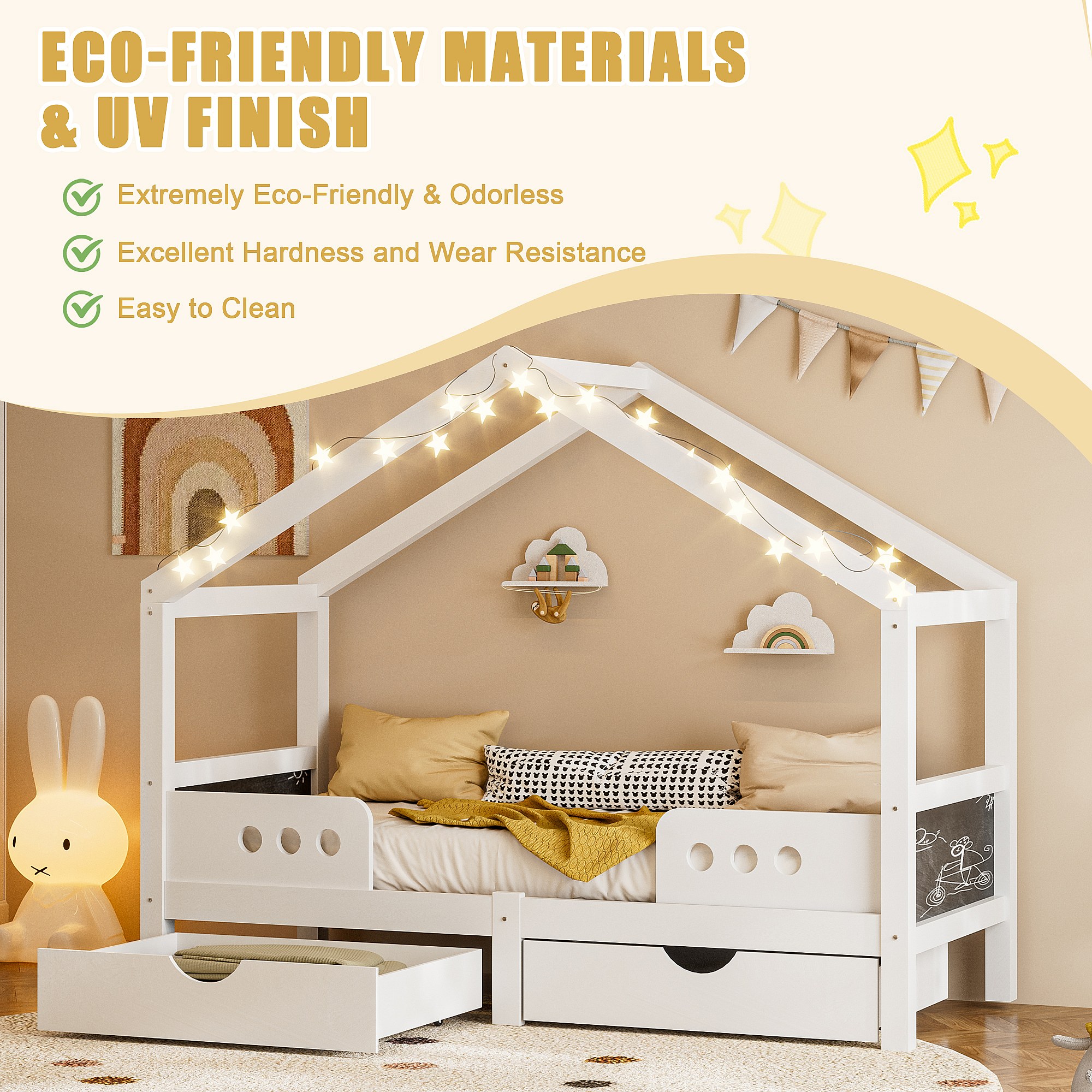 Lit cabane enfant 90x200 cm blanc - avec toit, 2 tiroirs de rangement - tableau de dessin