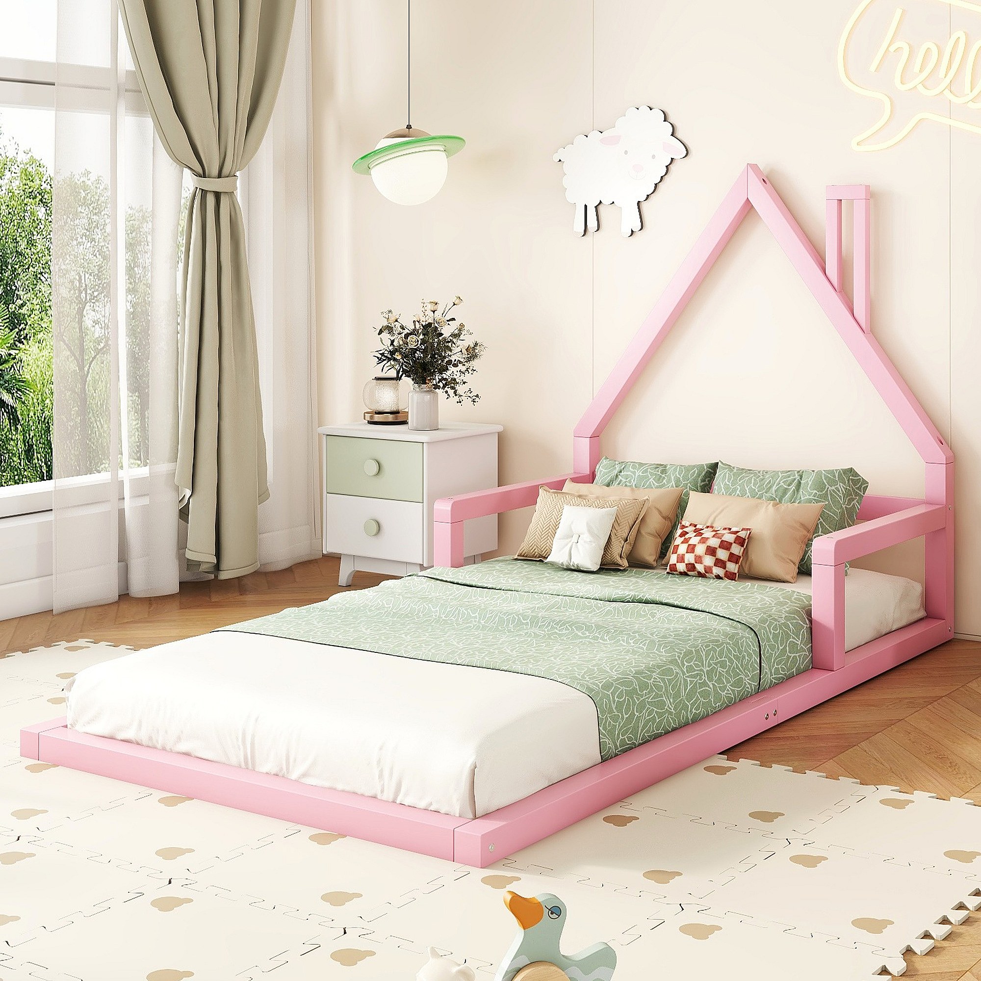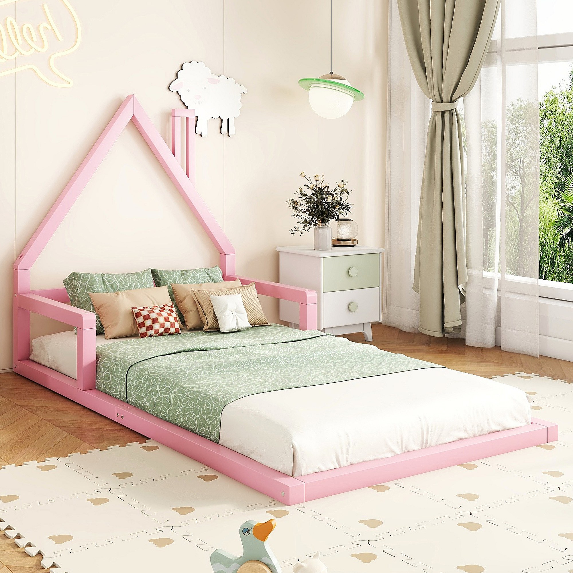 Lit cabane enfant 90x200 cm rose en pin massif, forme de maison, design simple et chaleureux pour chambre fille