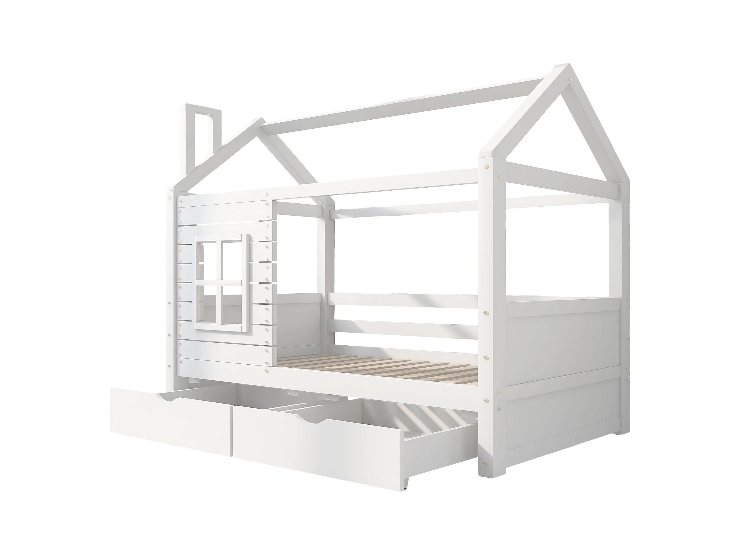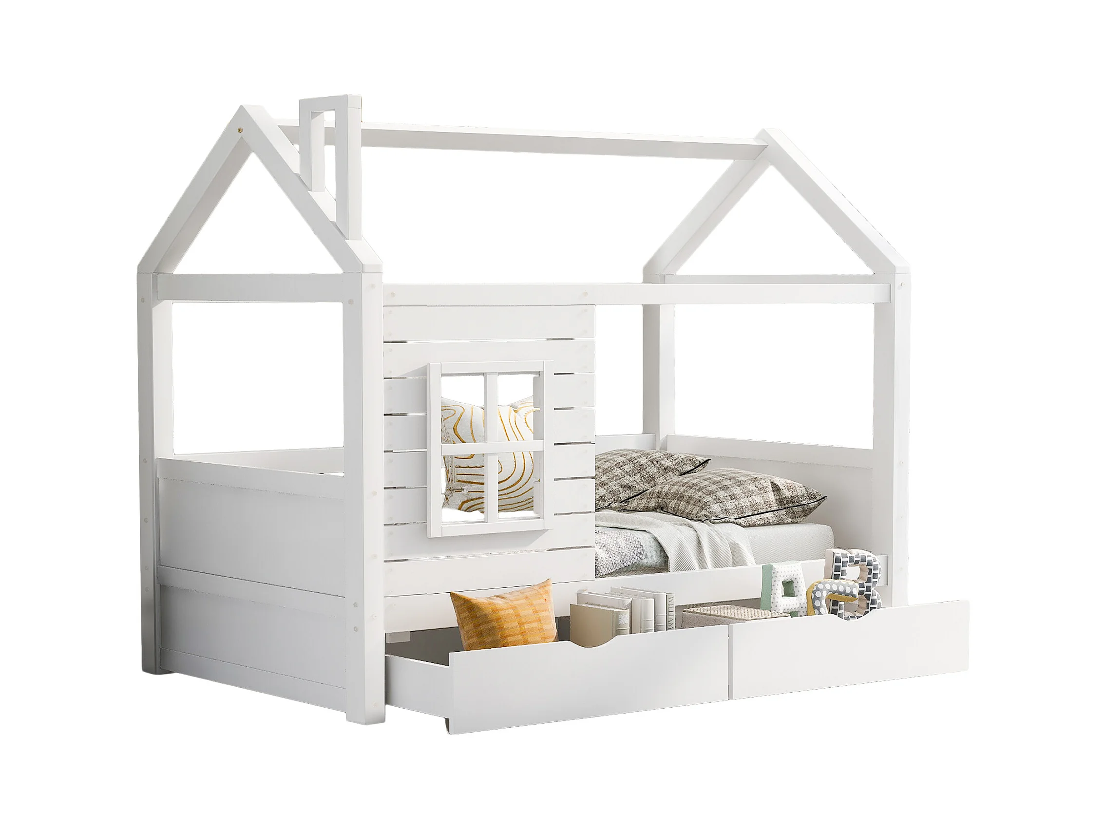 Lit cabane enfant 90x200cm avec 2 tiroirs blanc, dispositif antichute, forme maison, pin, sans matelas