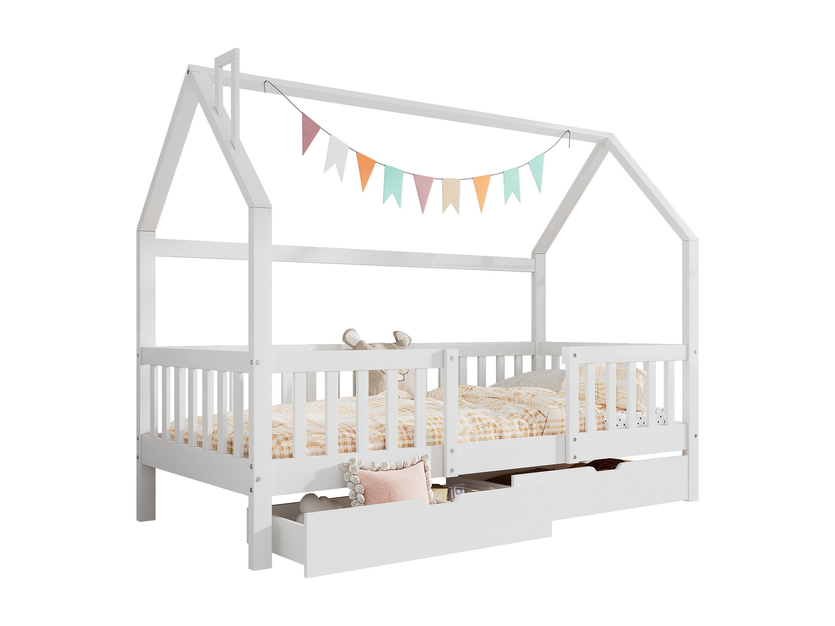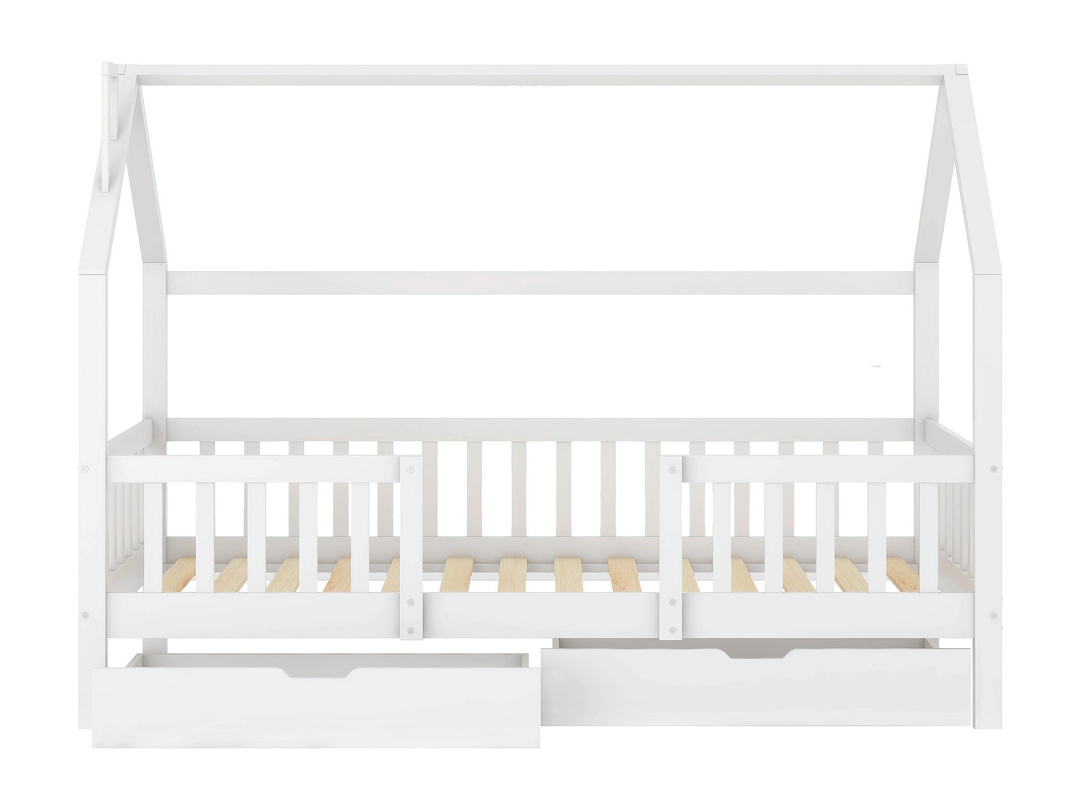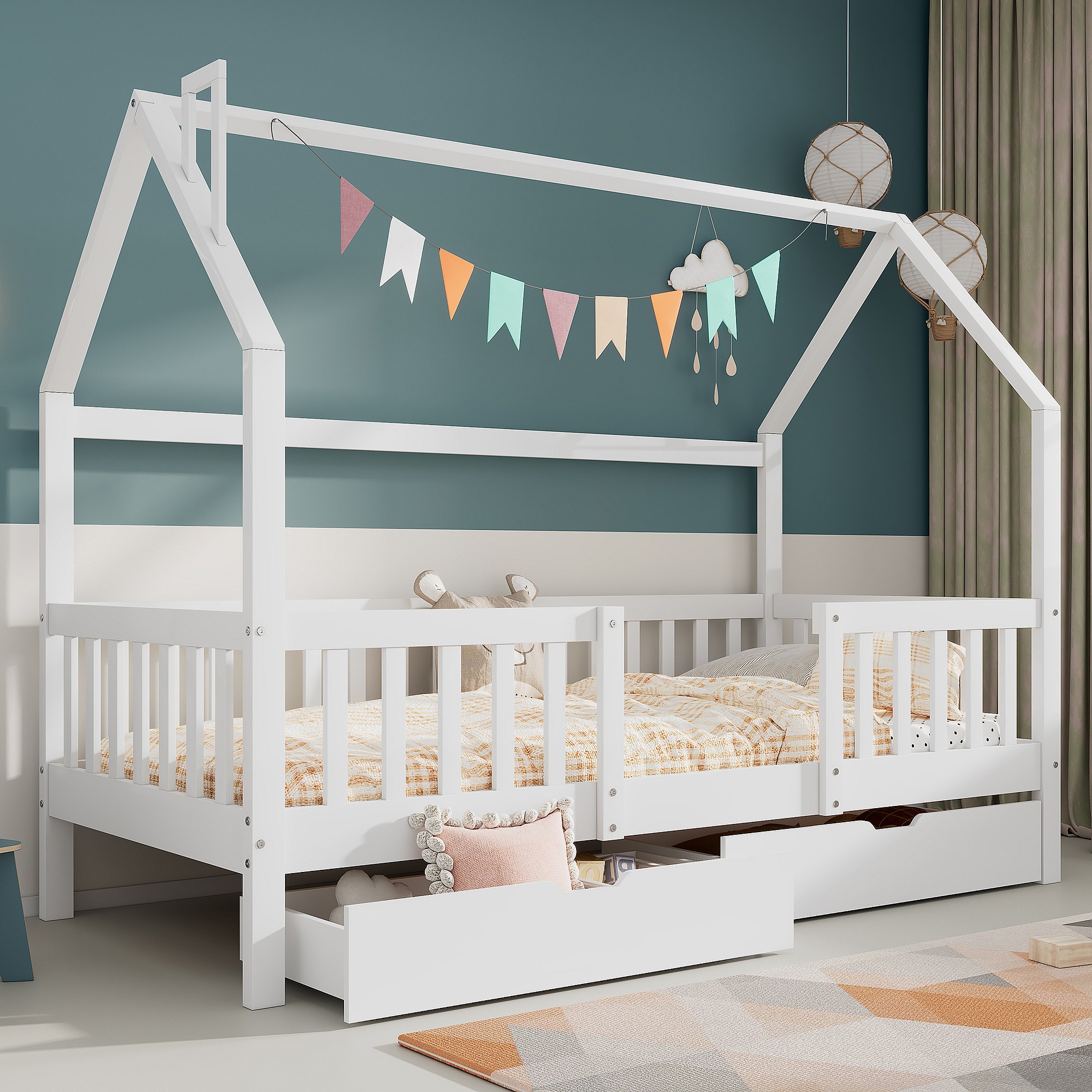 Lit cabane enfant 90x200cm avec barrières de sécurité et 2 tiroirs, cadre en pin, blanc, sans matelas