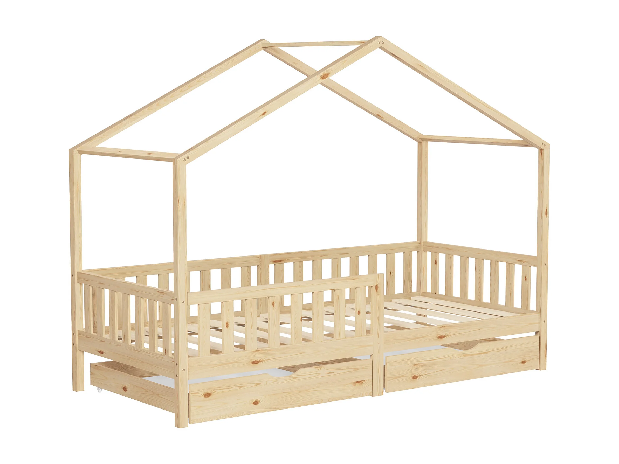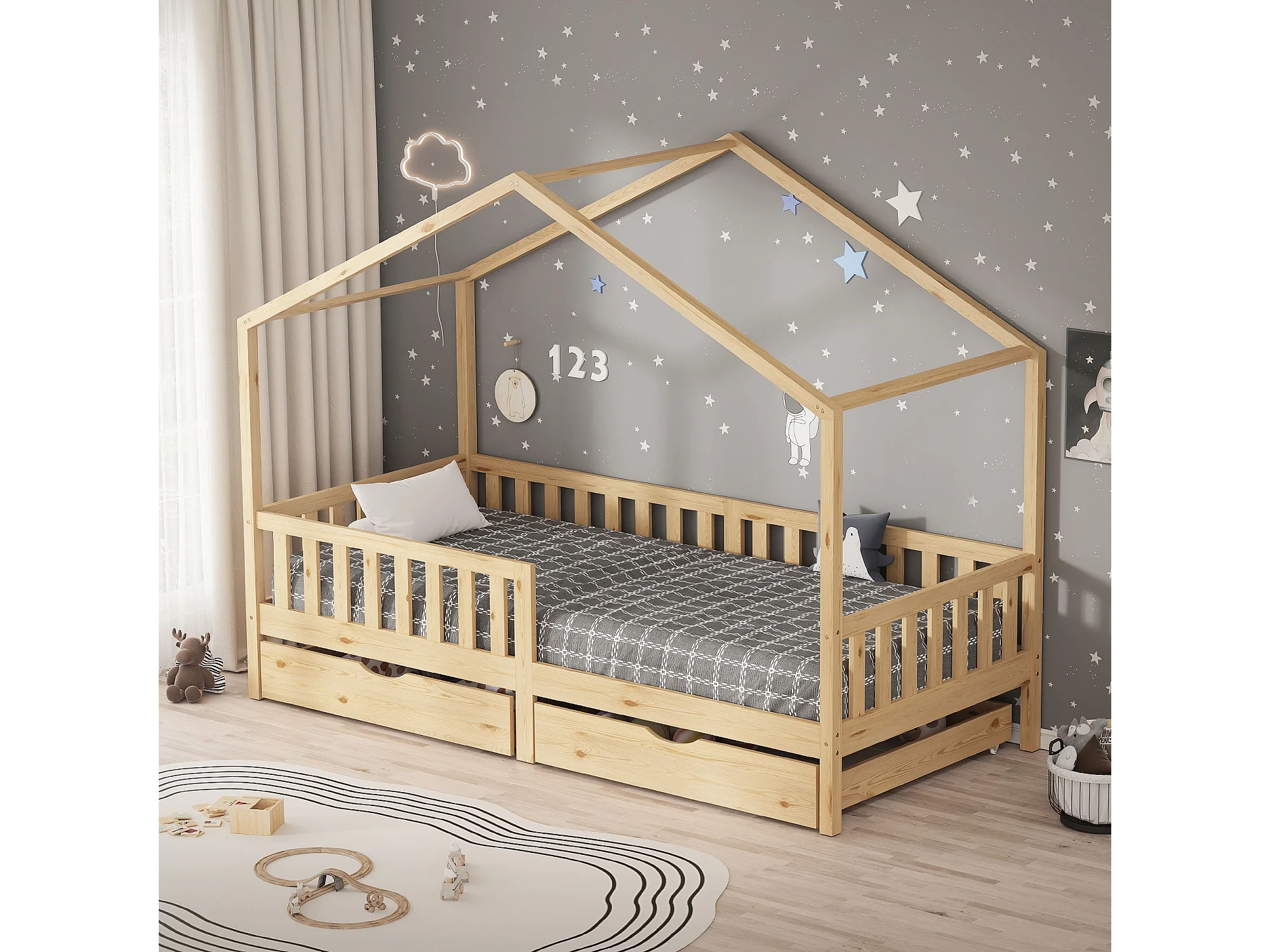 Lit cabane enfant 90x200cm naturel en bois avec 2 tiroirs protection antichute toit et sommier à lattes couchage au bas style maison pour fille garçon