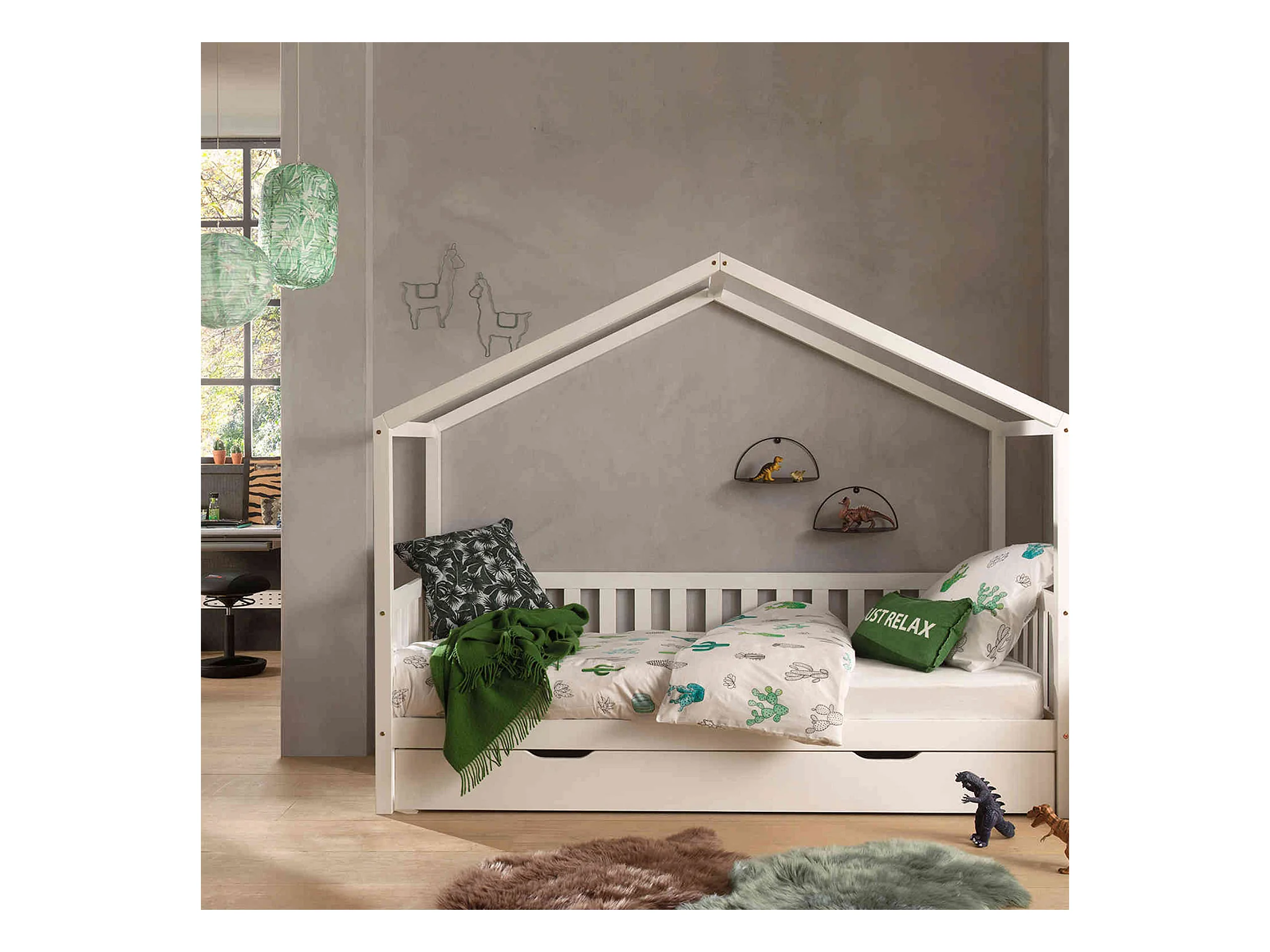 Lit cabane enfant à barreaux en bois massif blanc 90x200 avec tiroir de lit - LT2025