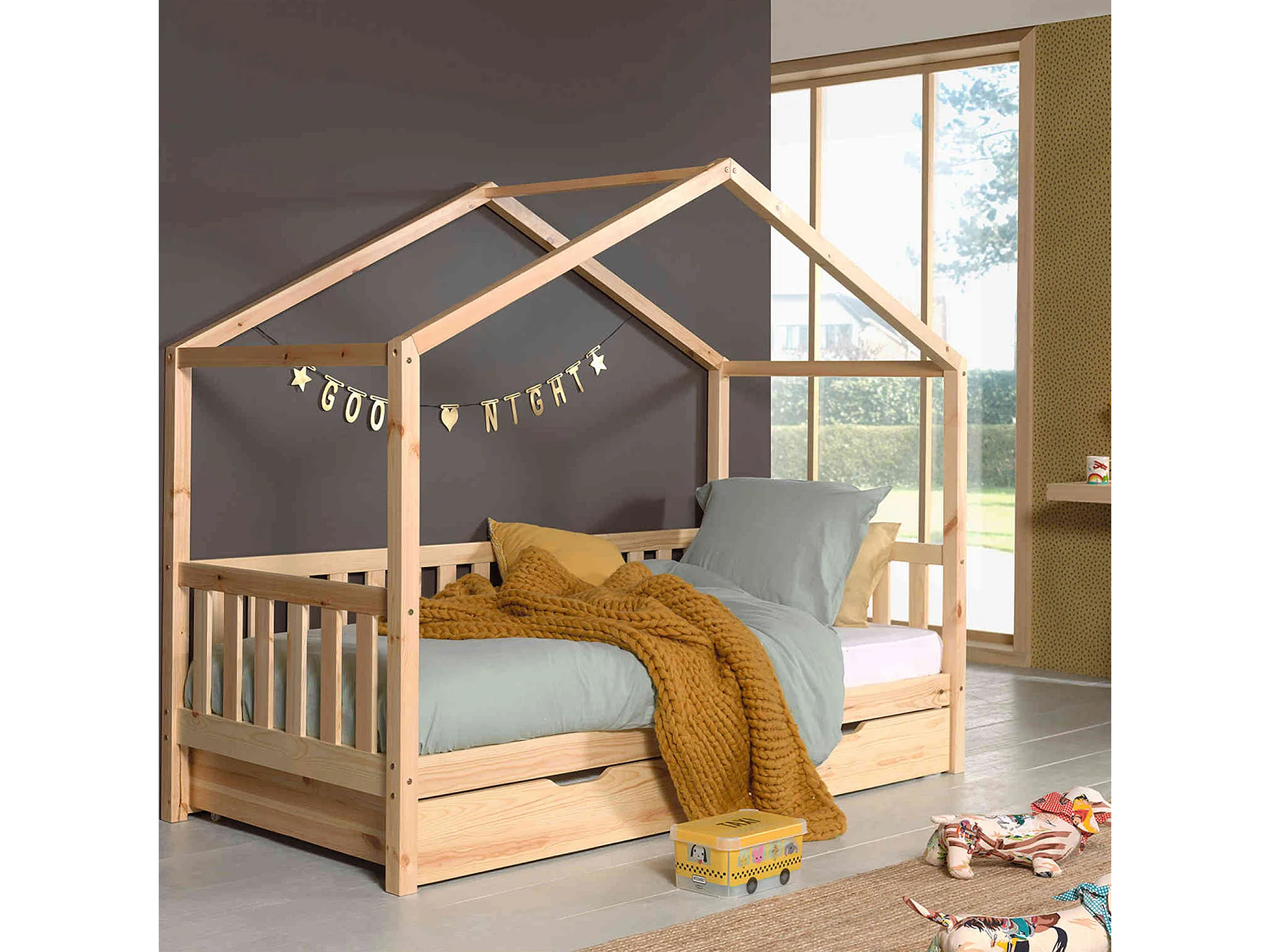 Lit cabane enfant à barreaux en bois massif naturel 90x200 avec tiroir de lit - LT2025