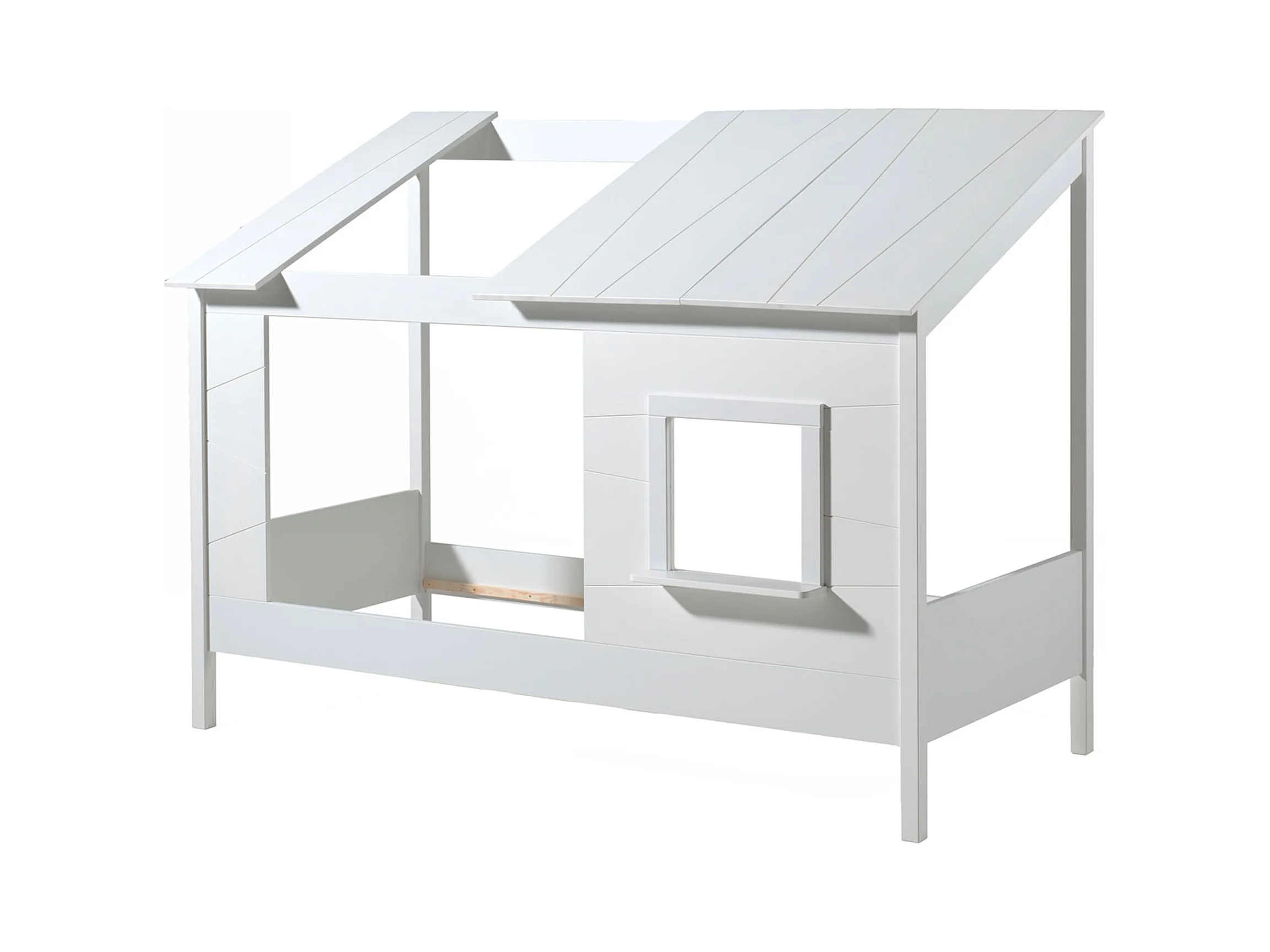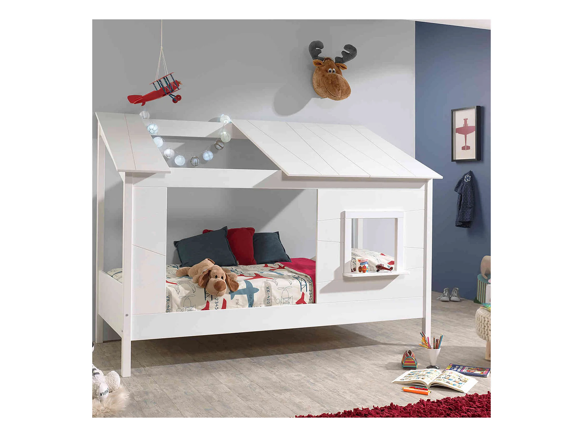 Lit cabane enfant avec toit et fenêtre en bois blanc 90x200