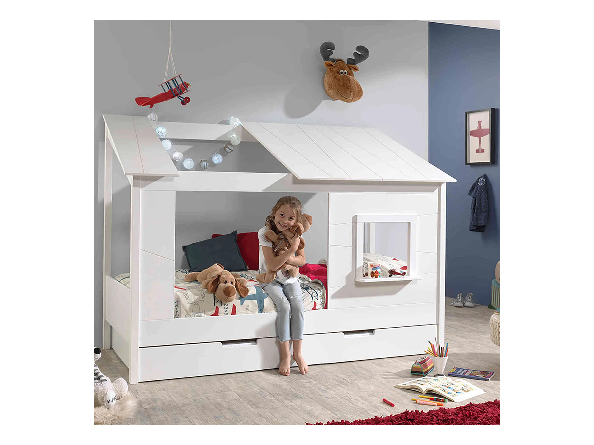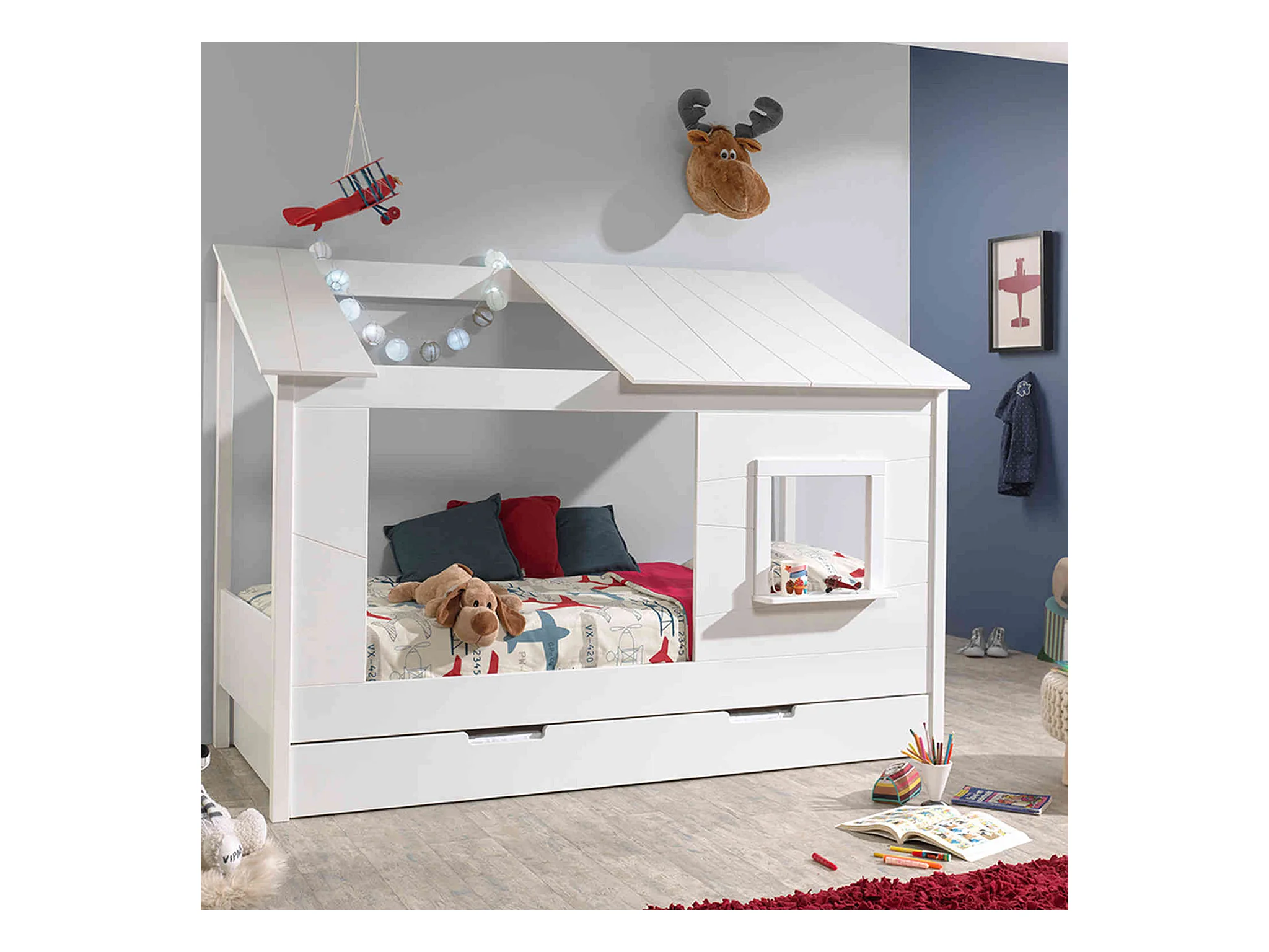 Lit cabane enfant avec toit et fenêtre en bois blanc 90x200 + tiroir de lit