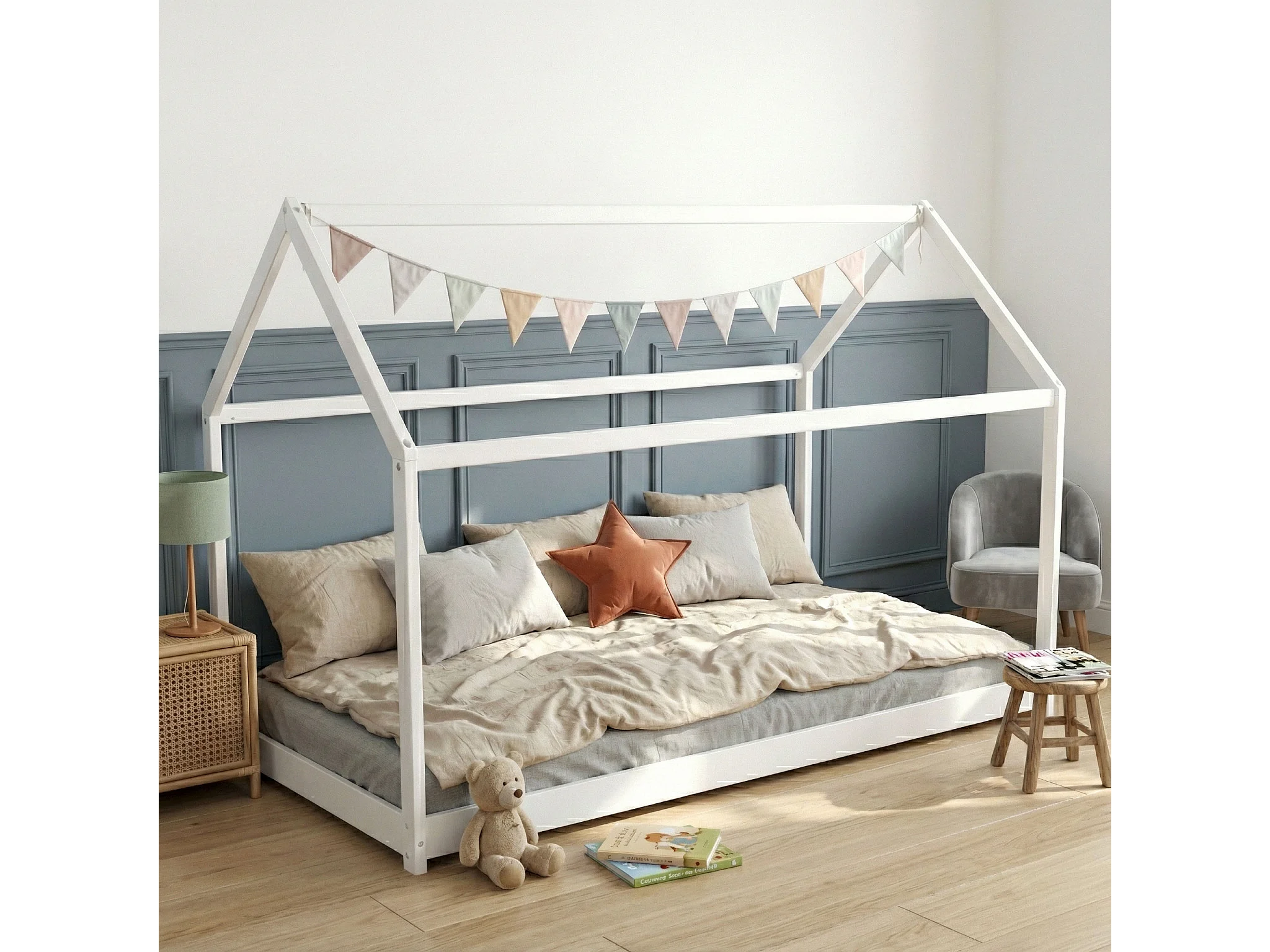Lit cabane enfant inspiration Montessori en bois blanc 70x140 - LT14004
