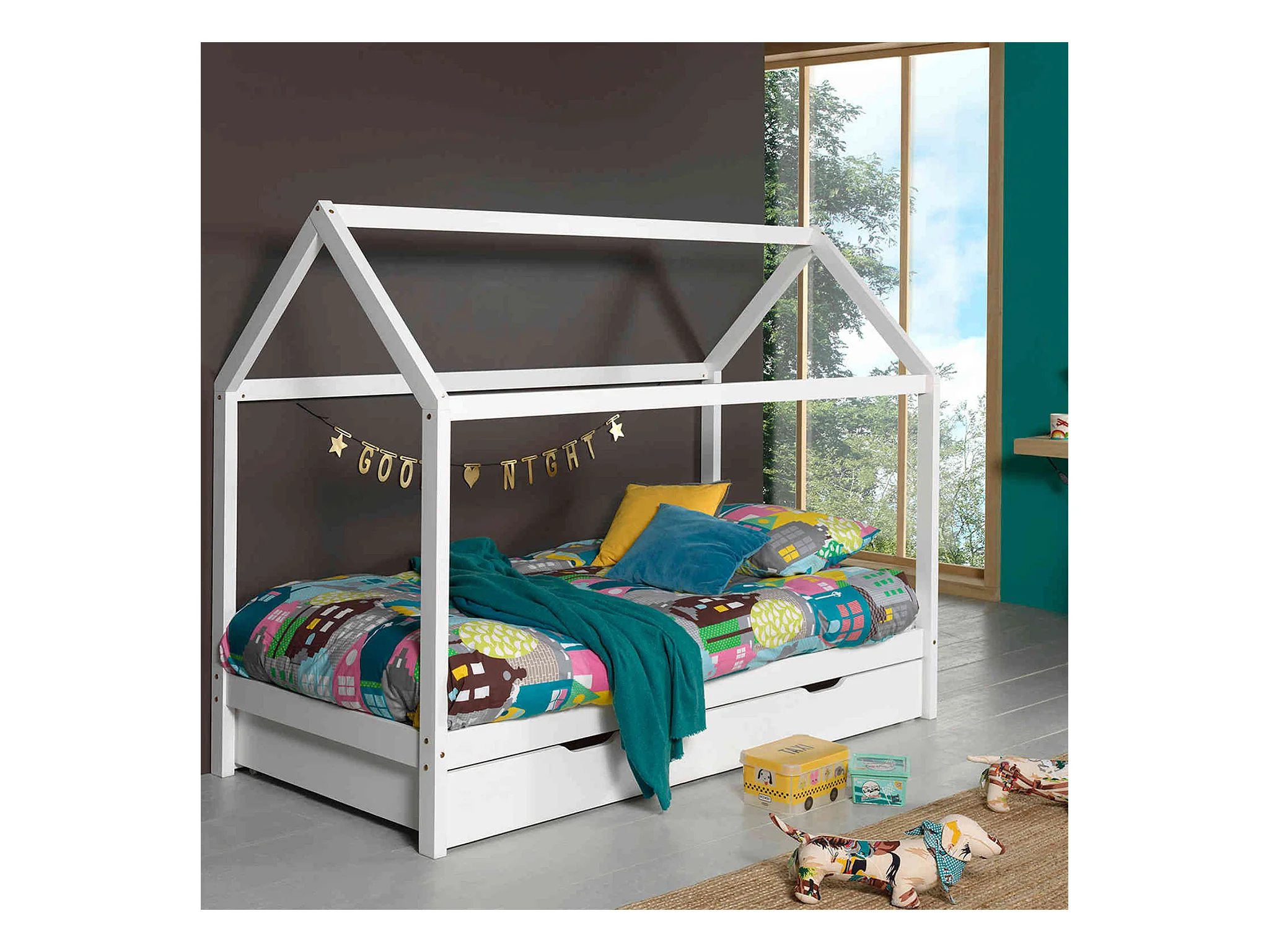 Lit cabane enfant en bois massif blanc 90x200 avec tiroir de lit - LT2024