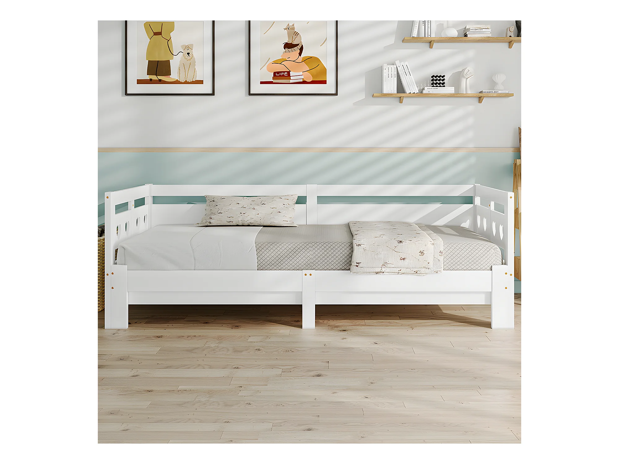Lit cabane pour enfant, bois massif avec clôture et sommier à lattes, pour chambres d'enfants, blanc (200x90cm)