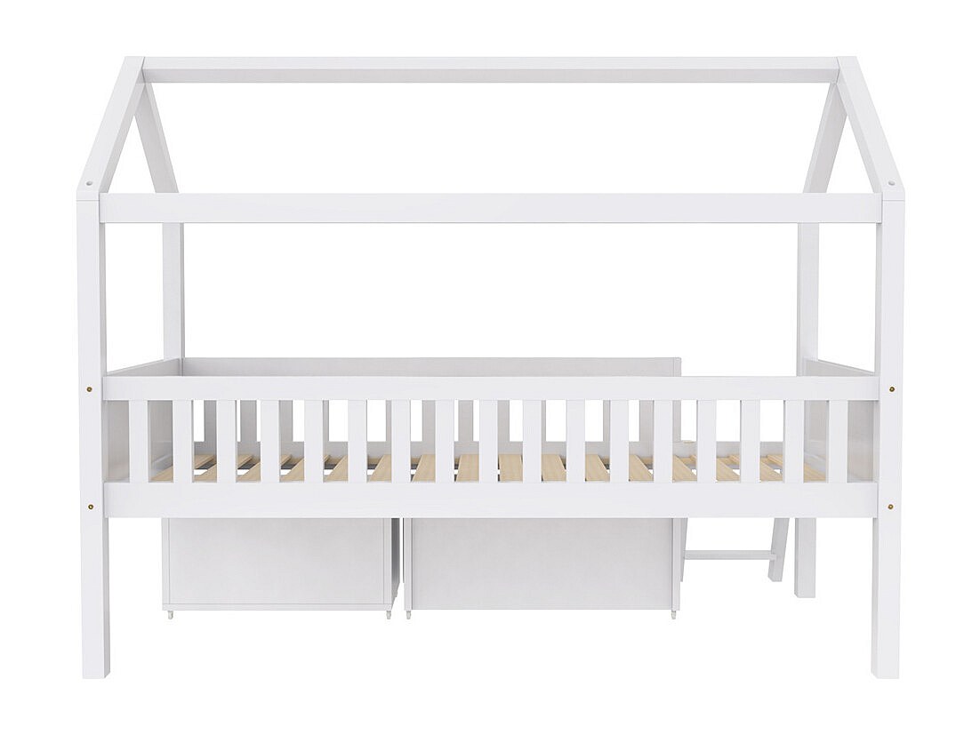 Lit cabane, lit enfant, lit adolescent 90x200cm, avec tiroirs, compartiments de rangement et barrière anti-chute, bois massif, blanc