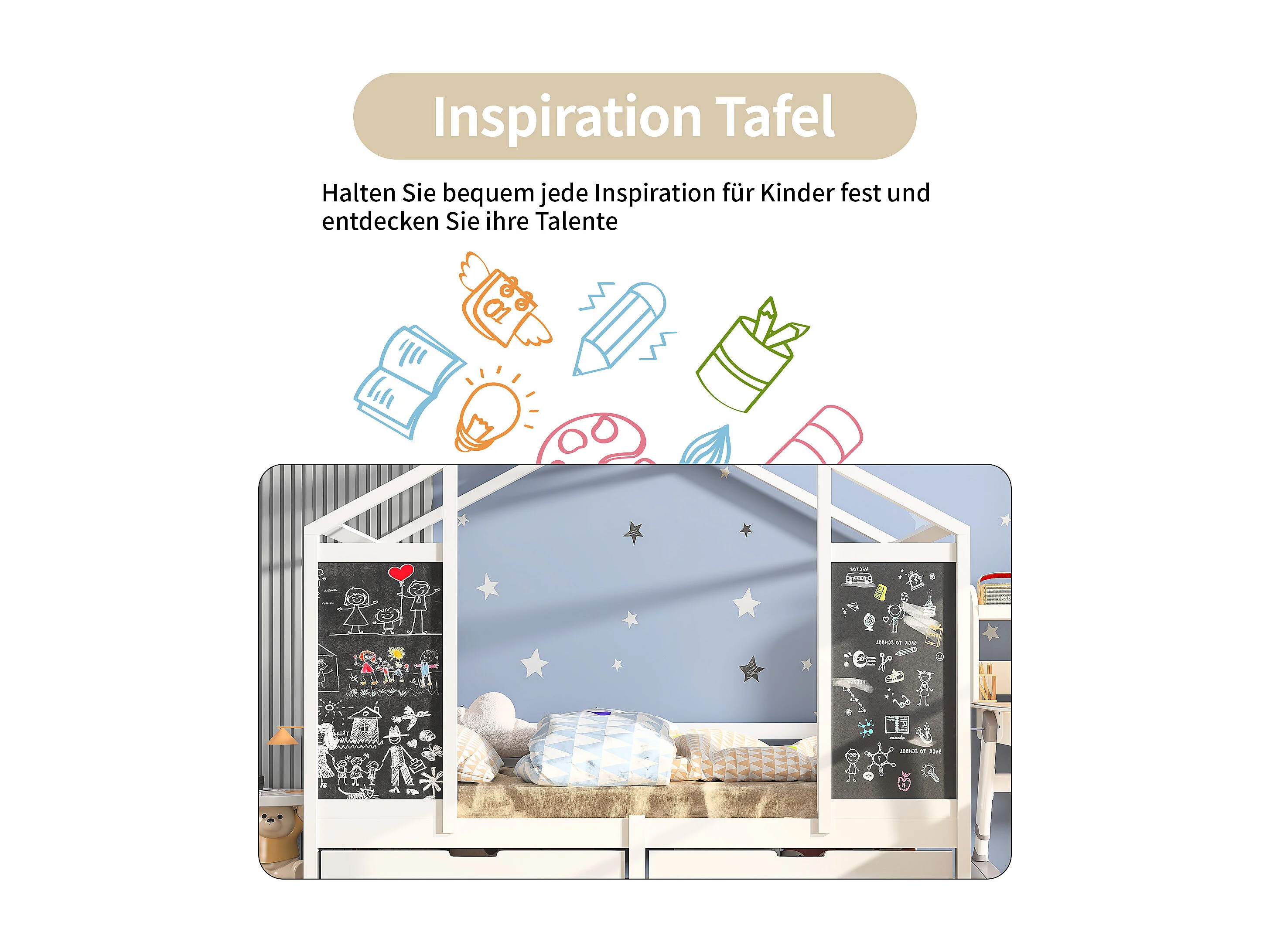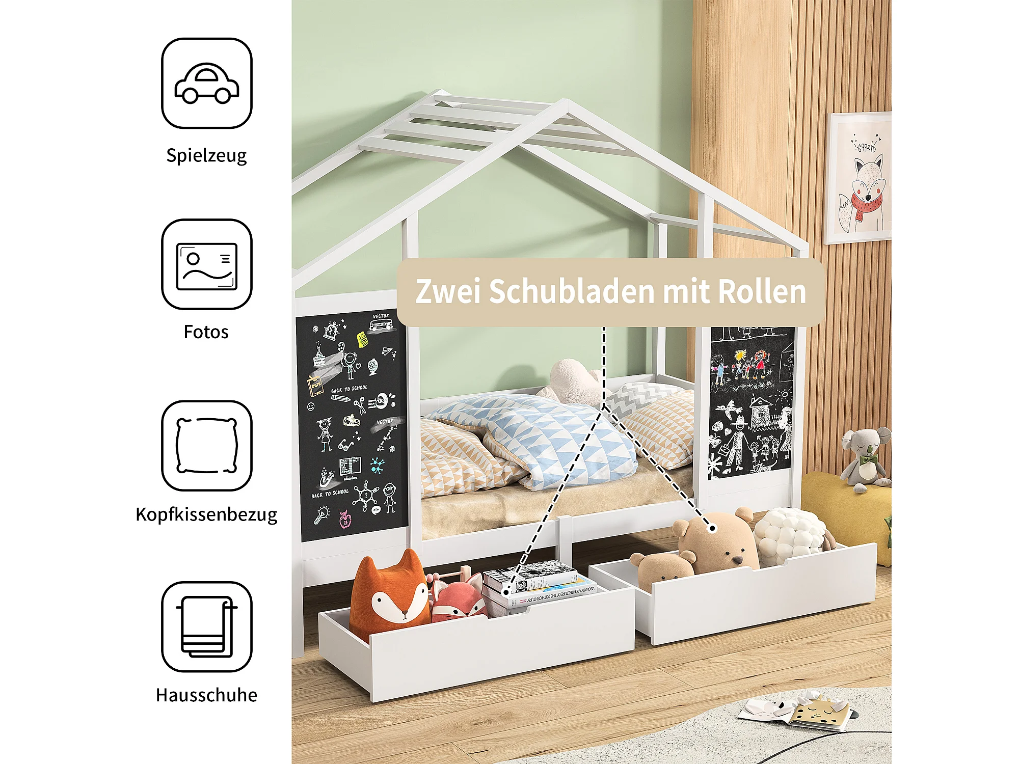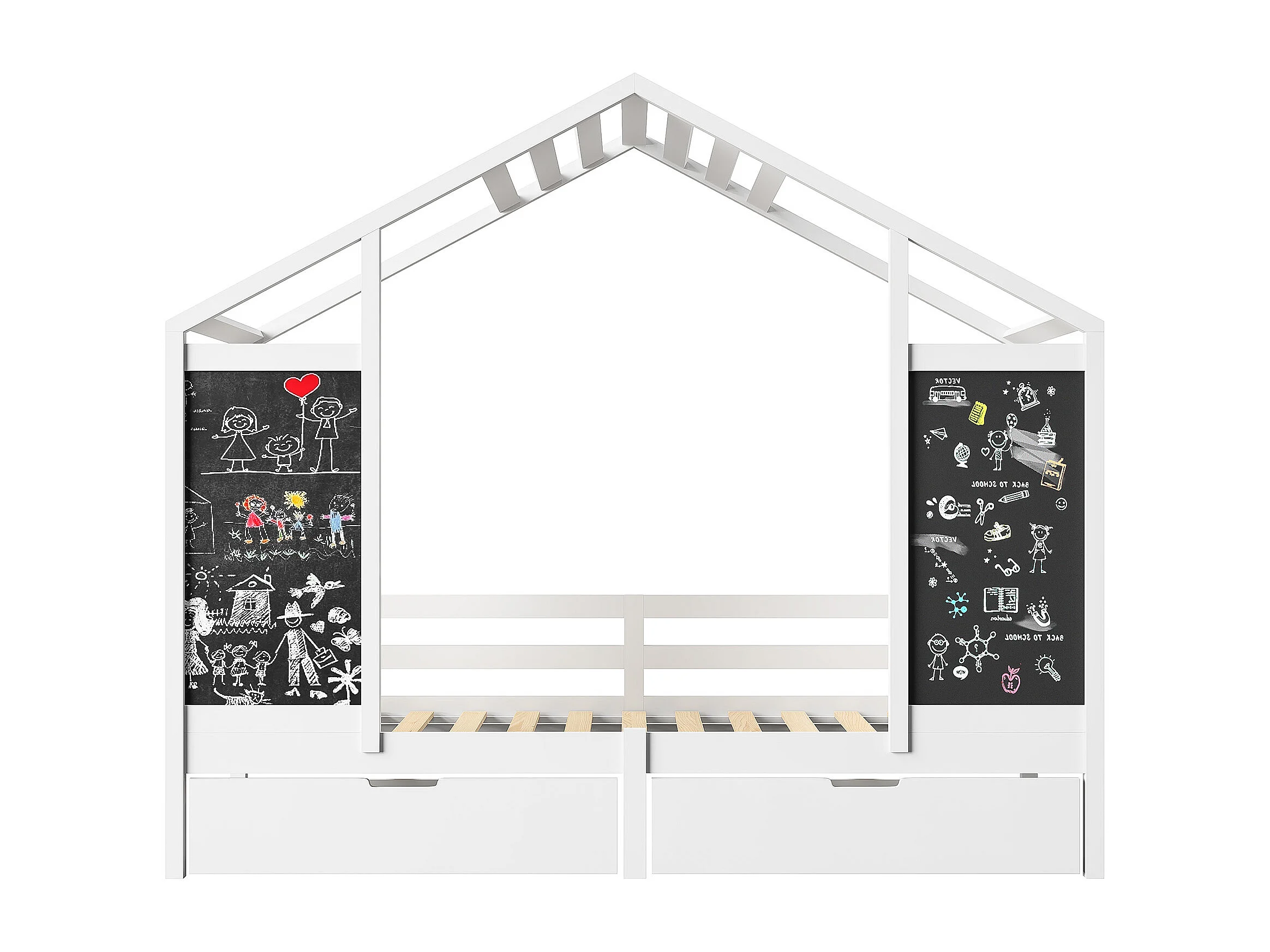 Lit cabane, lit enfant, lit simple, 90x200cm, cadre de lit avec 2 tableaux noirs, 2 tiroirs sous le lit, rangements, blanc(sans Matelas)