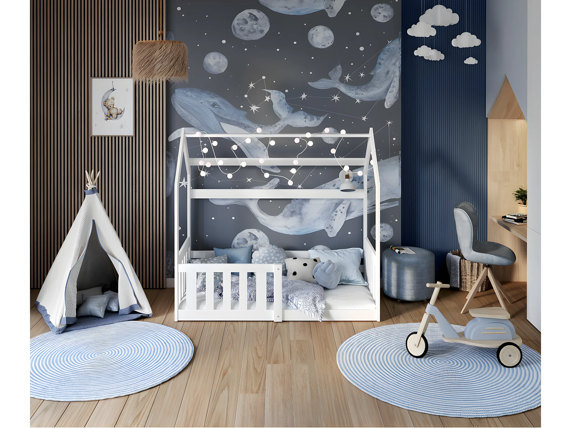 Lit Cabane LOFFY - Bois massif - 80x160 - Avec Sommier Blanc Livré avec sommiers