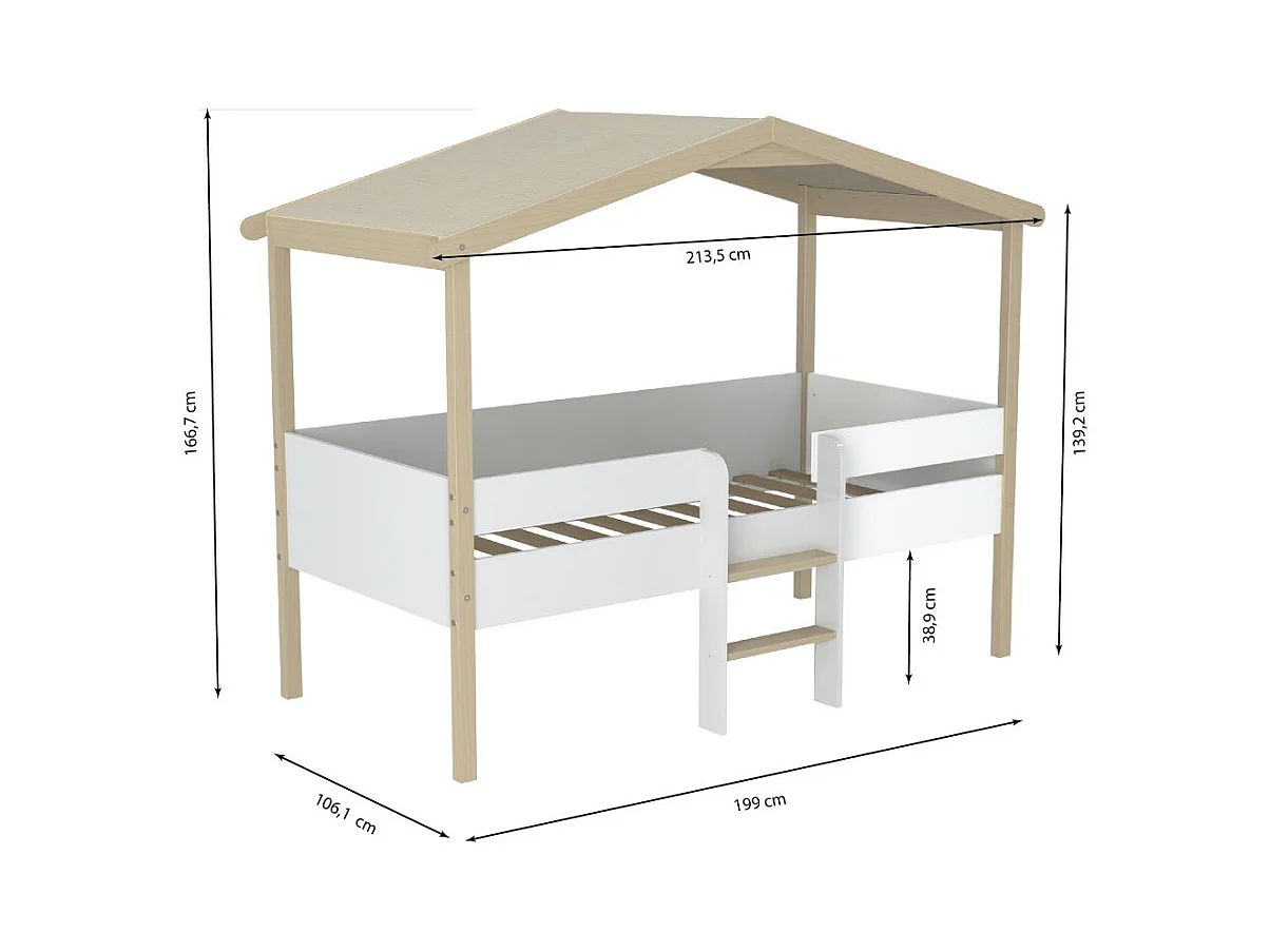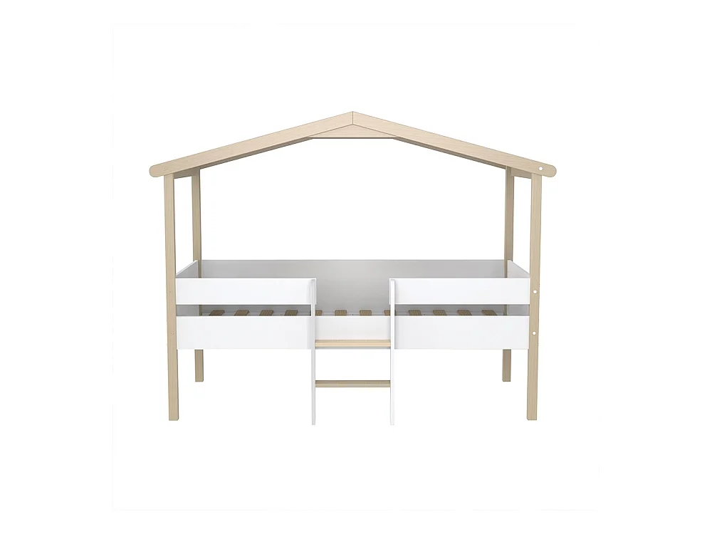 Lit cabane PILOTI 90x190 + 1sommier / Blanc et naturel