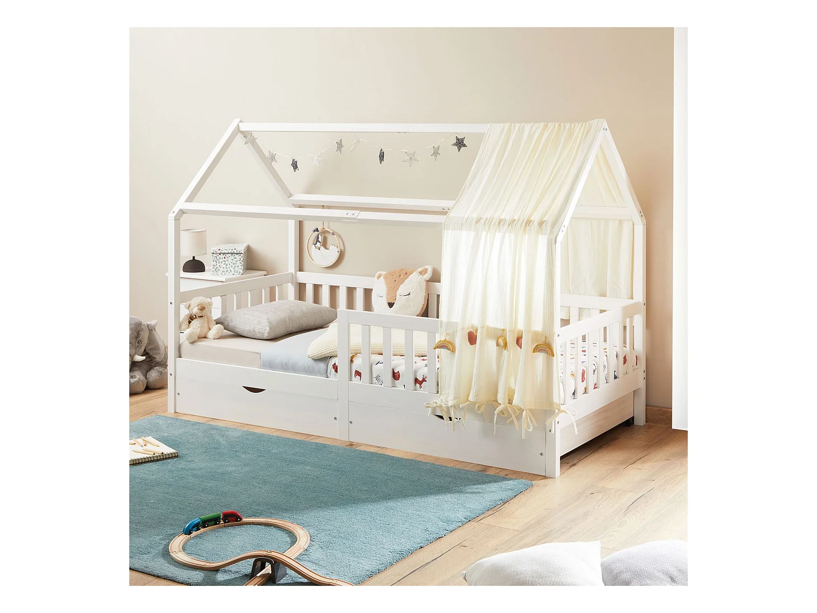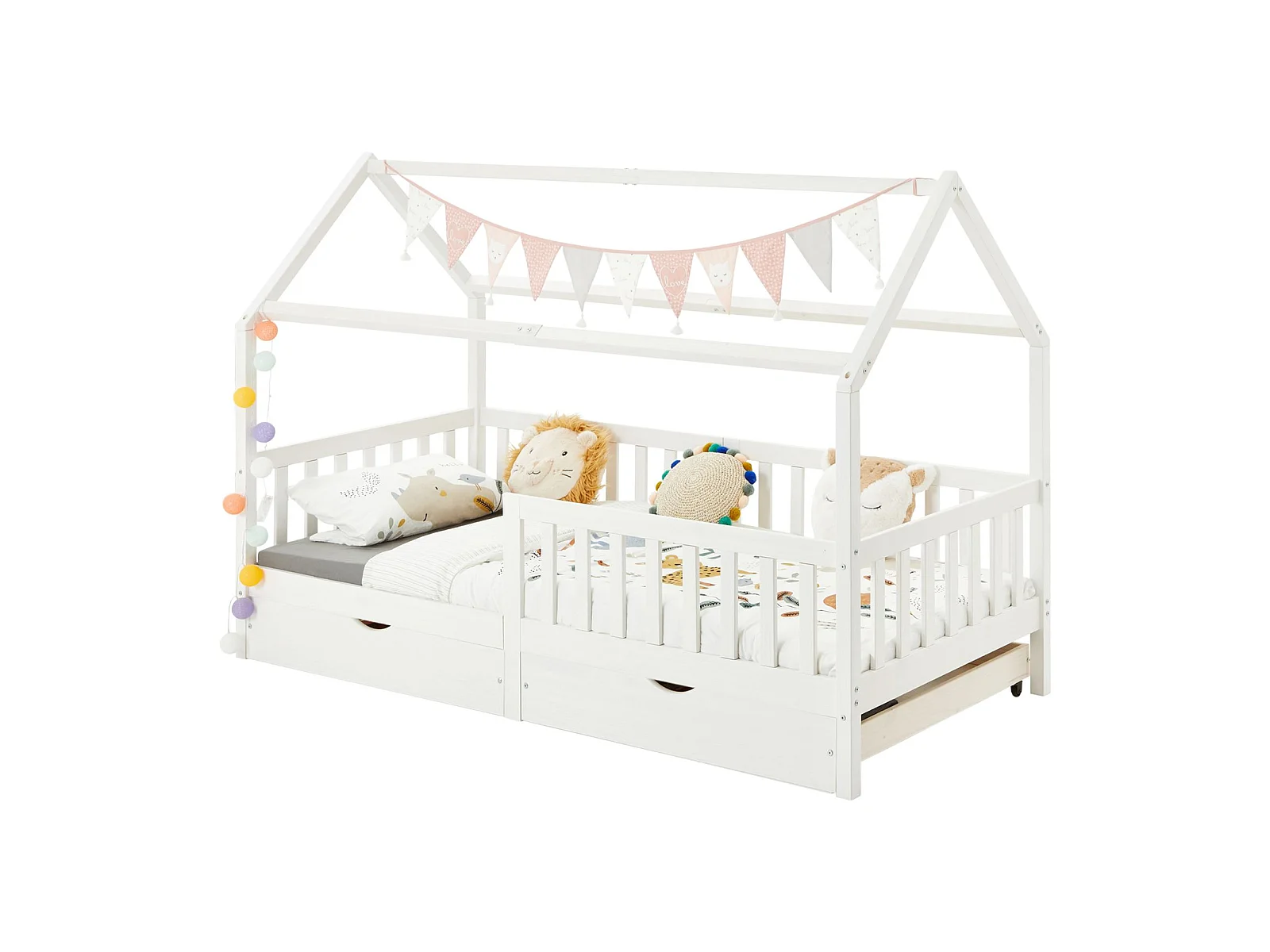 Lit cabane NUNA lit enfant simple montessori en bois 90 x 200 cm, avec rangement 2 tiroirs, en pin massif lasuré blanc