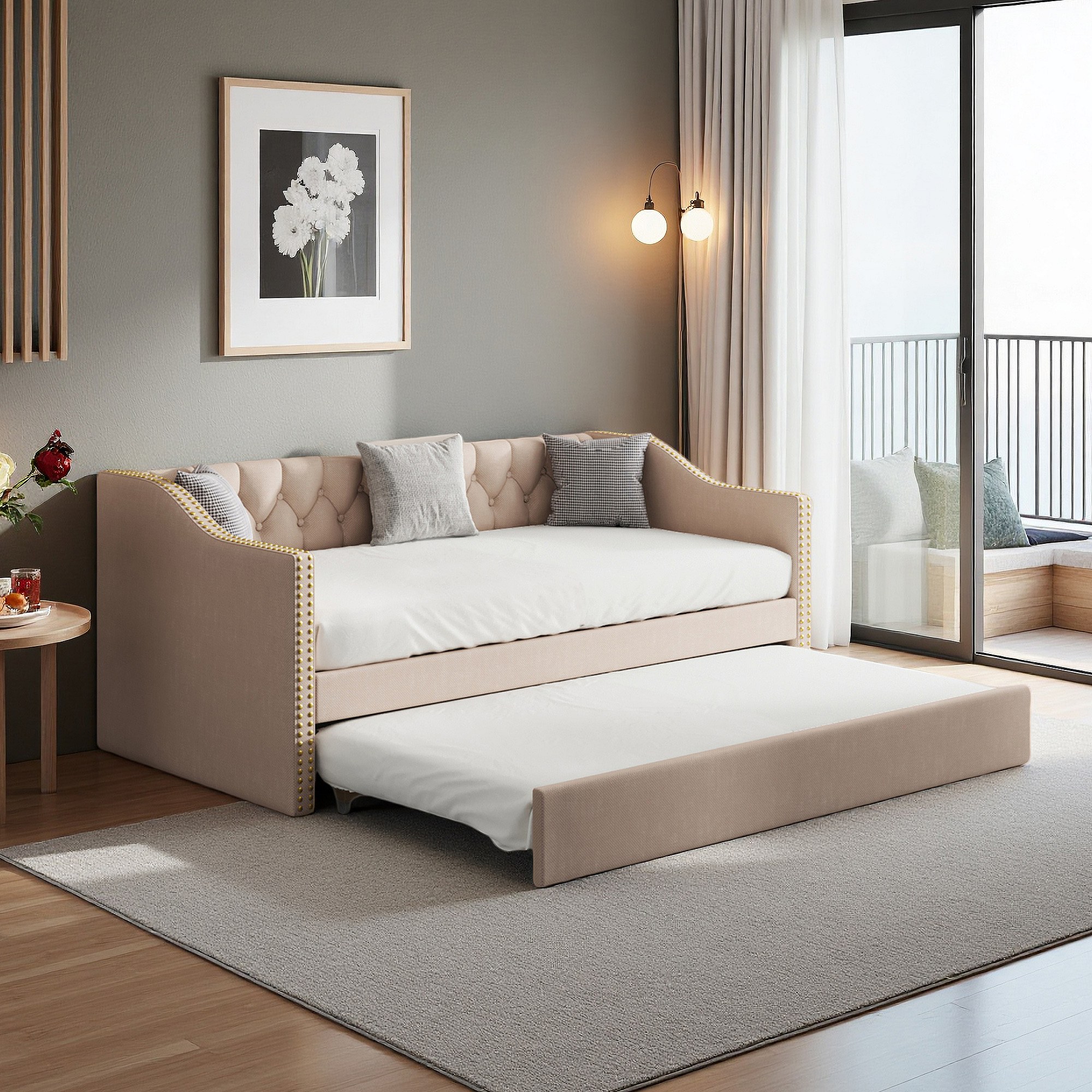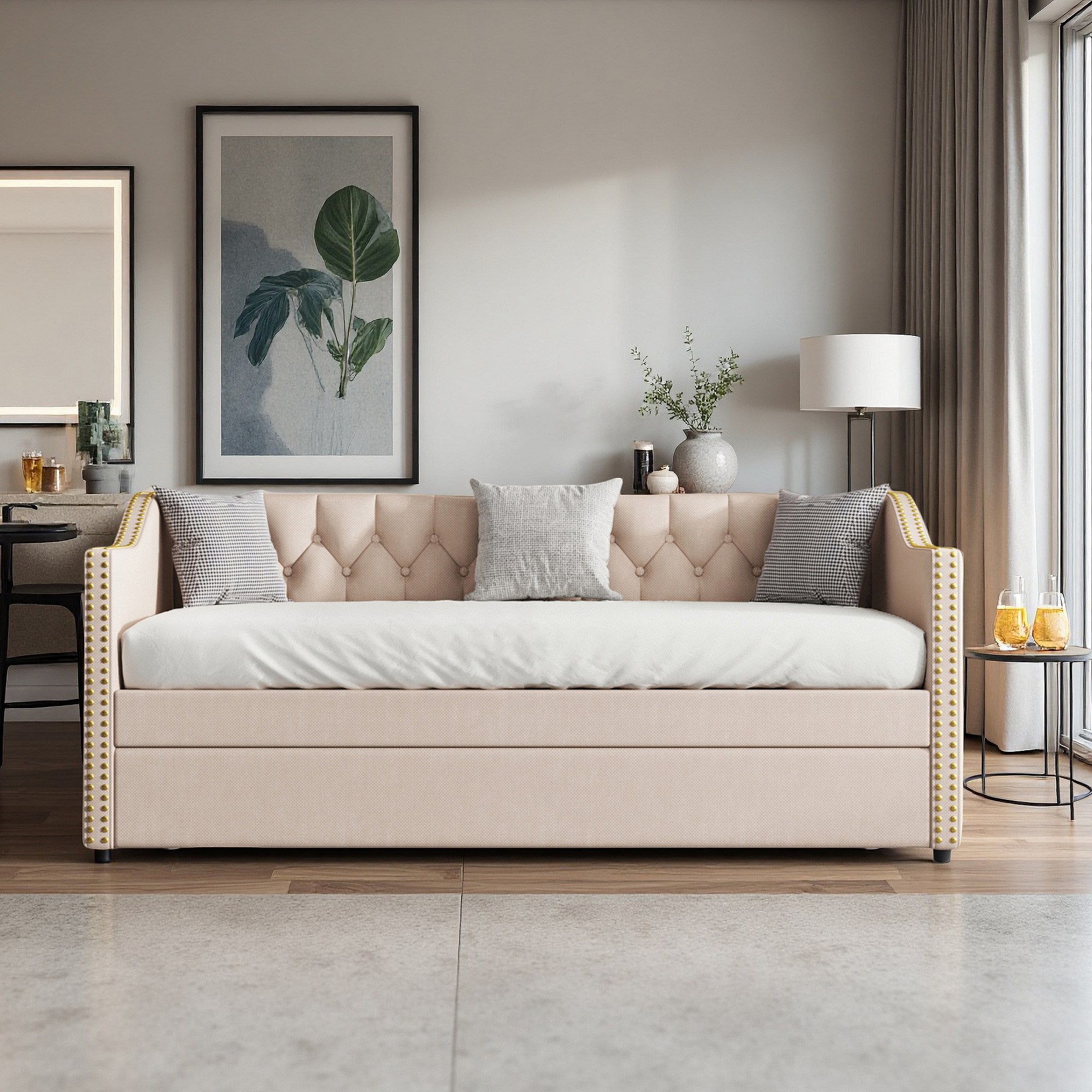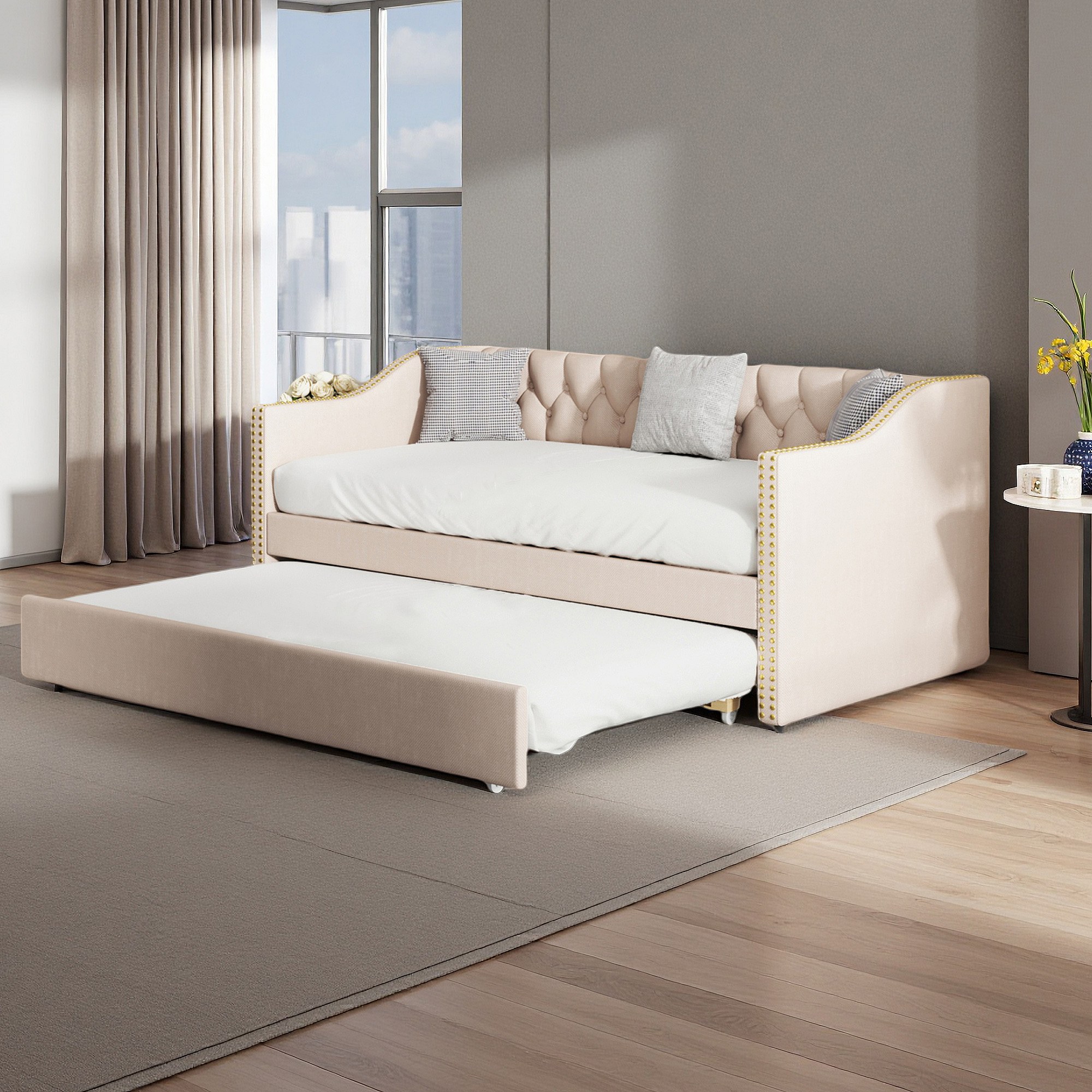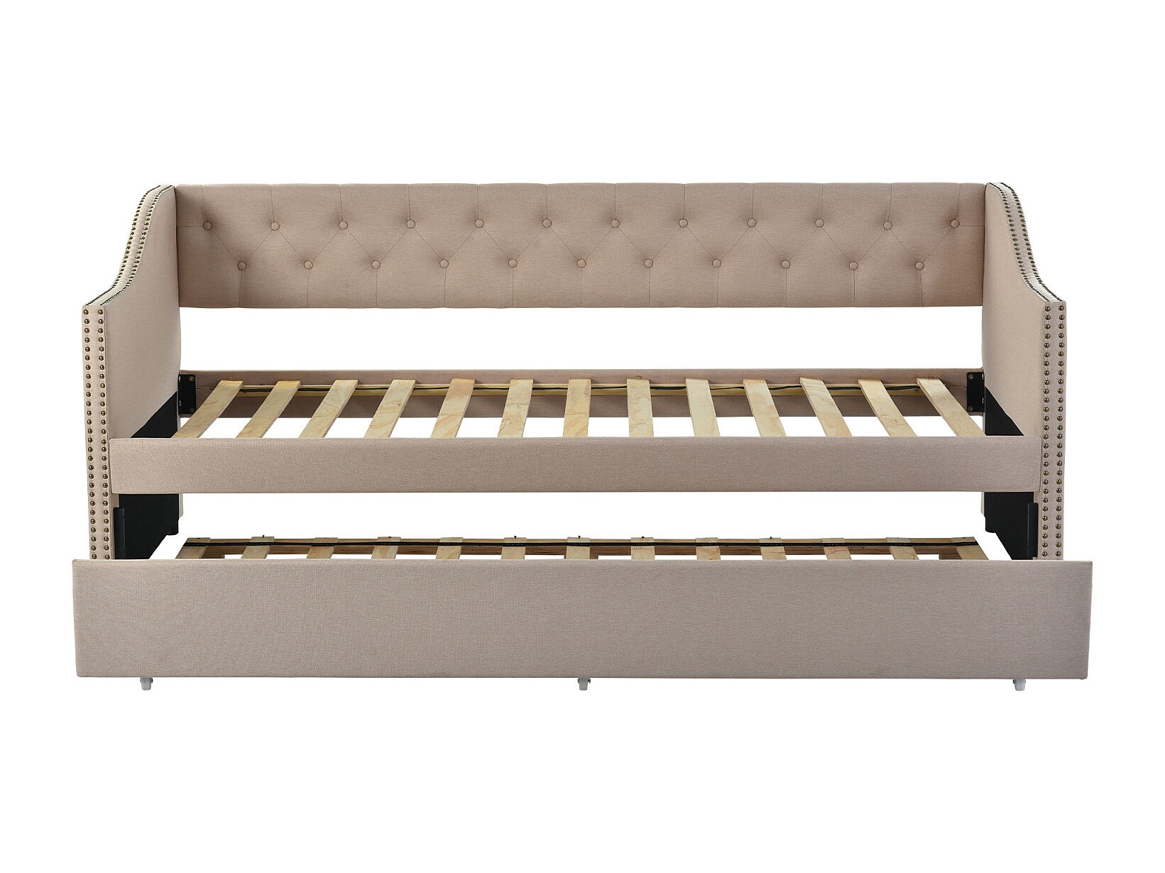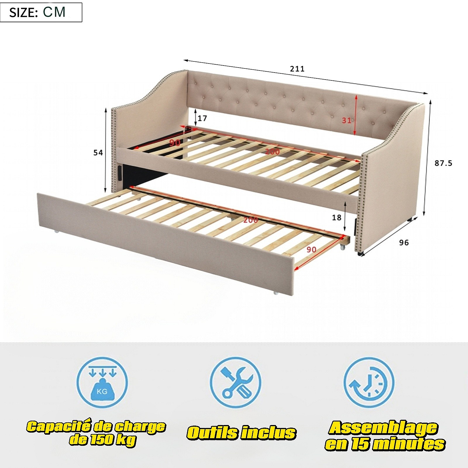 Lit canapé 90x200 cm avec LED et USB - lit adulte 90x200 cm gigogne - cadre de lit double 90x200 cm avec sommier à lattes - tissu en lin - beige