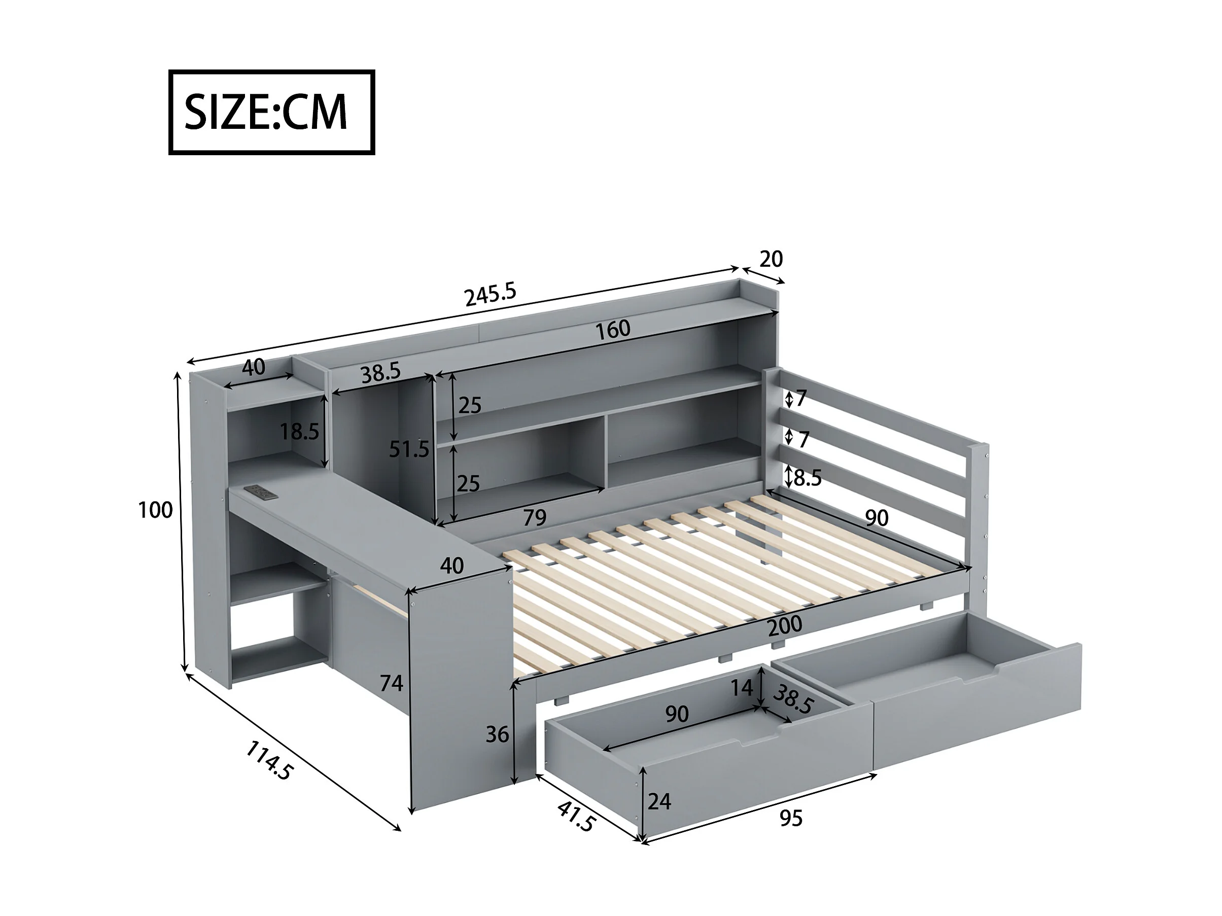 Lit canapé 90x200 cm en bois massif, avec bureau, étagères, prises et 2 grands rangements, multifonction, gris
