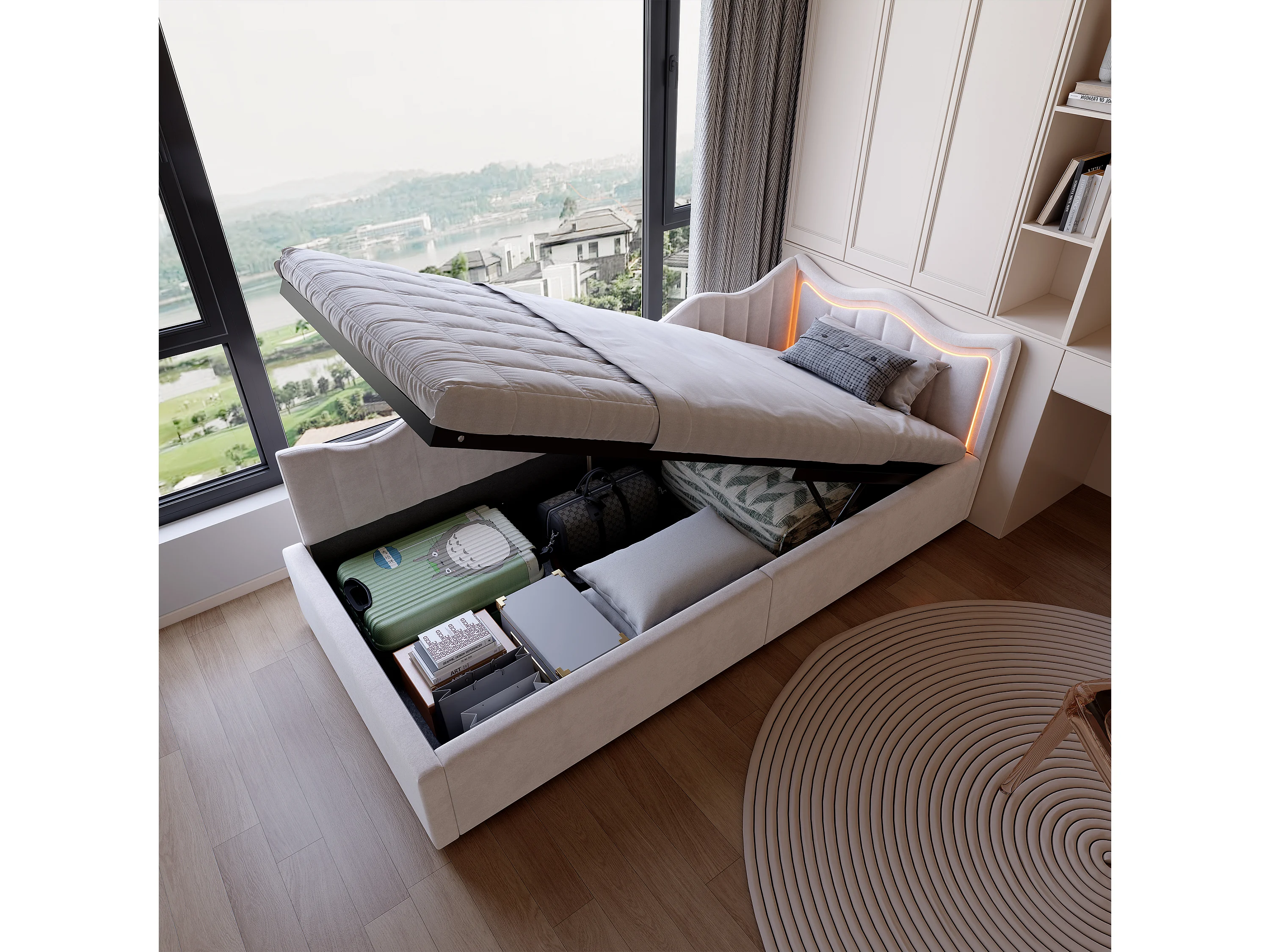Lit canapé enfant 90×200 cm avec coffre de rangement et LED multicolores – Beige en tissu peluche
