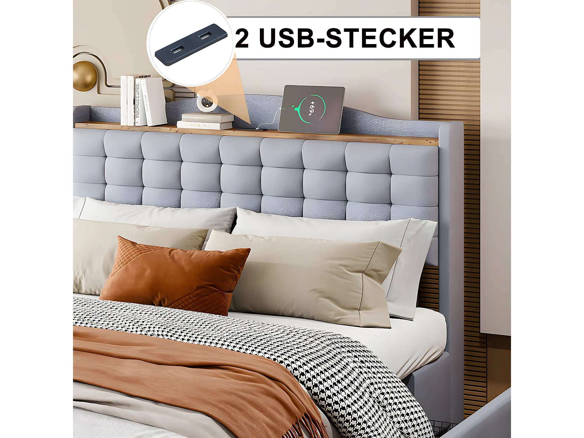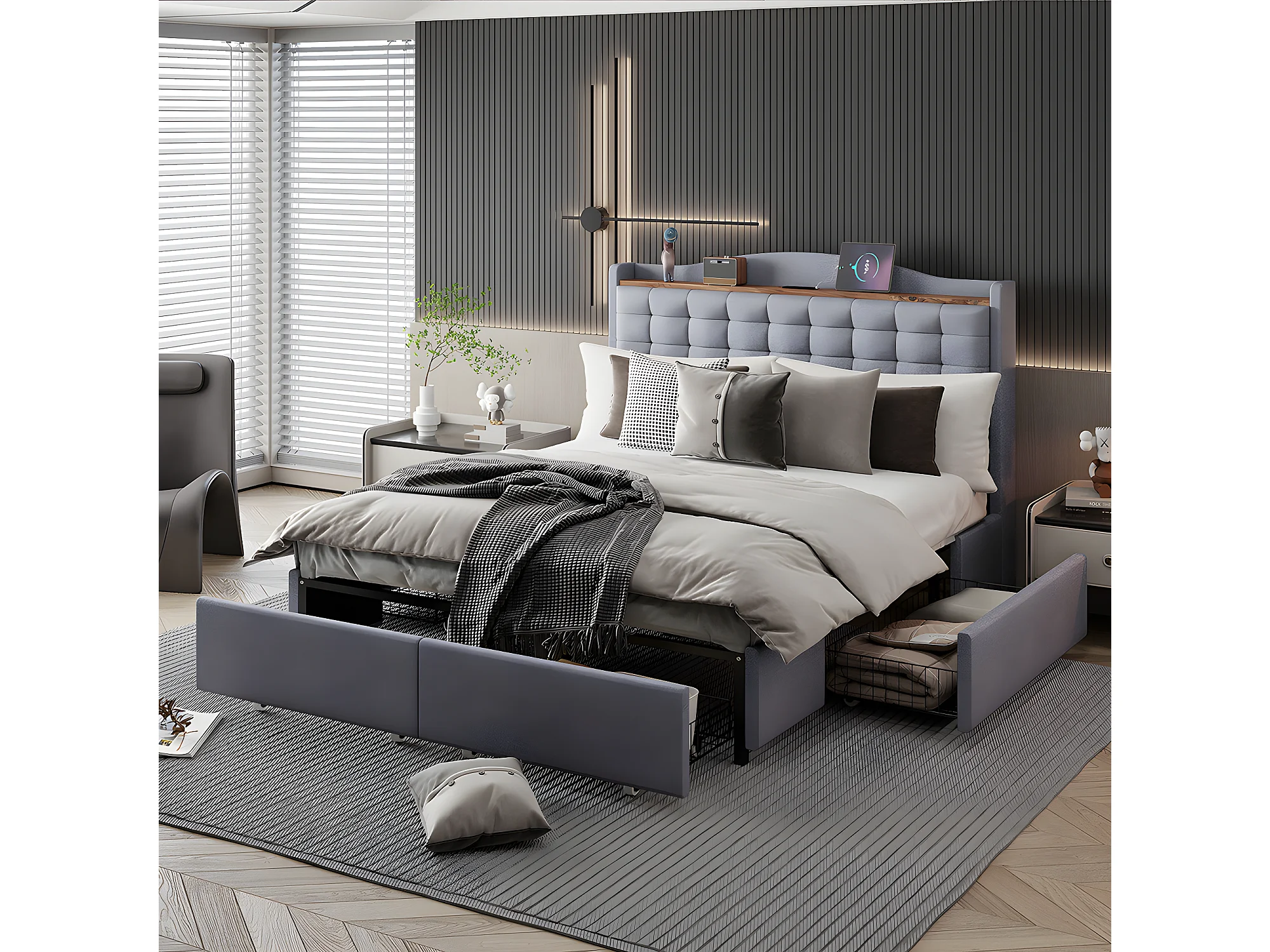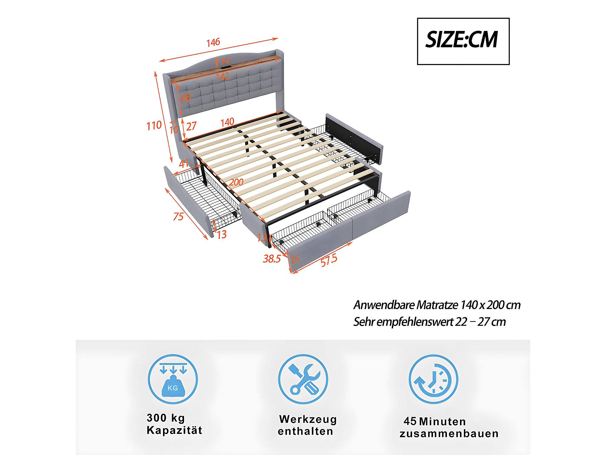Lit capitonné 140*200 cm, table de nuit avec prise de charge USB et tablette, lit double plat avec 4 tiroirs, tissu lin gris