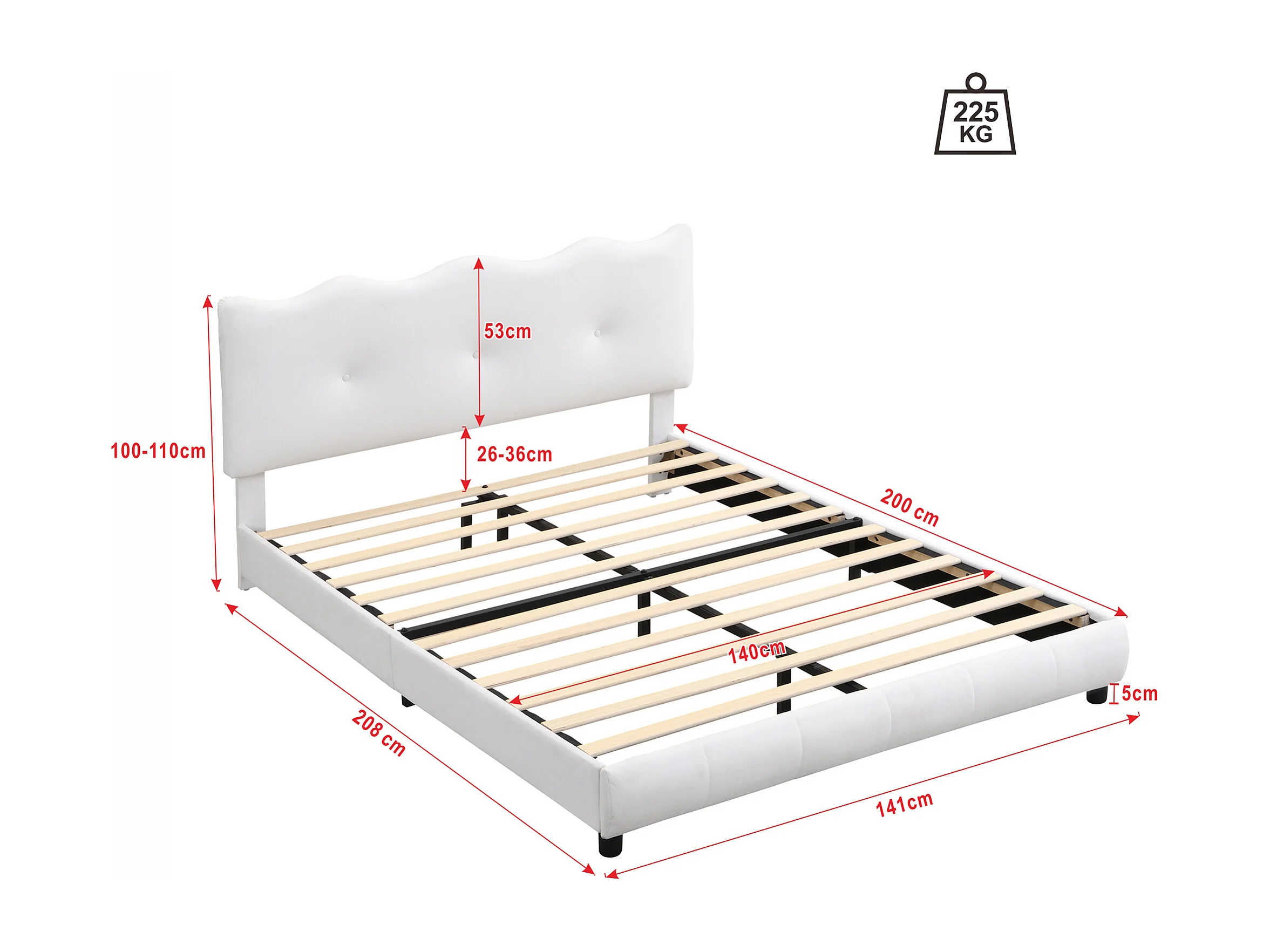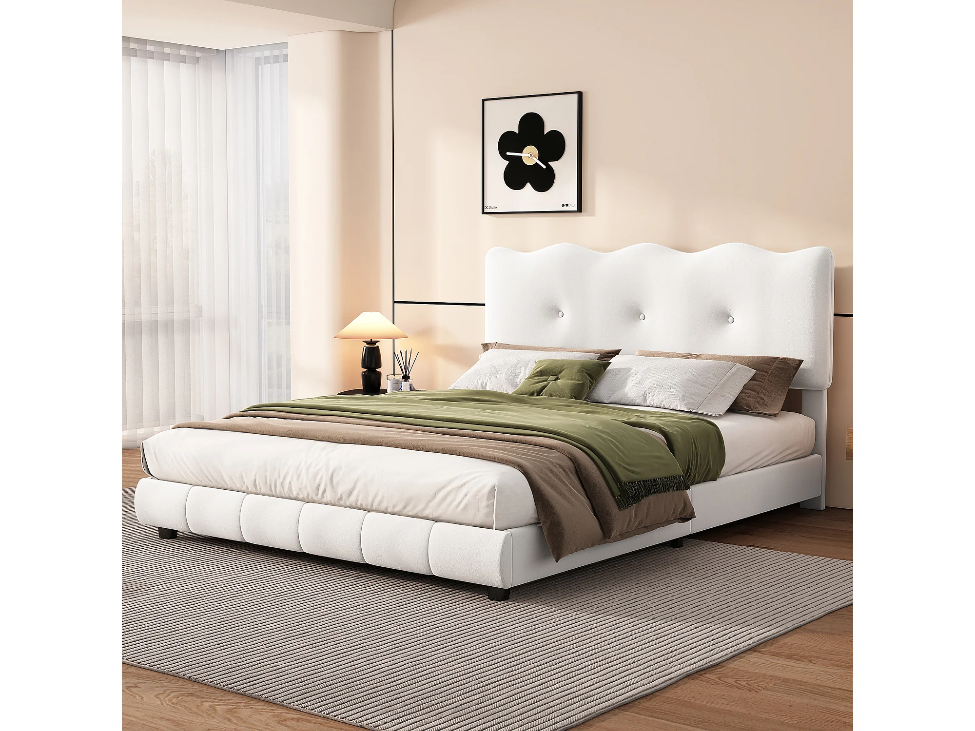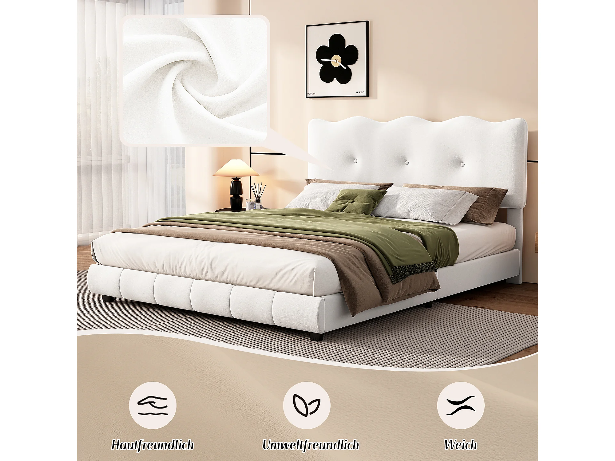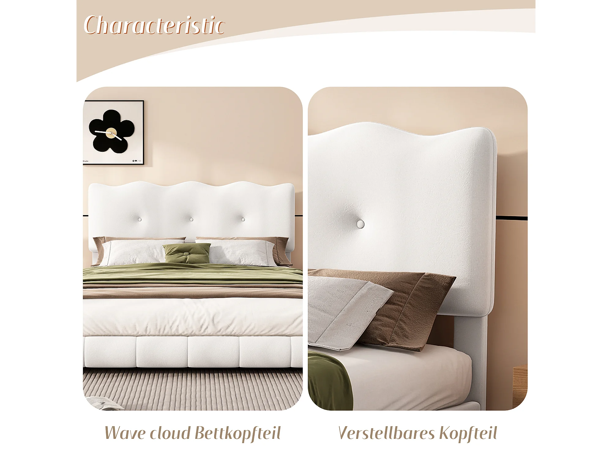 Lit capitonné, 140 x 200 cm, lit avec sommier à lattes (sans matelas), tête de lit vague et nuage, tête de lit réglable, velours, minimaliste, blanc