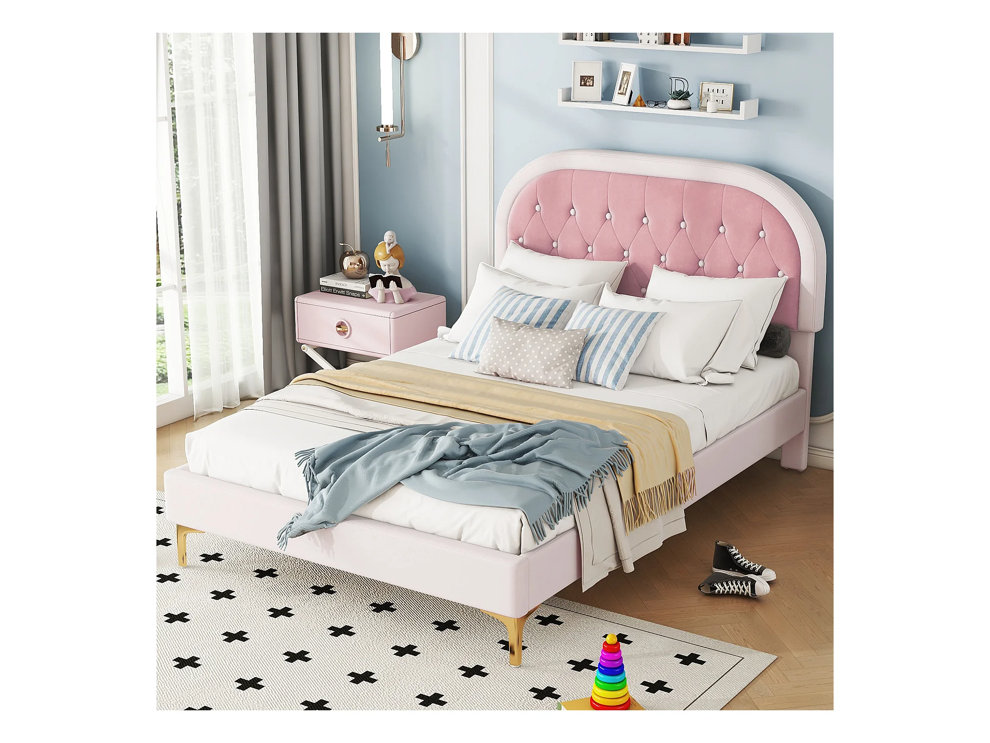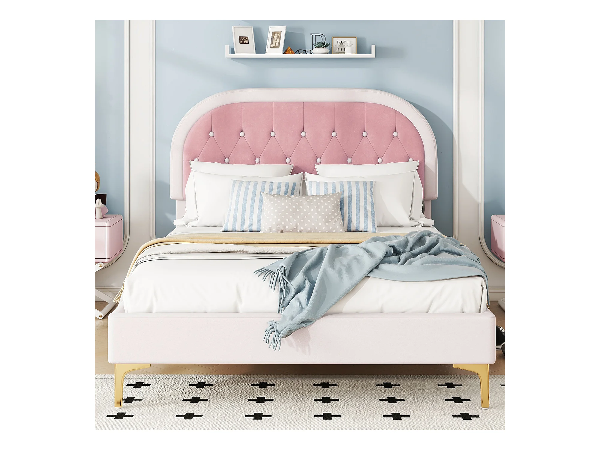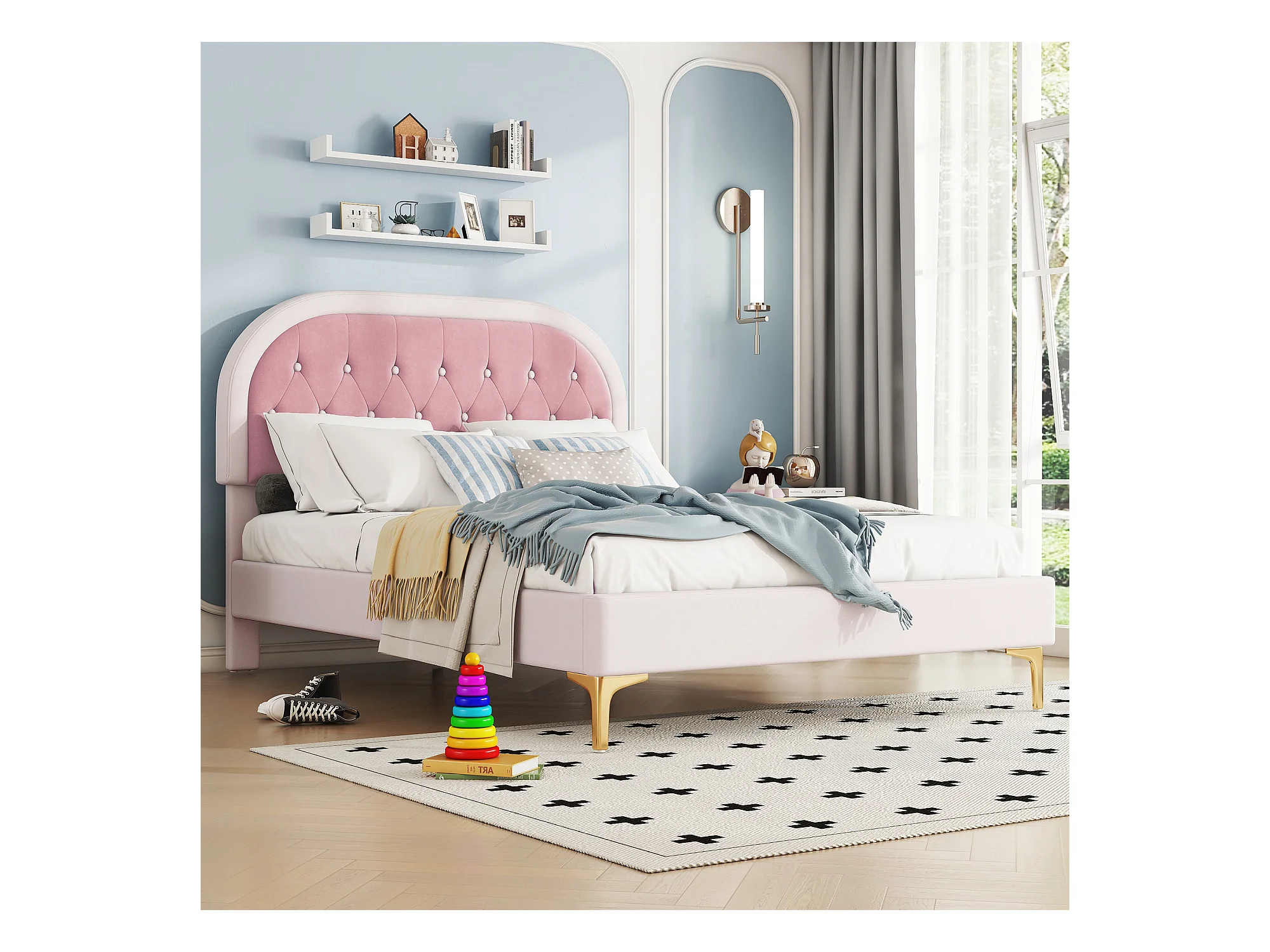Lit capitonné 140 x 200cm avec tête de lit courbée - pieds en métal - velours - rose (sans matelas)