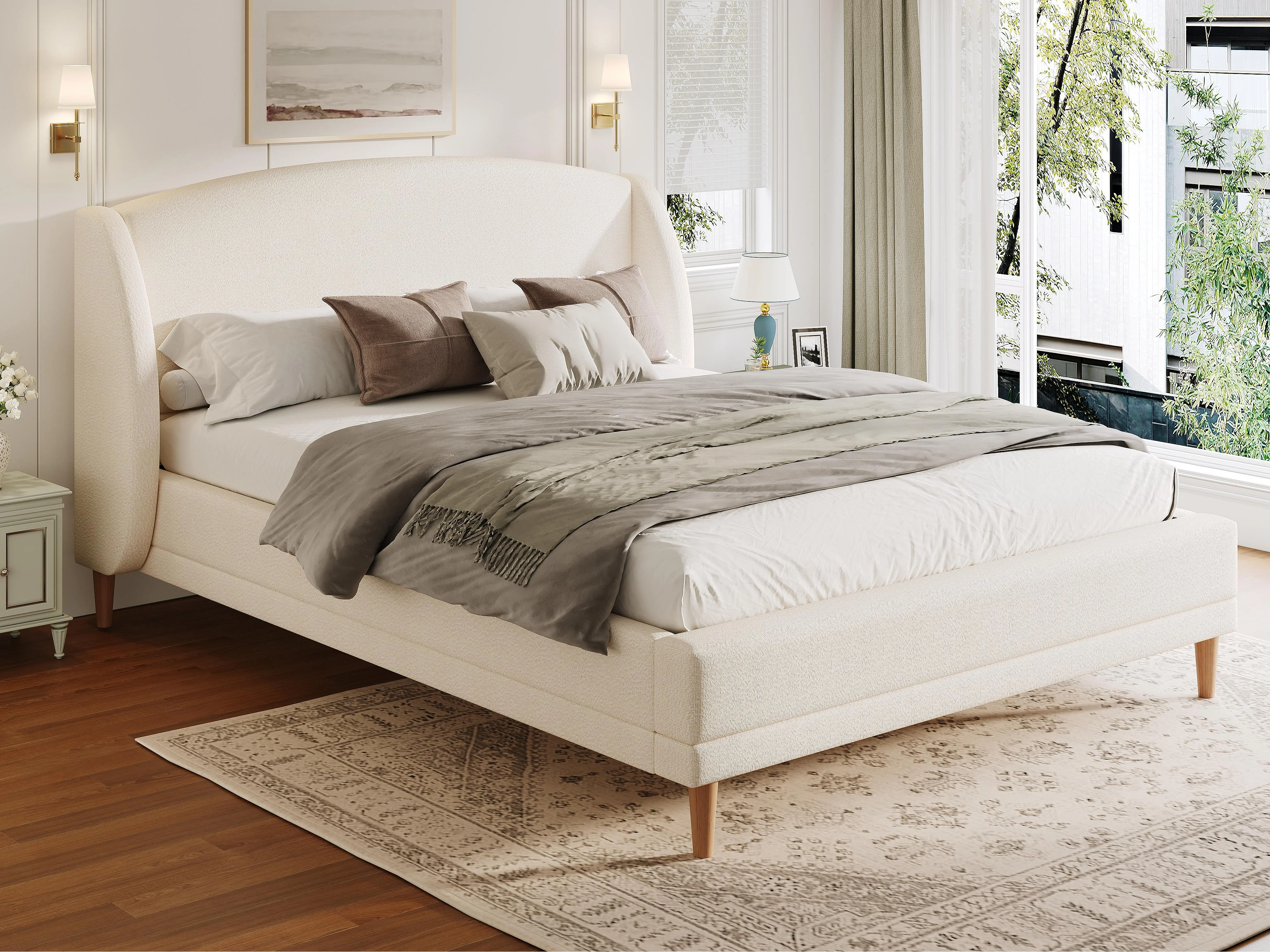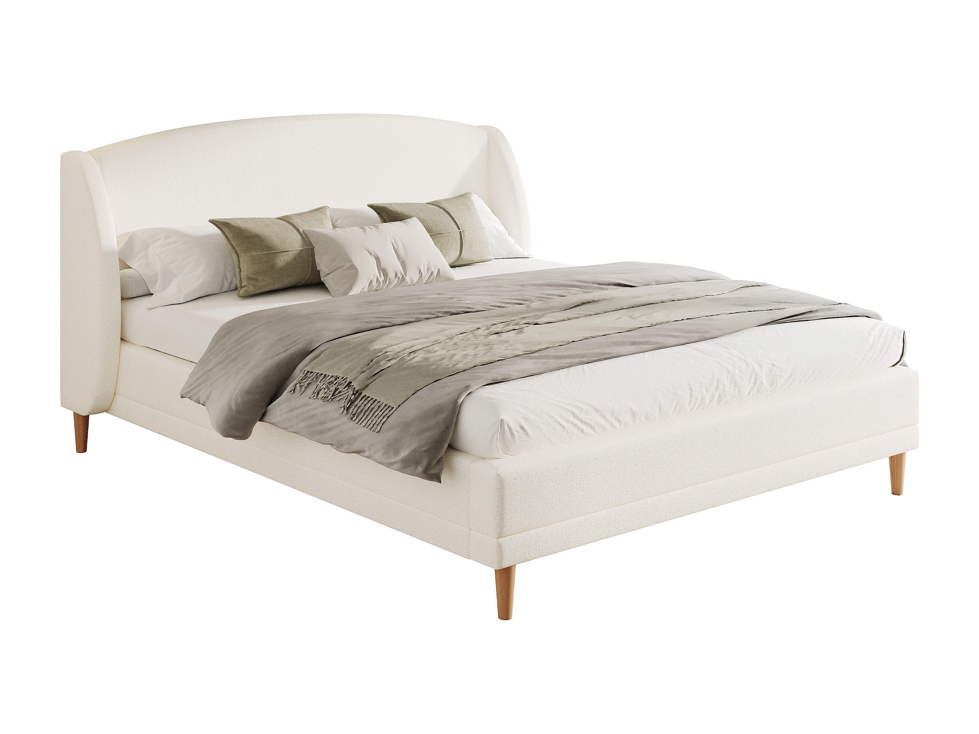 Lit capitonné 140x190 cm - Pieds en bois d'hévéa - avec sommier à lattes - Tissu bouclé - Blanc (sans matelas)