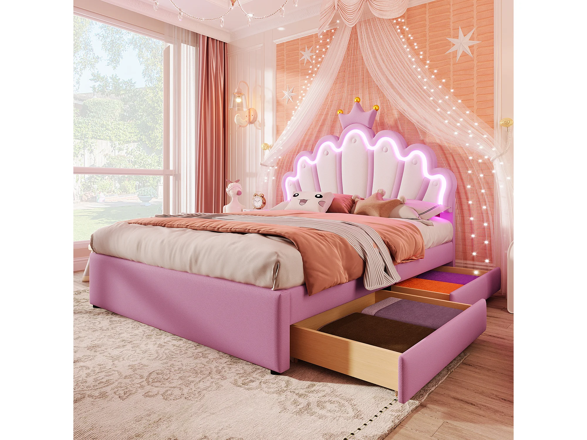 Lit capitonné 140x200cm, éclairage d'ambiance télécommandé, 2 tiroirs, tête de lit réglable, lit princesse, PU, ​​rose, sans matelas