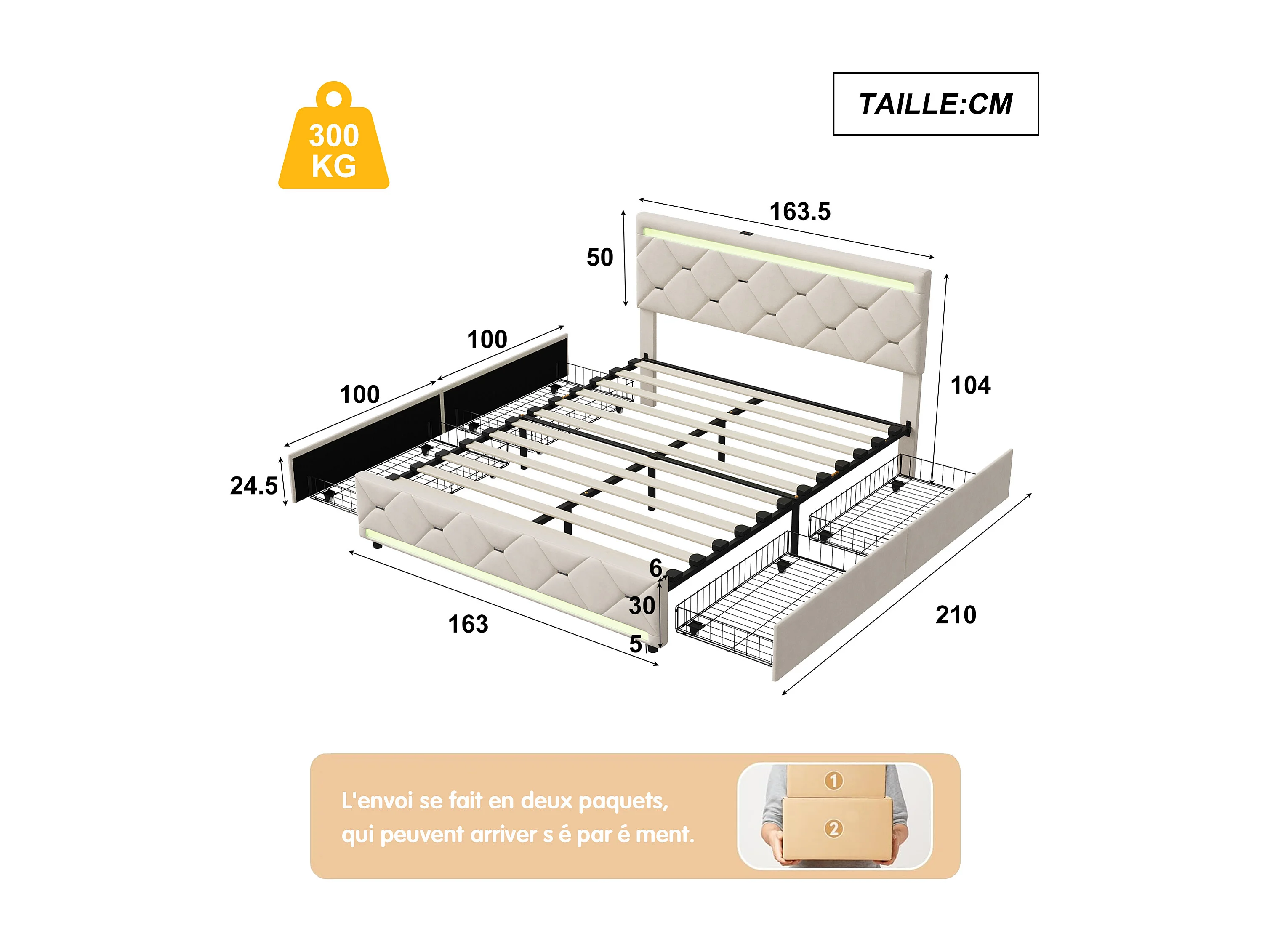 Lit capitonné 160 x 200 cm avec 4 tiroirs - tête de lit avec LED et ports USB - sommier à lattes - velours - blanc cassé