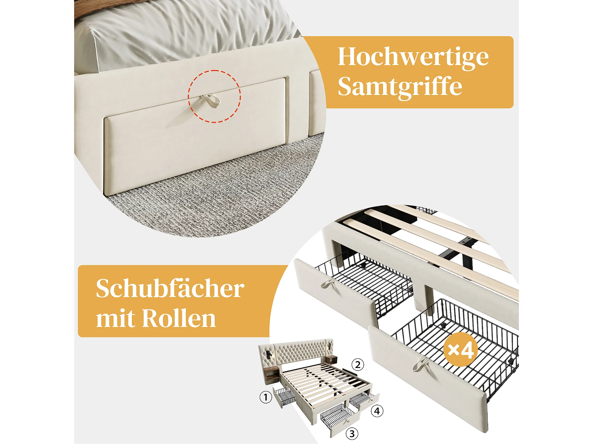 Lit capitonné 160 x 200 cm avec tête de lit et 2 tables de chevet - lampe de lecture et 4 tiroirs - Velours - Beige (sans matelas)